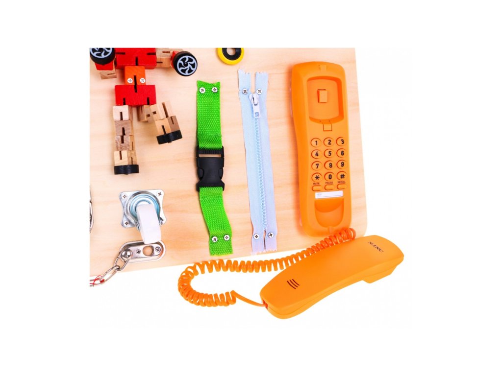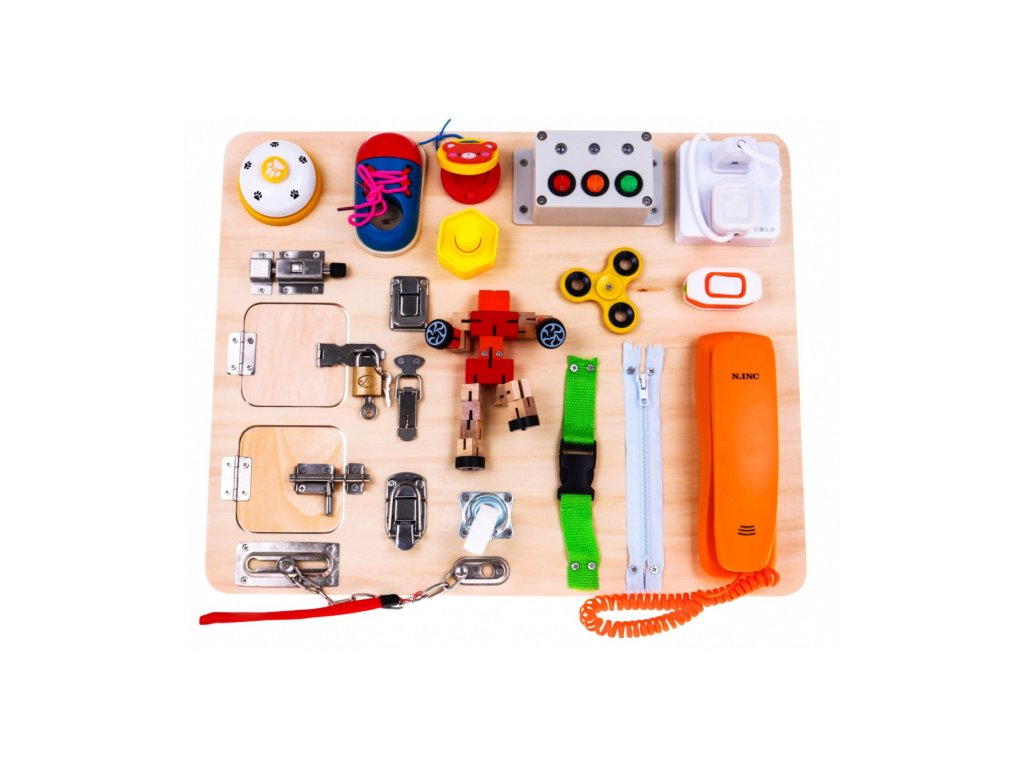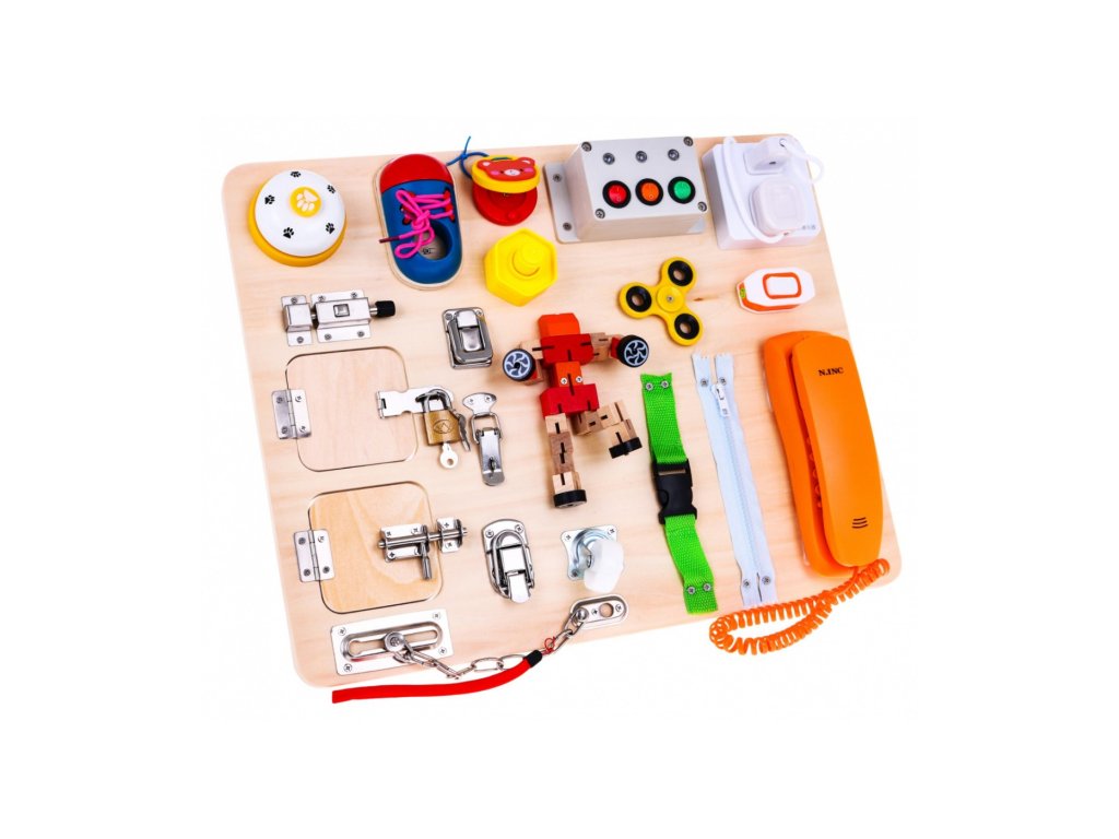 Активна сензорна учебна дъска е многофункционална играчка, предназначена за деца над 3 години. Комплектът включва дъска с прикачени елементи, с които детето се среща в ежедневието. Чрез играта детето развива умения в областта на фината моторика, логическото мислене и анализа на причинно-следствените връзки. Дъската разполага със звукови и светлинни елементи на дистанционното управление. Комплектът се захранва с 2 броя AA батерии, които не са включени в опаковката.