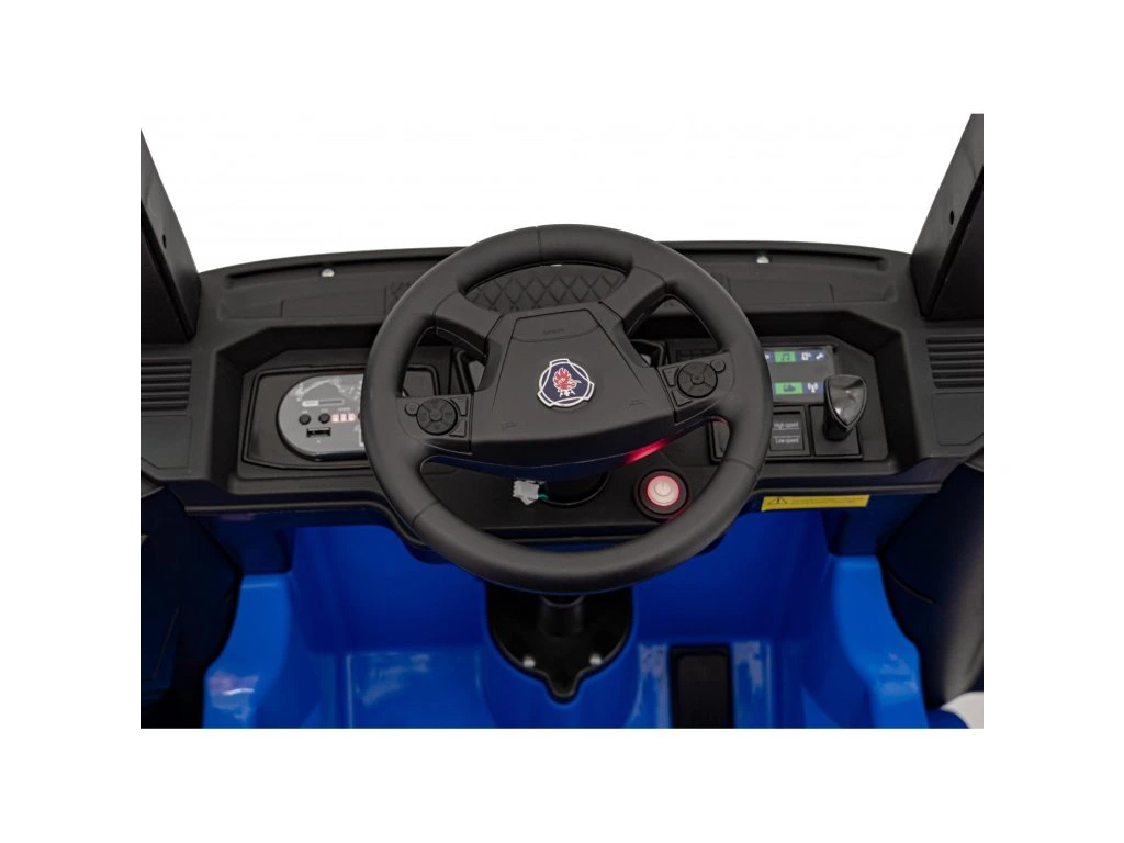 Вътре ви очаква удобно седалка с покритие от еко кожа, снабдена с безопасни колани. Детето може да се забавлява с вградения MP3 плейър с Bluetooth, USB вход и бутони за звукови ефекти и клаксон директно на волана. Не липсват мелодии, реалистични звуци при стартиране на двигателя и индикатор за състоянието на батерията.