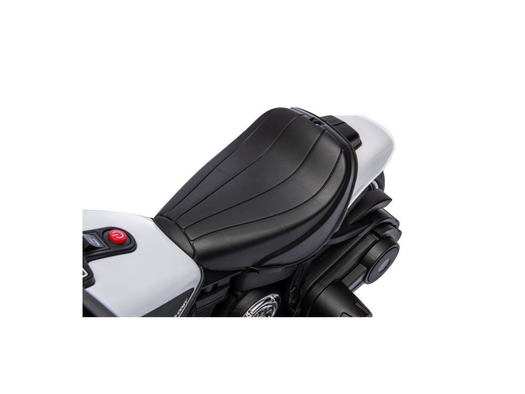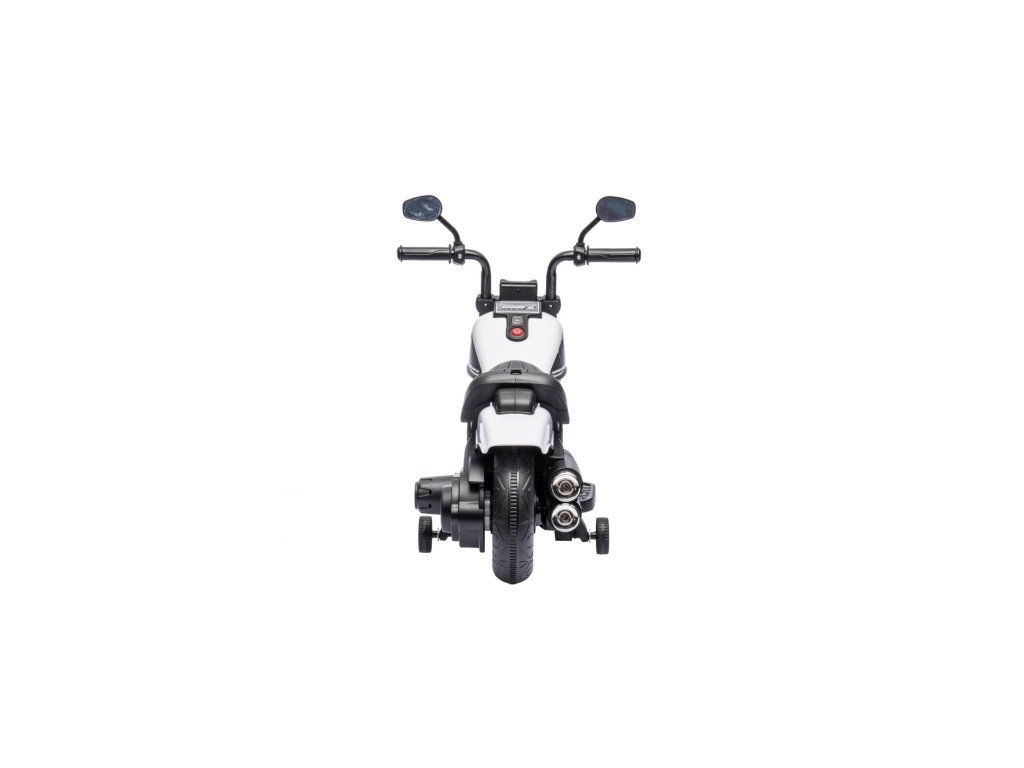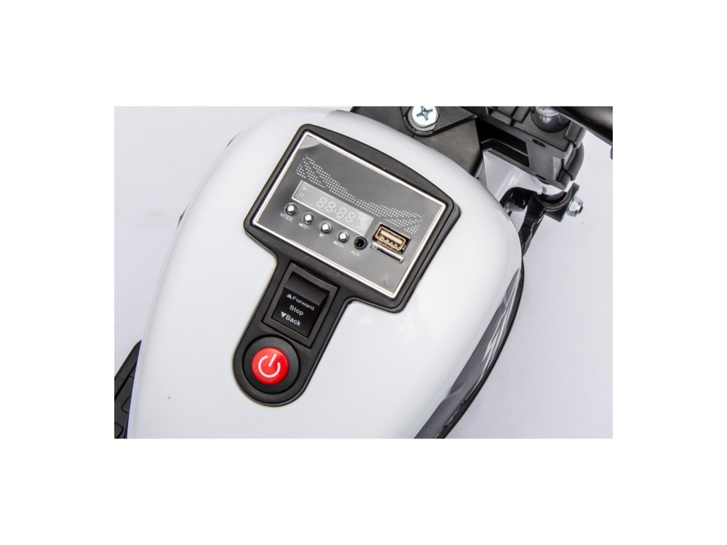 Детският Акумулаторен мотор Chopper Faster бял с богато оборудване и иновативен дизайн. Интериорът на мотора е оборудван с пластмасово седалка, музикална система с Bluetooth, радио, входове за MP3, USB, SD, AUX и предварително инсталирана музика. За безопасност през нощта моторът разполага с предни LED светлини.