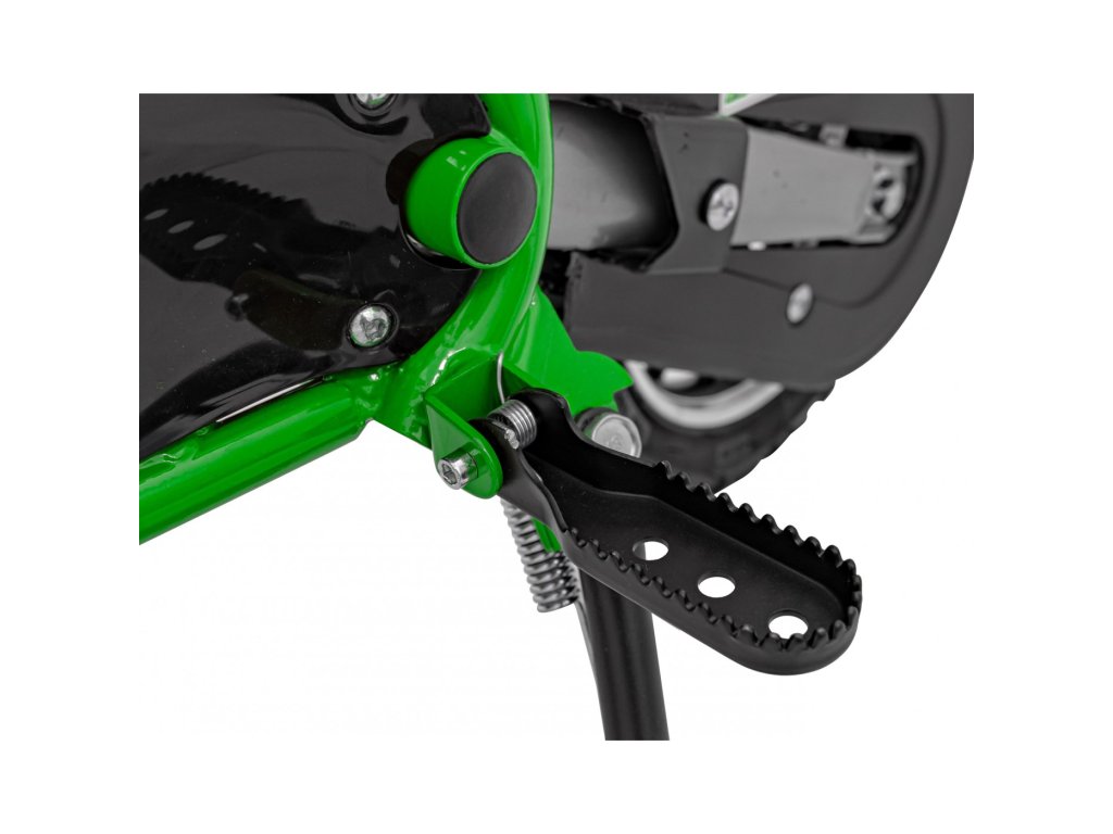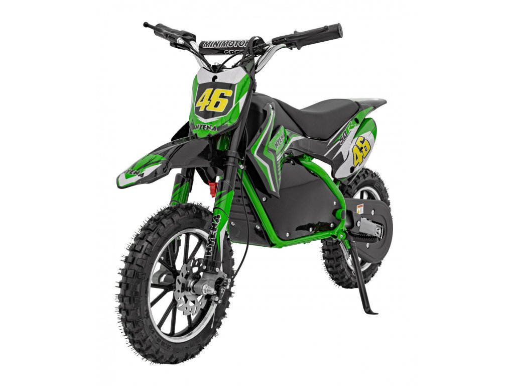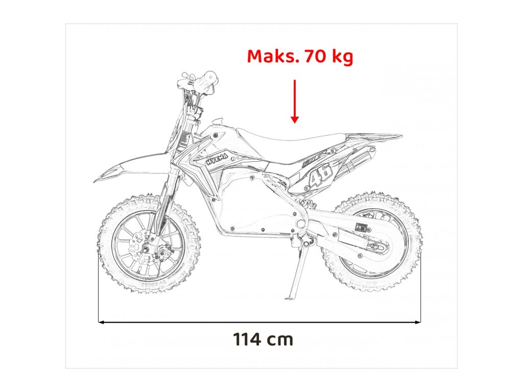 Детски акумулаторен мотор с надуваеми гуми с грапав грайфер и двигател с мощност 500W. В оборудването са включени предни и задни дискови спирачки и меко водоустойчиво седло.