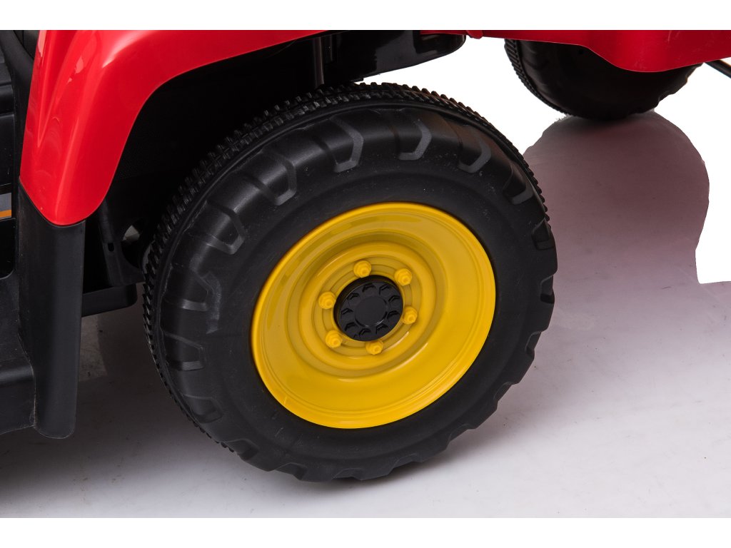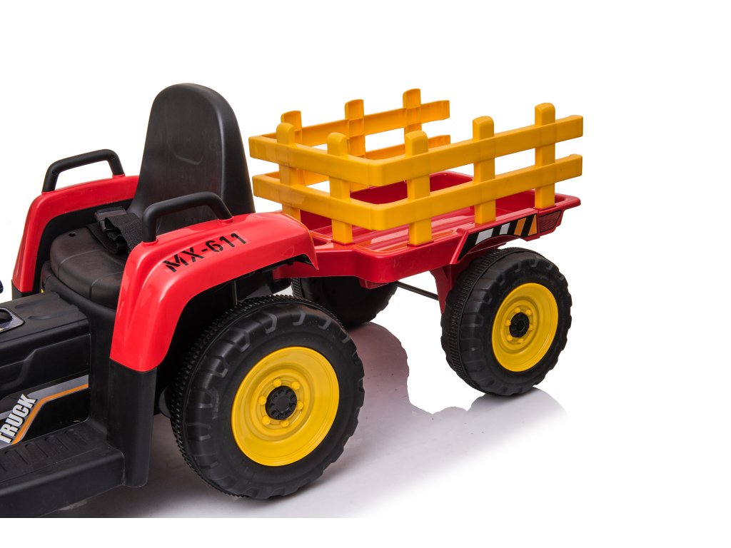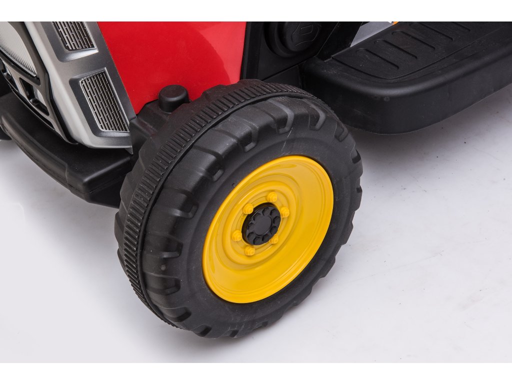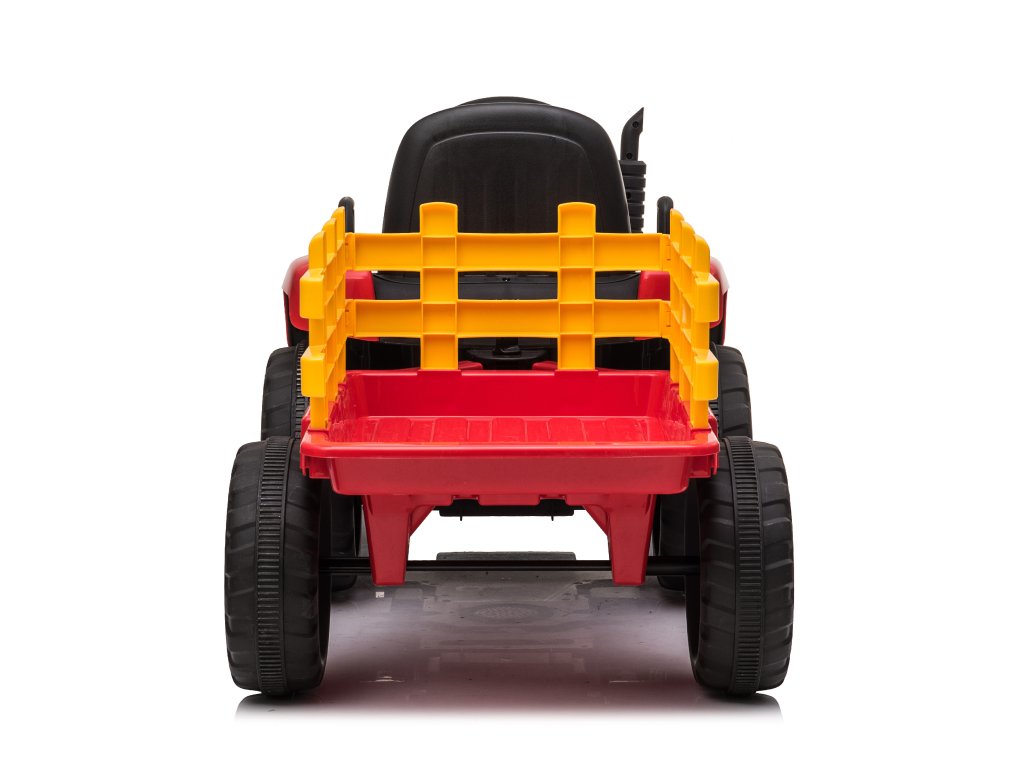 Детският трактор с ремарке изглежда страхотно – уверени сме, че младите водачи ще бъдат на същото мнение. Вътре има черно седалко, срещу него въртящ се волан, контролни бутони и музикален панел с входове за USB, MP3 и Bluetooth. Стартирането на превозното средство става с натискане на бутон START.