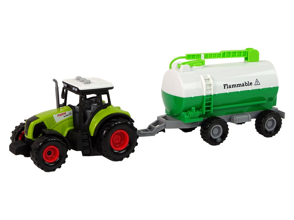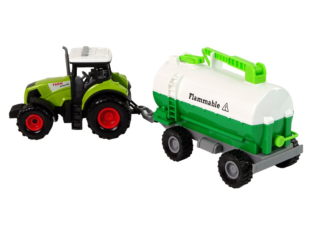 В комплекта е включено цистерненото ремарке, което може да се прикачи към задната част на трактора, в зависимост от това дали детето иска да го използва в играта. Ремаркето има зелени елементи, които могат да се отварят или повдигат нагоре.