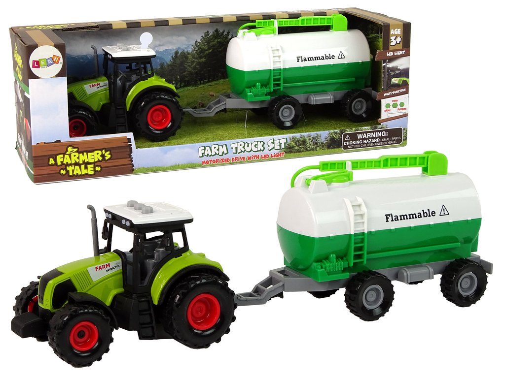 Играчката е предимно в зелено – цвят, който асоциираме с този тип превозни средства. В комплекта е включен аукмулаторен трактор с цистернен ремарке, който допринася за разнообразието в играта. Тракторът разполага с функция за движение и издава характерни звукoве.