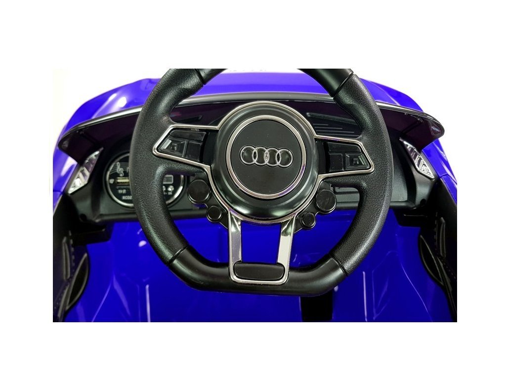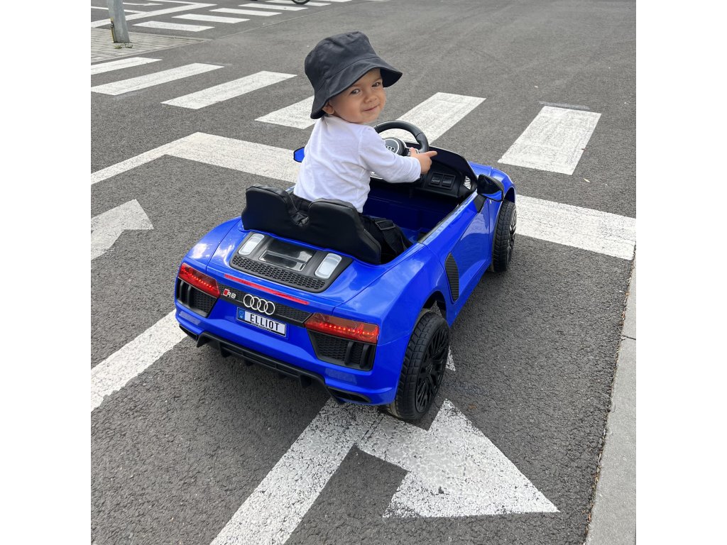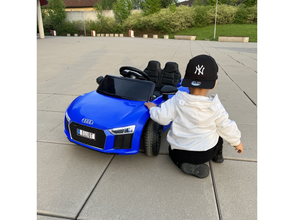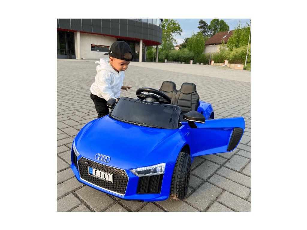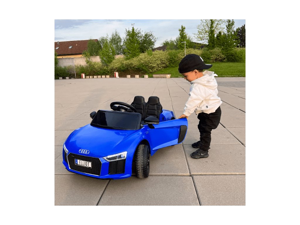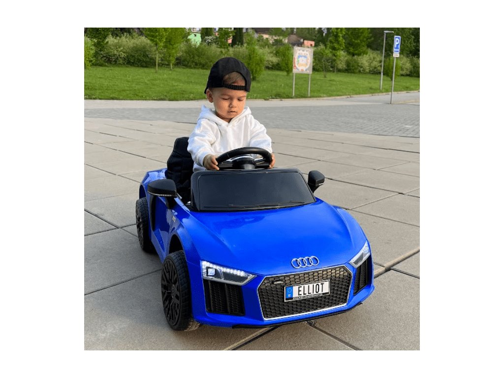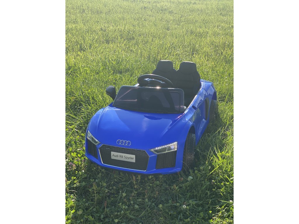Детска Акумулаторна кола Audi R8 Spyder синя с меки пяна EVA гуми, които осигуряват тиха и плавна езда, адаптираща се към различни терени. Детето се настанява в удобно оформено сидение от еко кожа, а за безопасността се грижат предпазни колани.