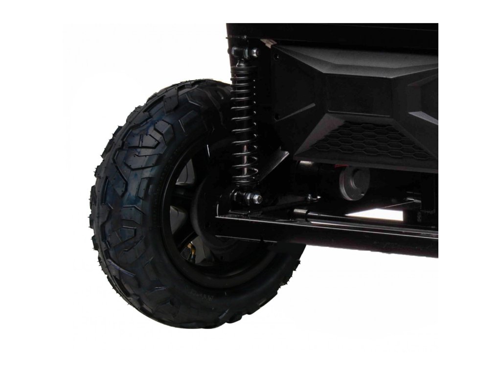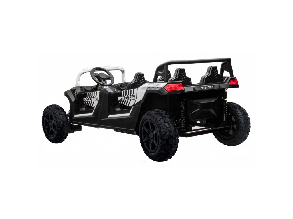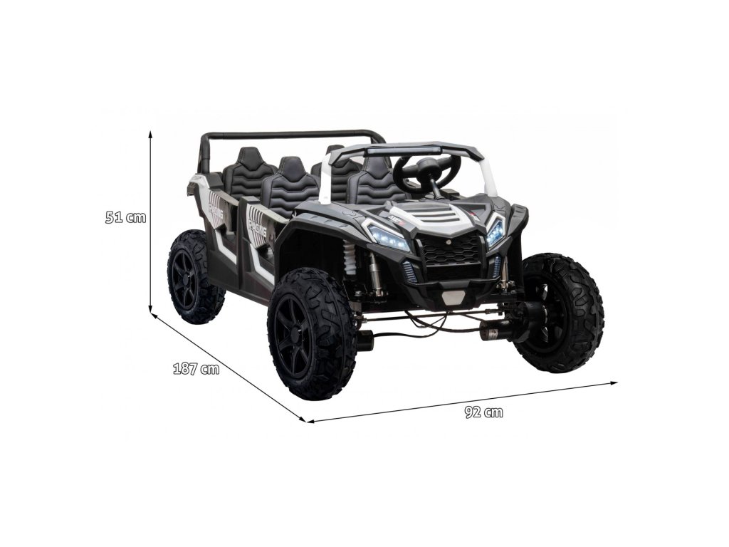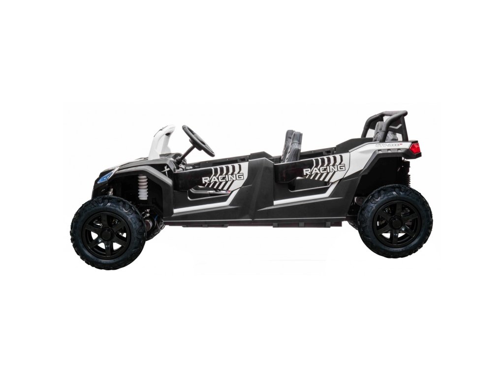 Акумулаторната кола Бъги АТВ Рейсинг UTV2000 четириместно бяло с четири мощни мотора с обща мощност от 600W е задължителна за всяко детско игрално пространство. Кола е задвижвана от батерия с капацитет 24V 15.6Ah (литиево-йонна). Максималното натоварване на превозното средство е 120 кг. По време на каране детето ще се забавлява с музикален панел с MP3, Bluetooth, USB и предварително записани мелодии.