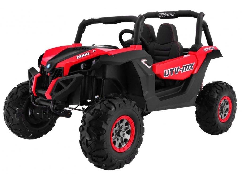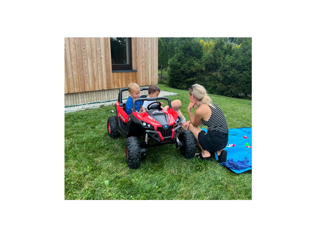 Акумулаторна кола Бъги СуперСтар 4x4 - MP4 червена може да се управлява по два начина – от родител чрез дистанционно управление или самостоятелно от детето, след като вече е усвоило правилата за шофиране. При производството на акумулаторната кола е обърнато внимание на всеки детайл – обезопасителни колани, кожена седалка, музикален панел и светлинни ефекти. Колелата са изработени от мек EVA пластмасов материал, който осигурява комфортно каране върху неравни терени. Благодарение на 4x4 задвижването и трите скорости, автомобилът се управлява лесно при наклони, неравности или трева. С MP4 сензорния панел детето може да гледа филми. Този продукт е предназначен за най-малките деца и е отличен избор за подарък за рожден ден или друг повод.