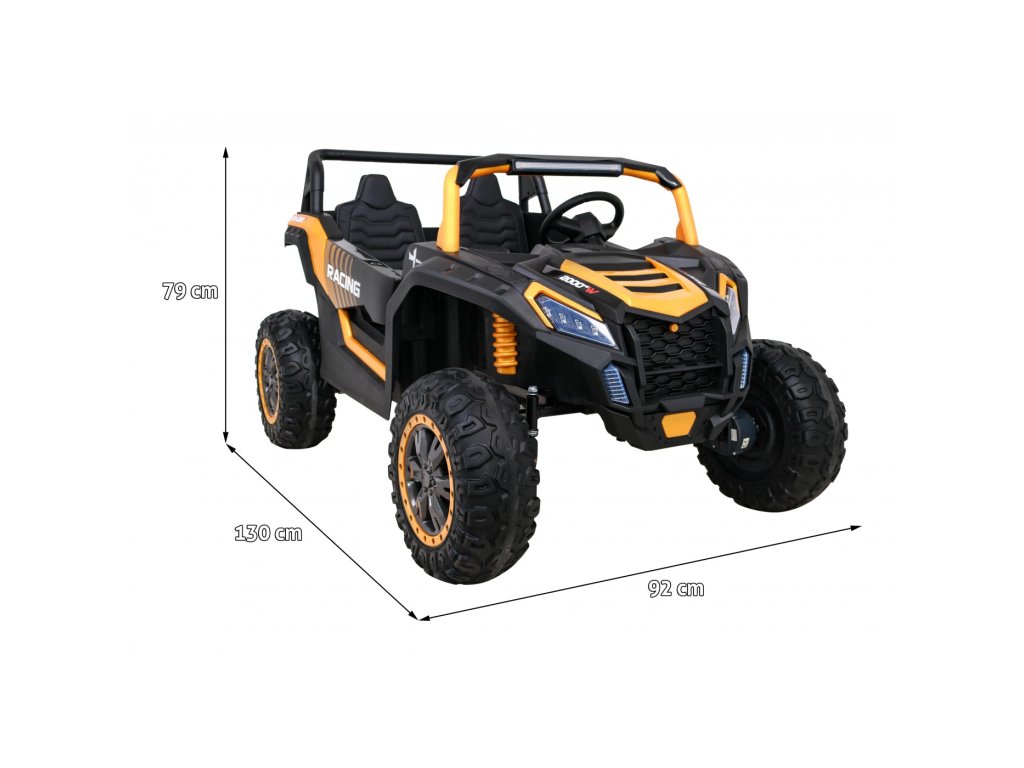 Акумулаторна кола Бъги UTV 24V 4x200W златно с четири мощни електрически мотора по 200W всеки. Детската кола лесно се справя с всякакъв терен. В удобното седалково място от еко кожа могат да се настанят дори две деца, тъй като колата има максимално теглово натоварване до 60 кг.