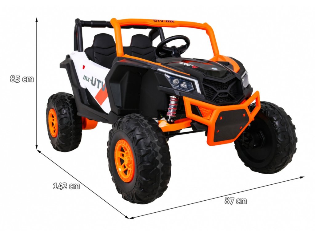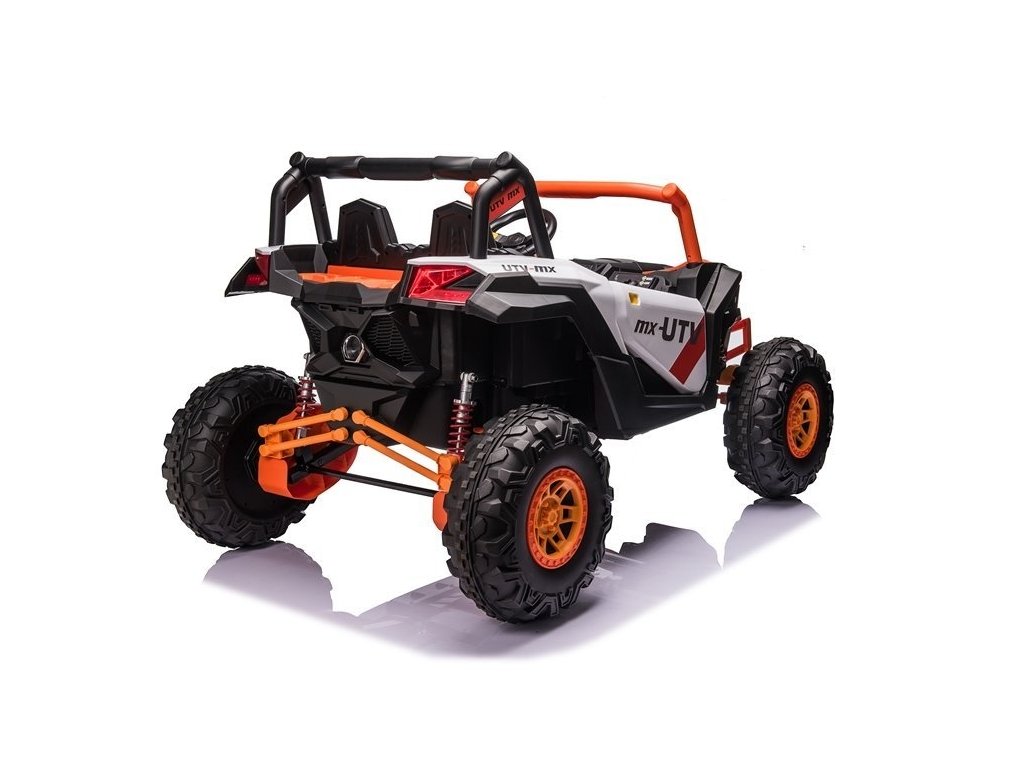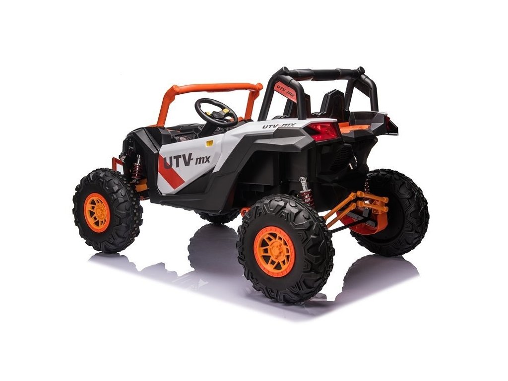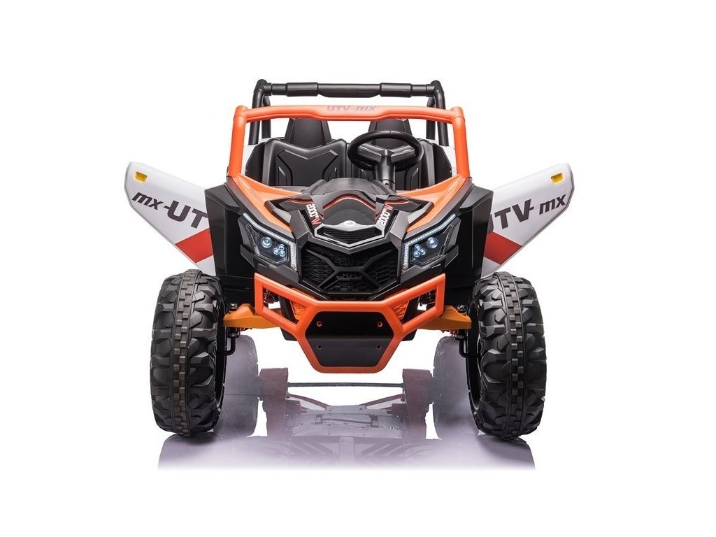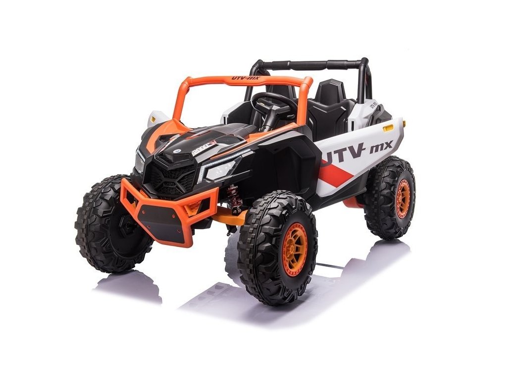 Детска акумулаторна кола бъги UTV-MX с четири мощни електрически мотора 60W и акумулатор 24V 7Ah. За комфортно шофиране се грижат големите пенополиуретанови EVA гуми, които заедно с моторите преодоляват терен и неасфалтирани повърхности.