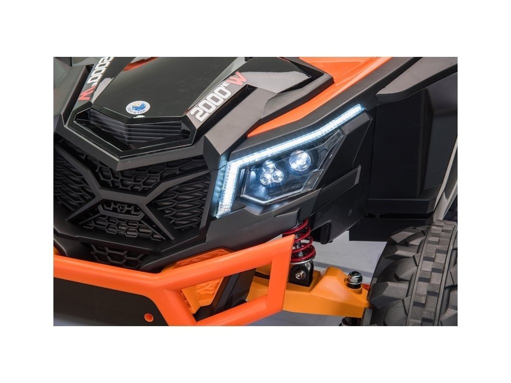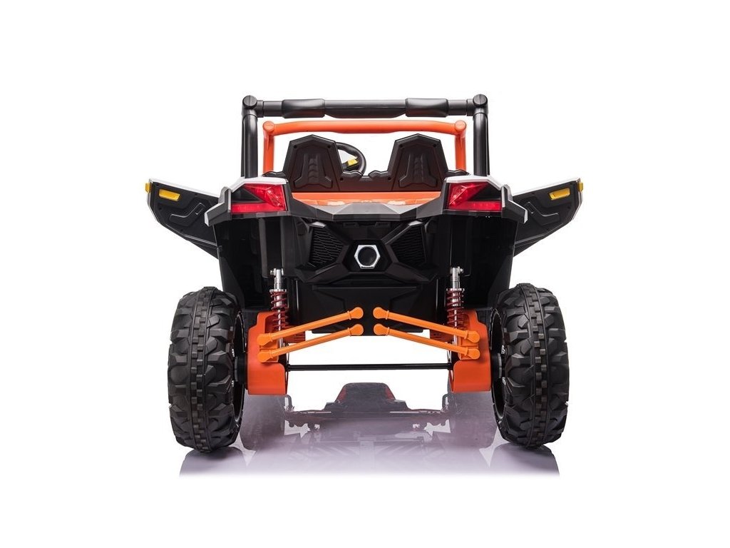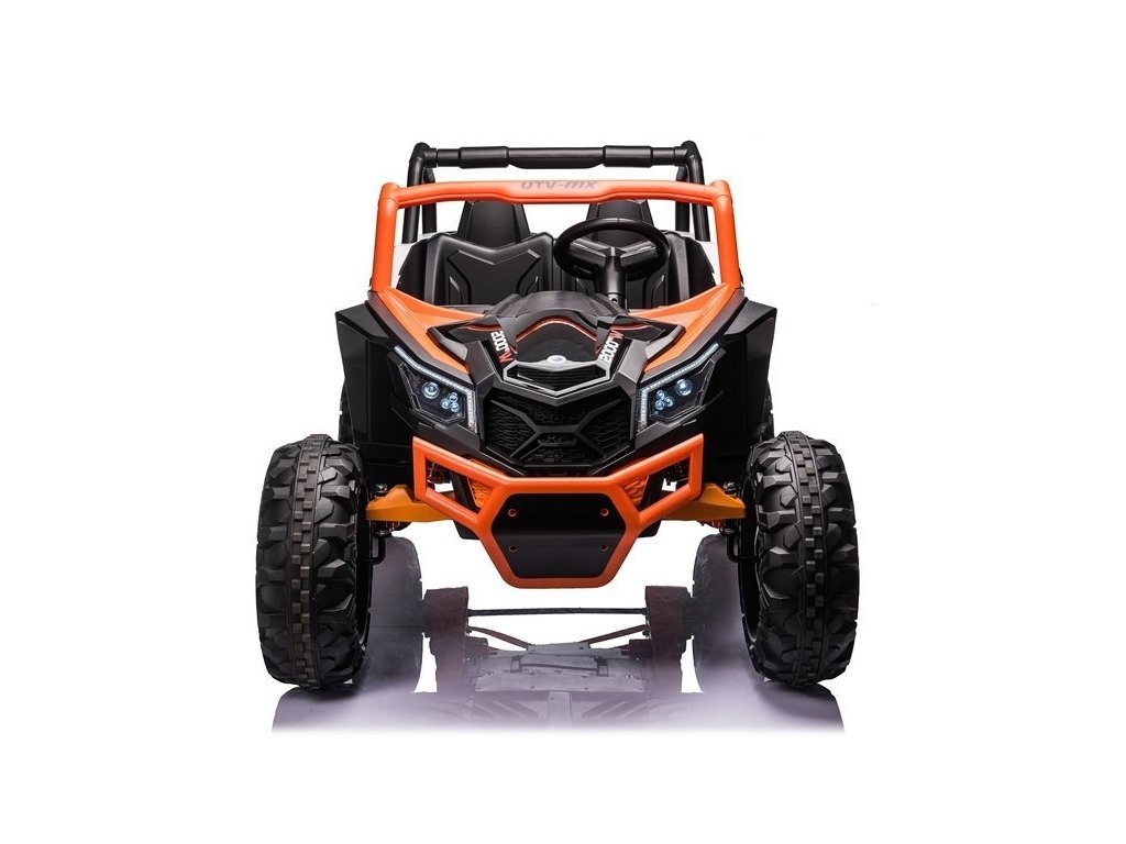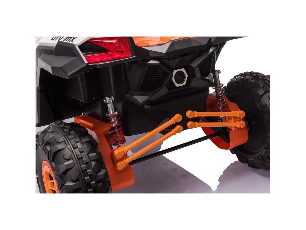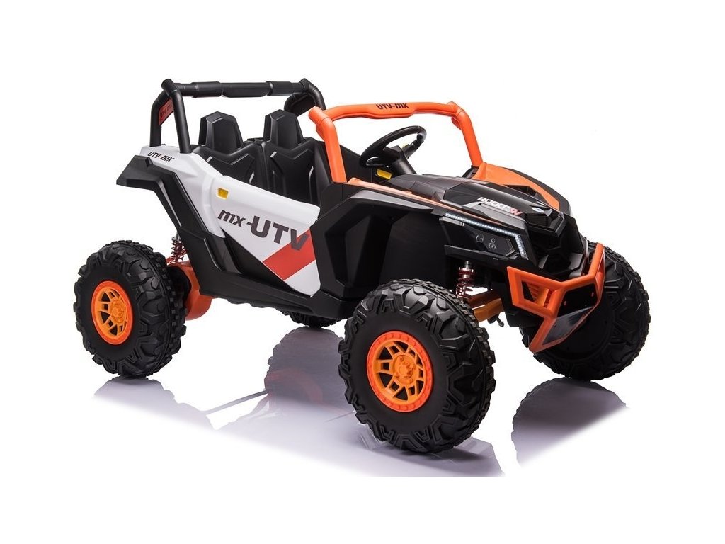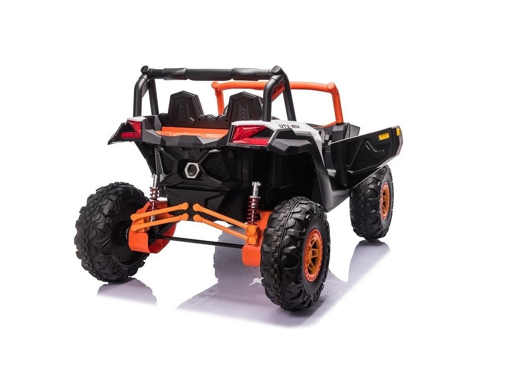 Детска акумулаторна кола бъги UTV-MX с четири мощни електрически мотора 60W и акумулатор 24V 7Ah. За комфортно шофиране се грижат големите пенополиуретанови EVA гуми, които заедно с моторите преодоляват терен и неасфалтирани повърхности.