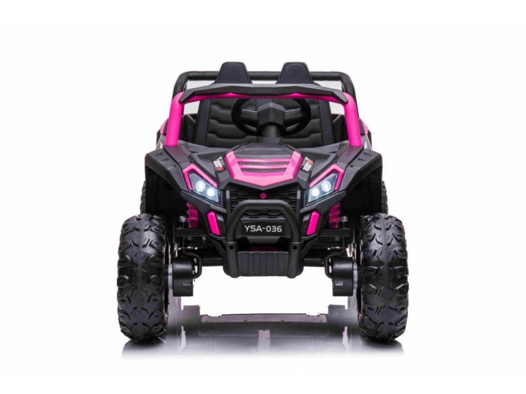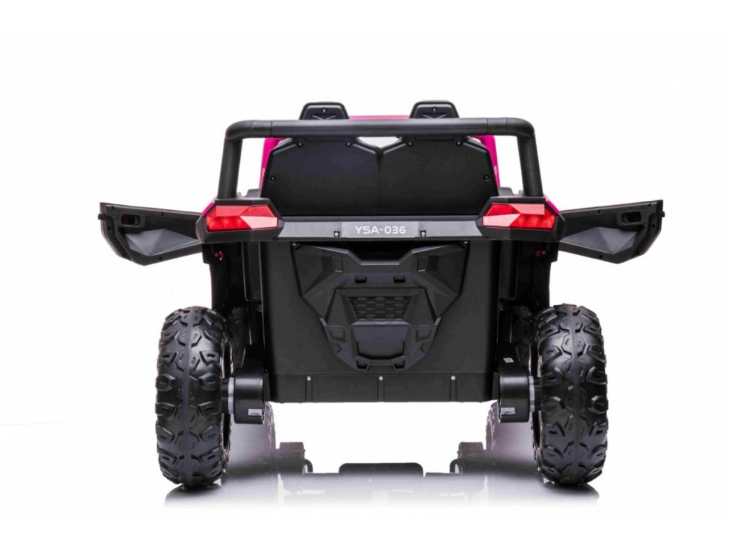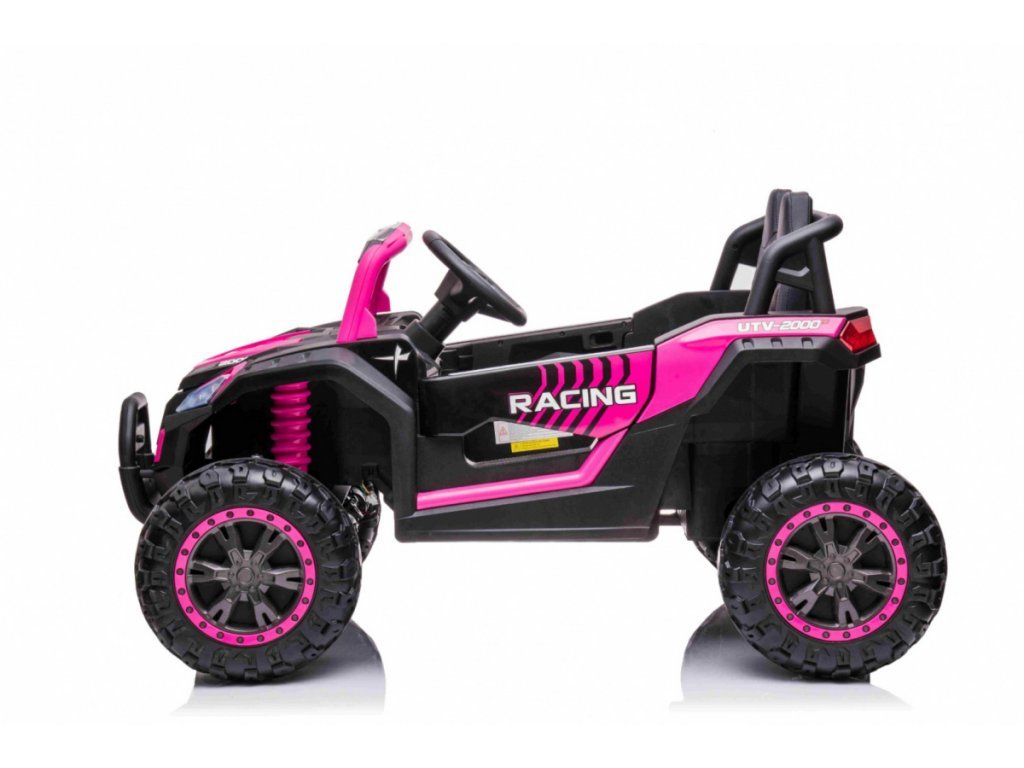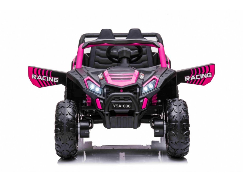 Детска електрическа кола Акумулаторна кола Бъги UTV Racing 4x4 12V10Ah 180W розово е оборудвана с пенни гуми от EVA пяна, които осигуряват тиха работа и са подходящи за неравен терен. Моделът се задвижва от четири електрически мотора с мощност 45W всеки. Детето сяда на удобно оформено седалче с интегрирани предпазни колани. Можете да се движите по офроуд с максимална скорост от 3 до 8 км/ч, като са налични 3 скорости за избор.