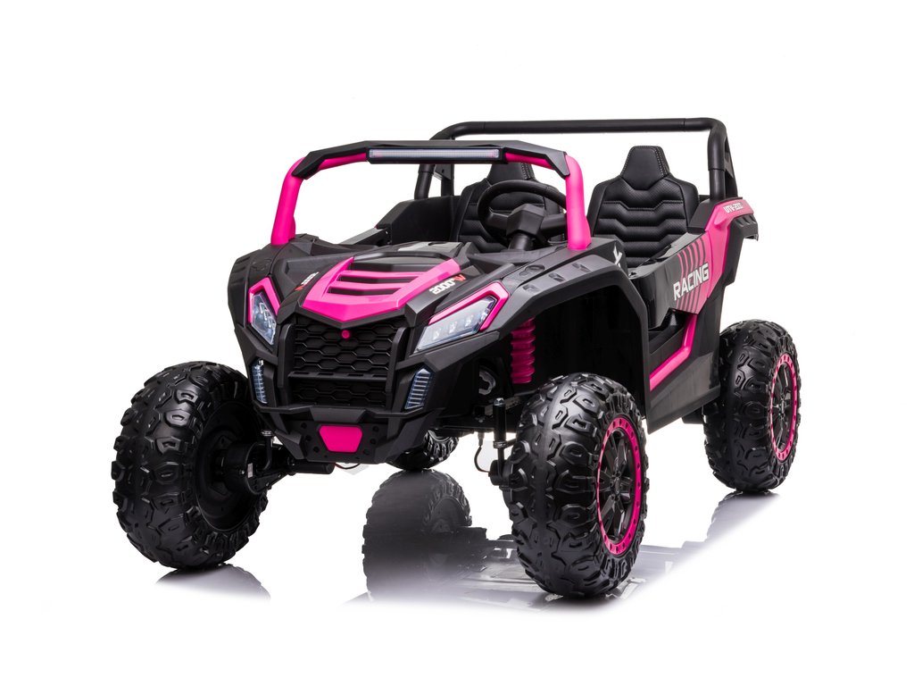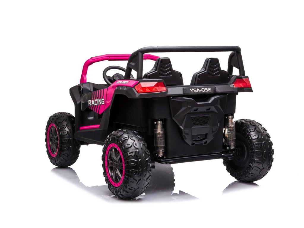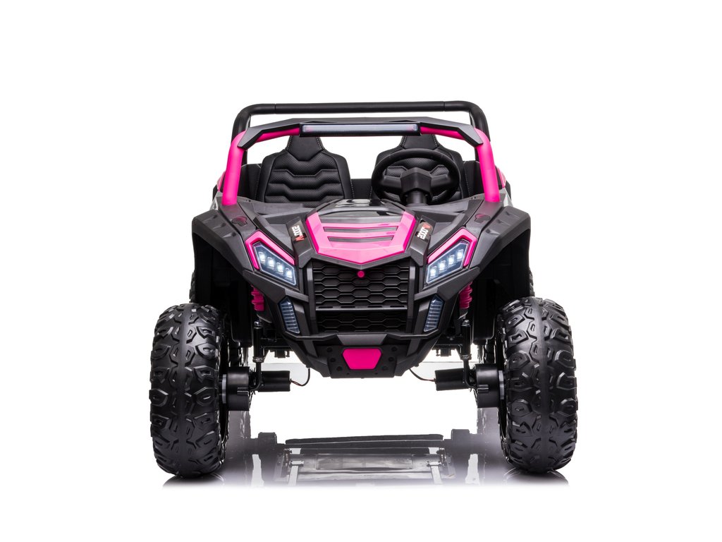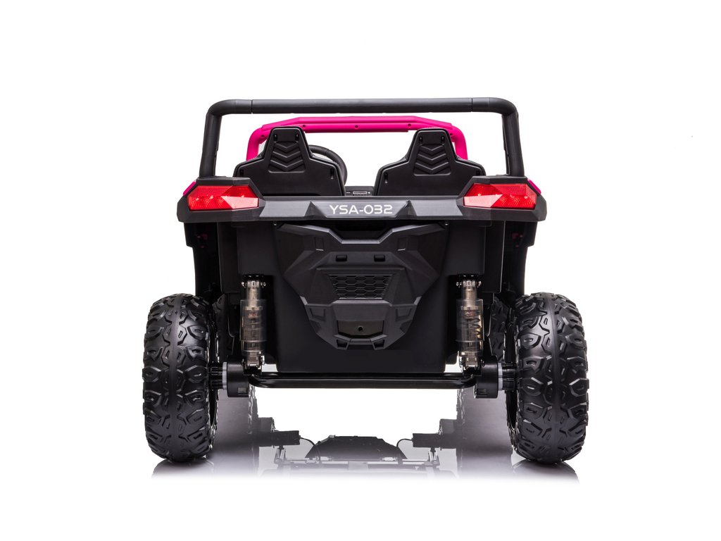 Уникална детска акумулаторна кола Бъги УТВ Стронг 24V розово с ултра мощни електрически мотори 2x200W и батерия 24V 7Ah, които се справят не само с твърди и равни настилки. Големите масивни колела са изработени от здравата EVA пяна, която гарантира комфортно, тихо и безпроблемно каране.