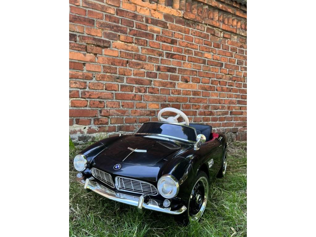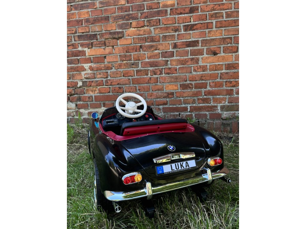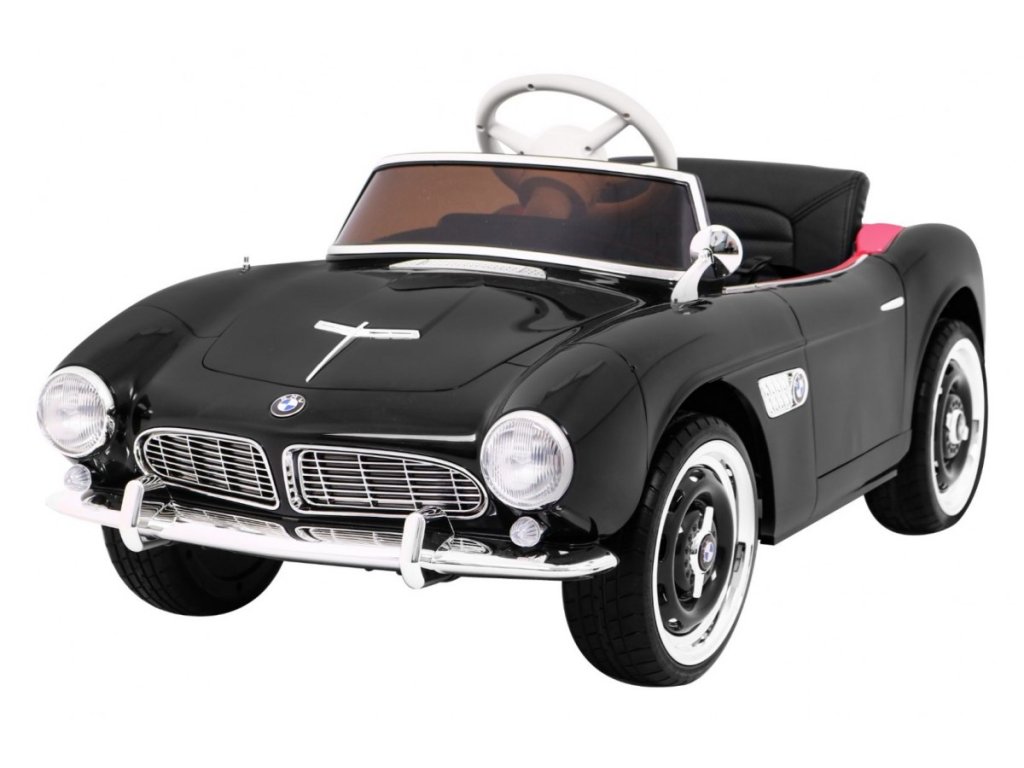 Акумулаторна кола BMW 507 Ретро черно в елегантен черен цвят. Акумулаторната кола е оборудвана с работещи предни и задни светлини. Разполага с входове за MP3, SD карта и USB порт. За сигурността на детето има монтиран предпазен колан на седалката. За да тръгнете на разходка, просто се настанете удобно в акумулаторната кола и натиснете бутона START. В комплекта е включено дистанционно управление за родителите, което може да се използва, когато детето още не контролира самостоятелно колата.