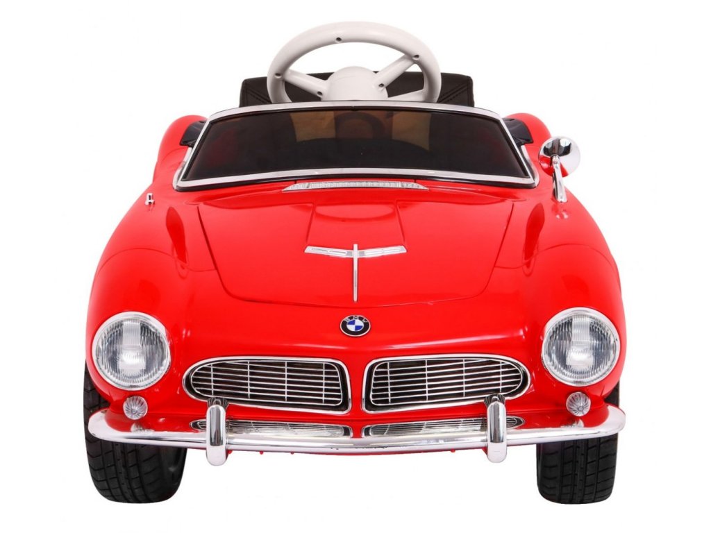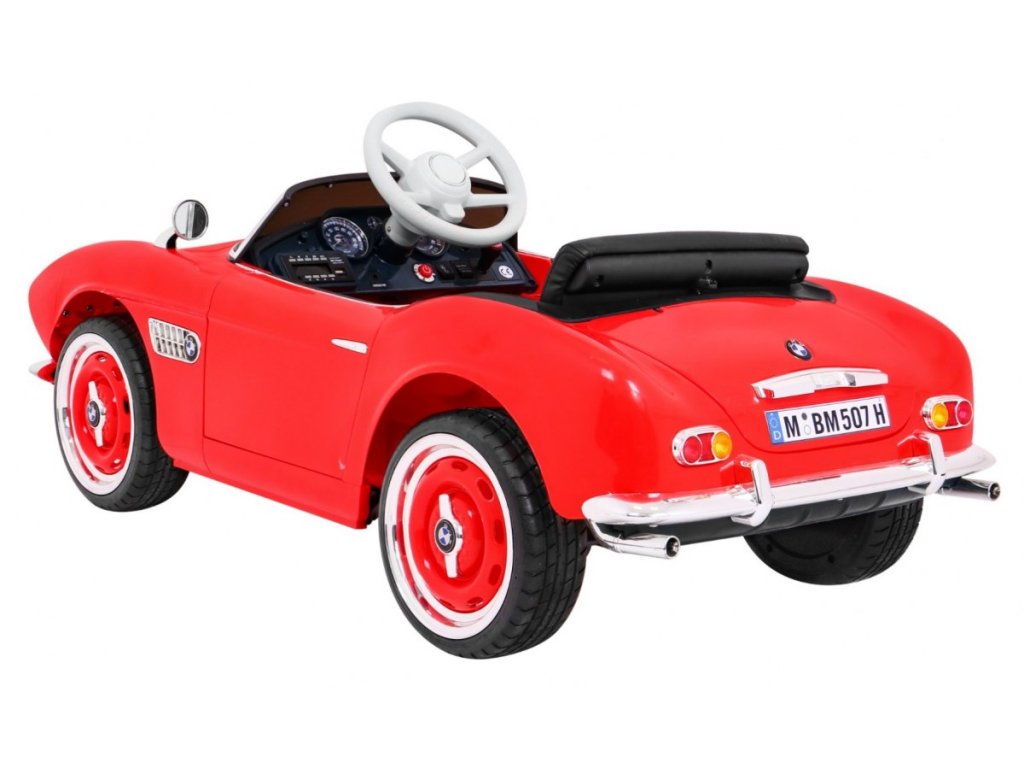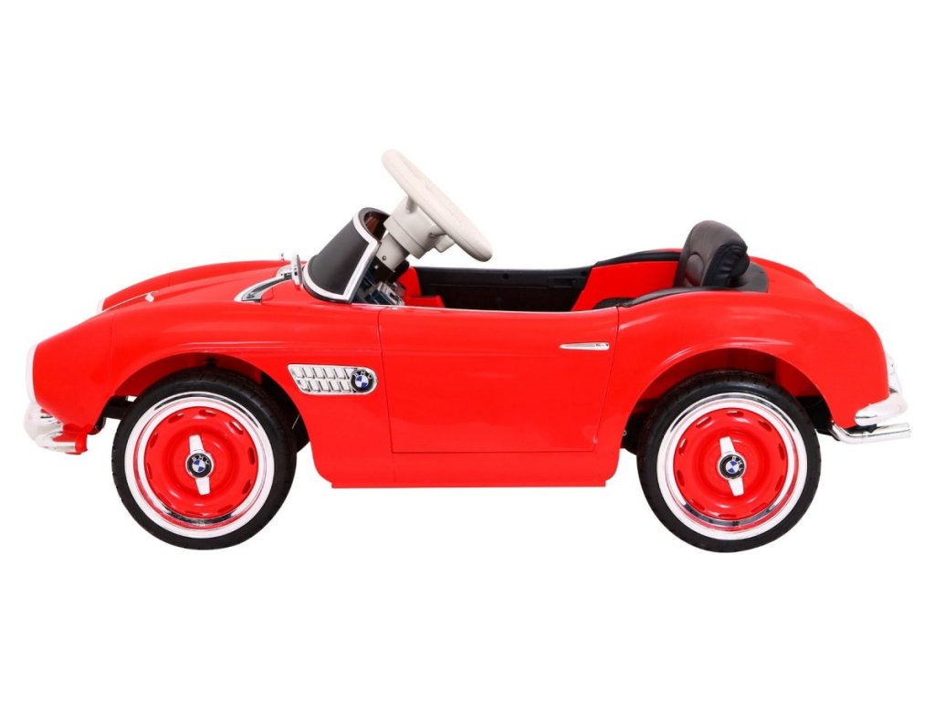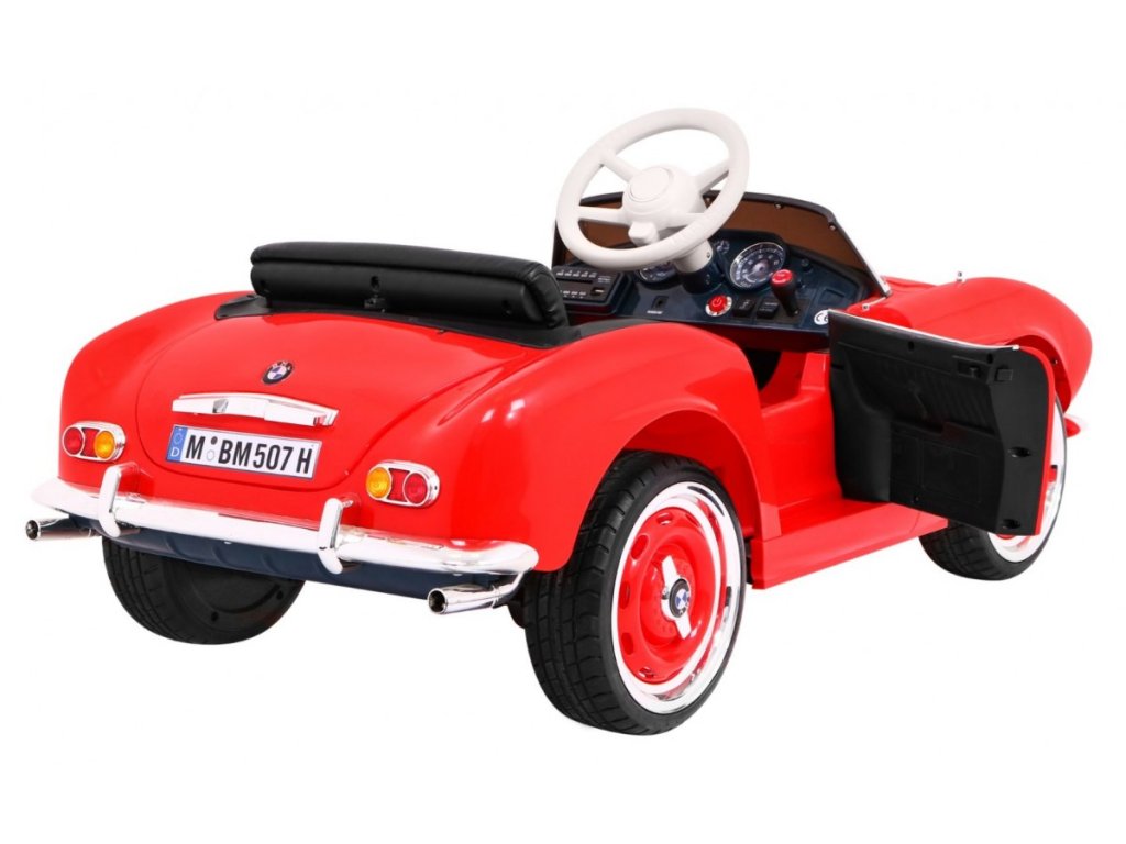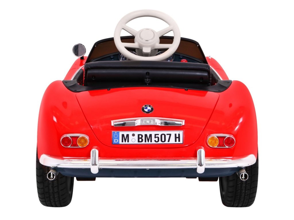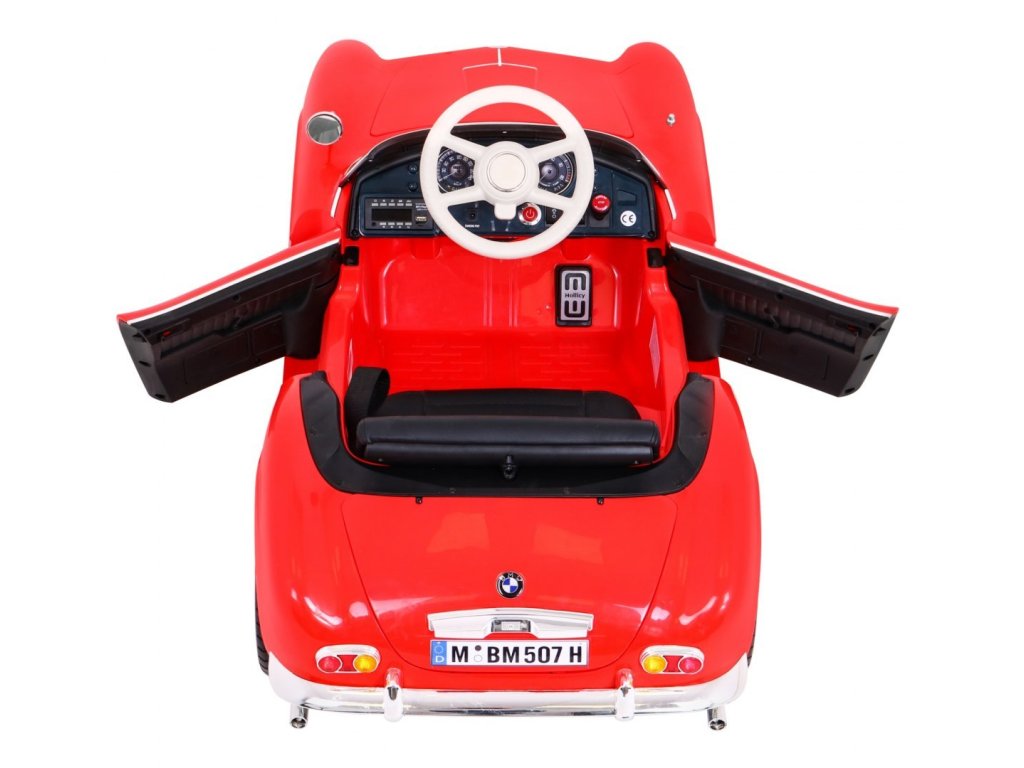 Акумулаторна кола BMW 507 Retro червено с ярък червен цвят. Акумулаторната кола е оборудвана с предни и задни светещи LED светлини. Разполага с входове за MP3, SD карта и USB. За безопасността на детето на седалката е поставен предпазен колан. За да тръгнете на разходка, просто се настанете удобно в акумулаторната кола и натиснете бутона START. В комплекта е включено и дистанционно управление за родителите, което се използва, когато детето все още не контролира управлението на колата самостоятелно.