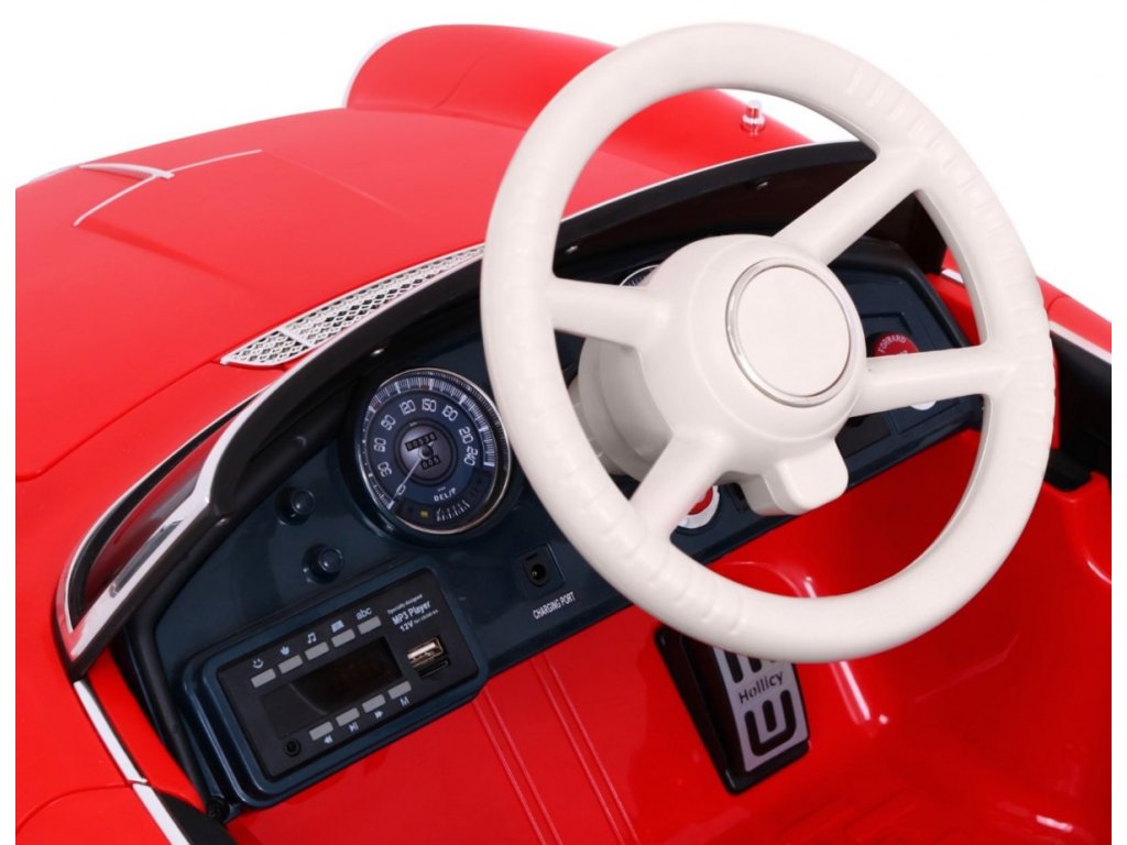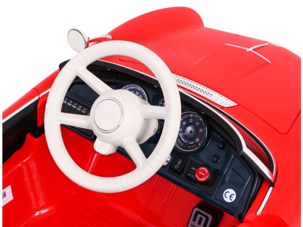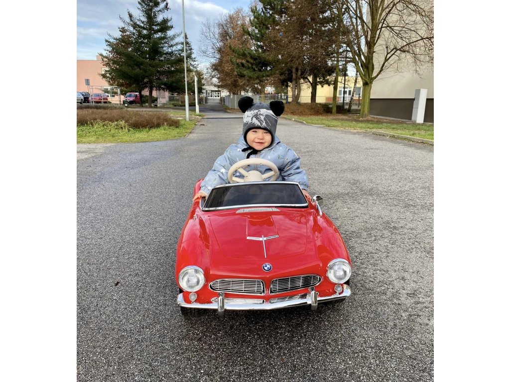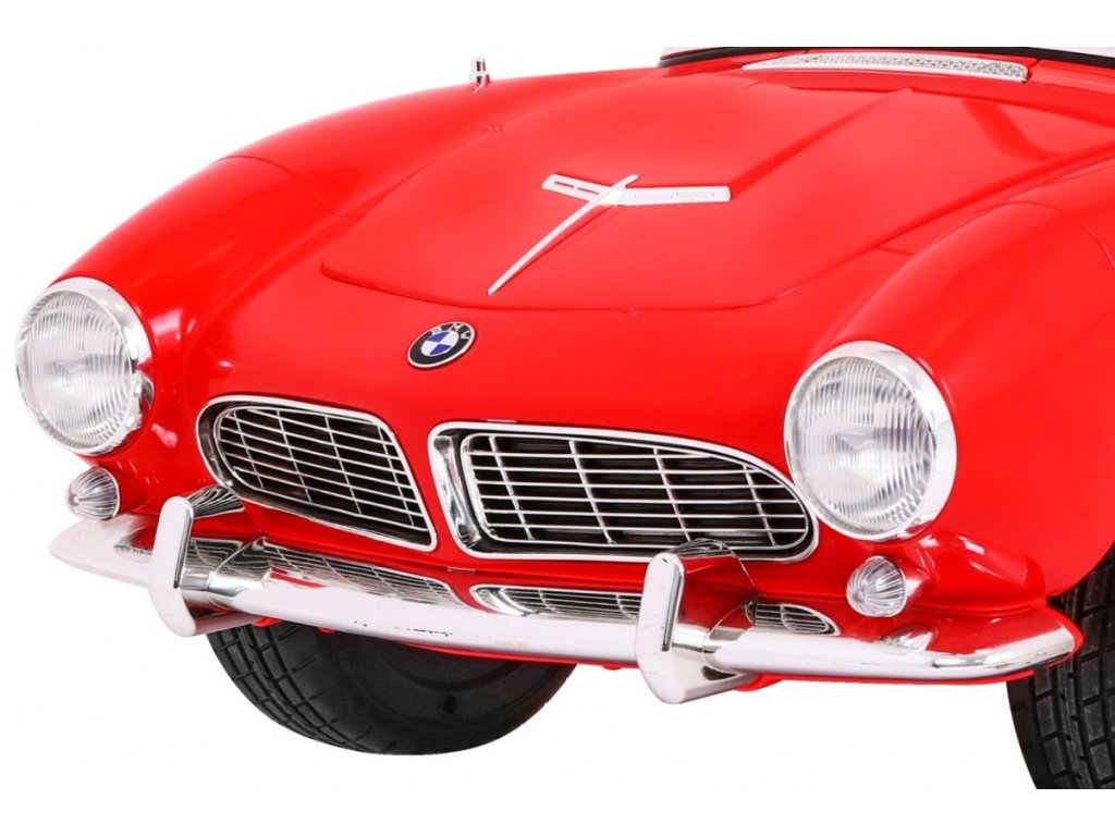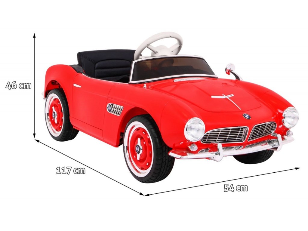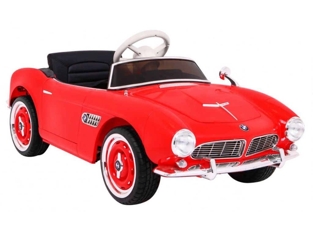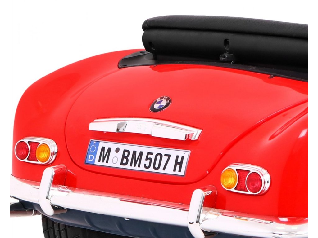 Акумулаторна кола BMW 507 Retro червено с ярък червен цвят. Акумулаторната кола е оборудвана с предни и задни светещи LED светлини. Разполага с входове за MP3, SD карта и USB. За безопасността на детето на седалката е поставен предпазен колан. За да тръгнете на разходка, просто се настанете удобно в акумулаторната кола и натиснете бутона START. В комплекта е включено и дистанционно управление за родителите, което се използва, когато детето все още не контролира управлението на колата самостоятелно.