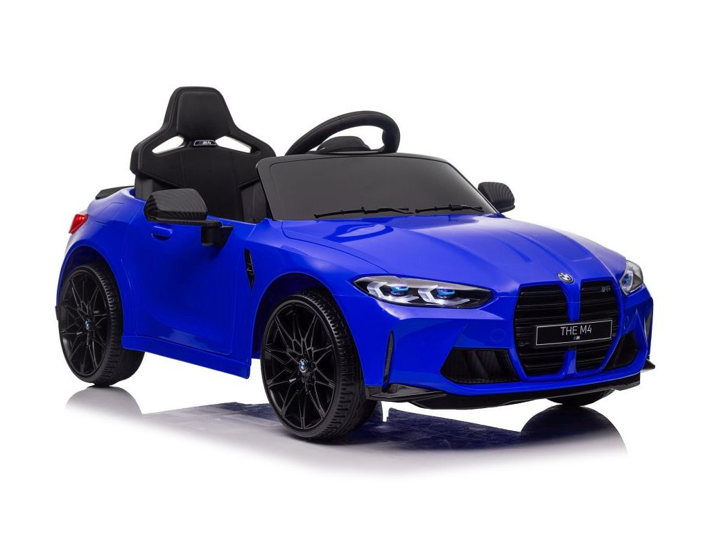 Детска акумулаторна кола BMW M4 12V боядисана синя е оборудвана с меки пянообразни EVA колела, които са безшумни и се адаптират към различни типове терени. Детето сяда на удобно оформеното седалка от екологична кожа, а за безопасността се грижат предпазните колани.