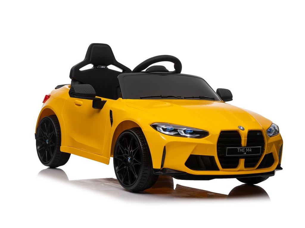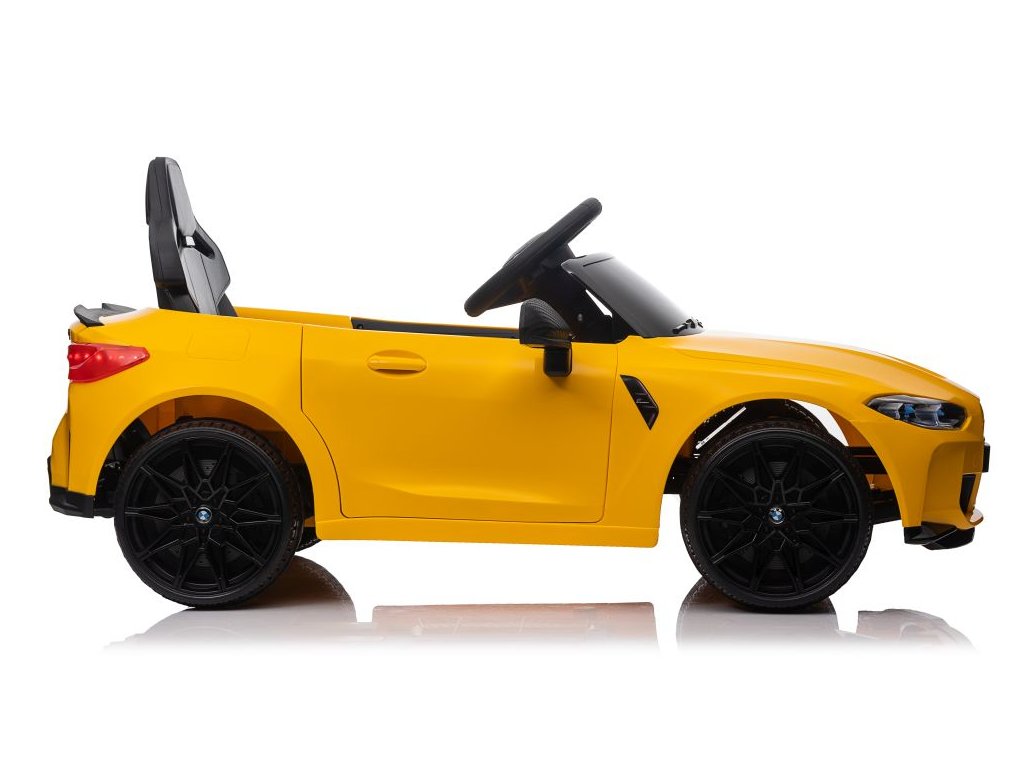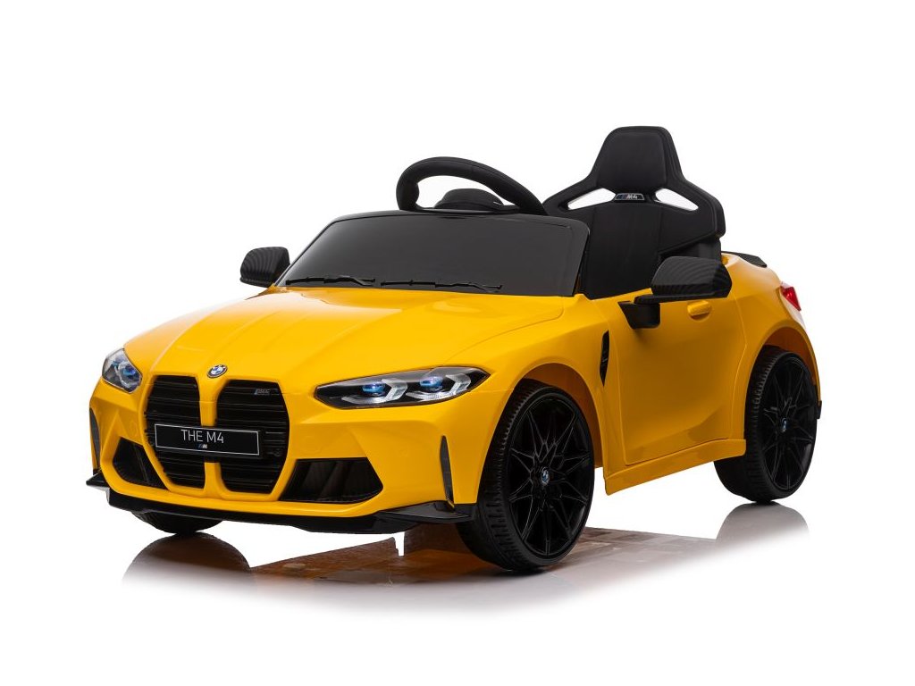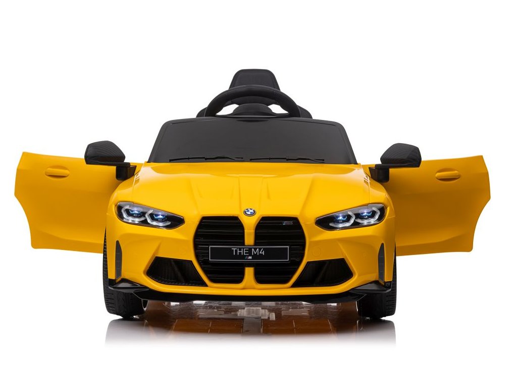 Детска лицензирана кола BMW M4 12V жълта с меки пяни EVA гуми, които са безшумни и се адаптират към различни видове терени. Детето сяда удобно в ергономично оформеното седалка от еко кожа, а безопасността осигуряват колани за сигурност.