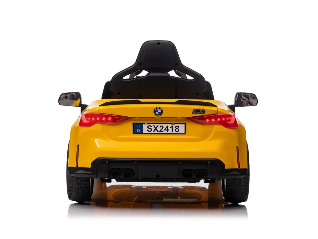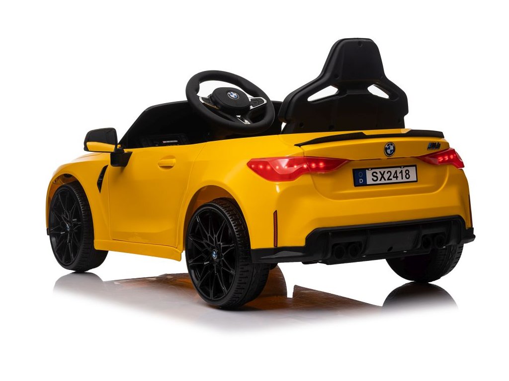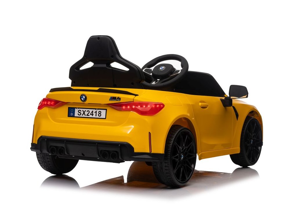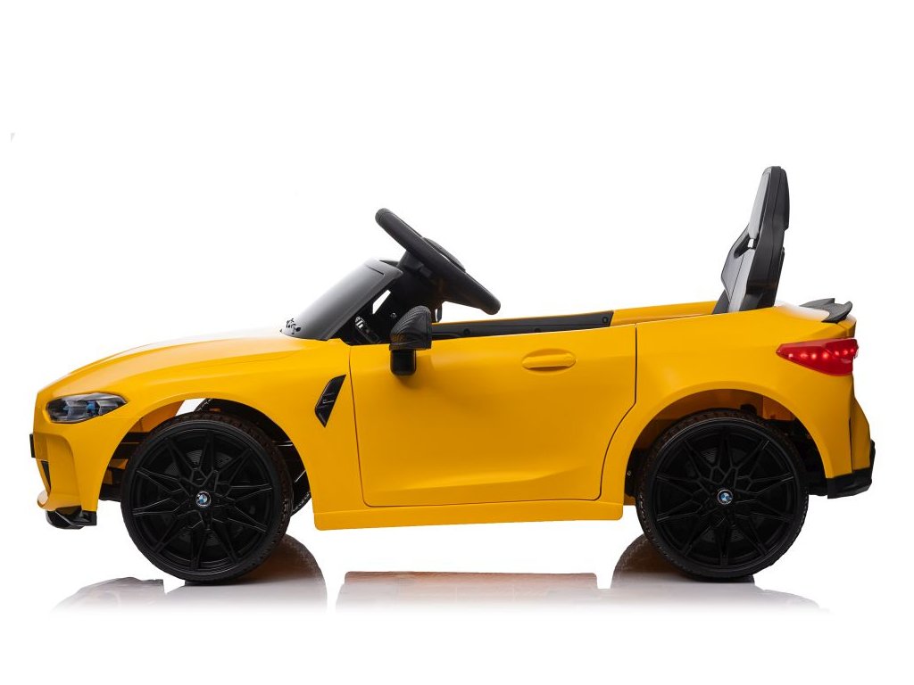 Детска лицензирана кола BMW M4 12V жълта с меки пяни EVA гуми, които са безшумни и се адаптират към различни видове терени. Детето сяда удобно в ергономично оформеното седалка от еко кожа, а безопасността осигуряват колани за сигурност.