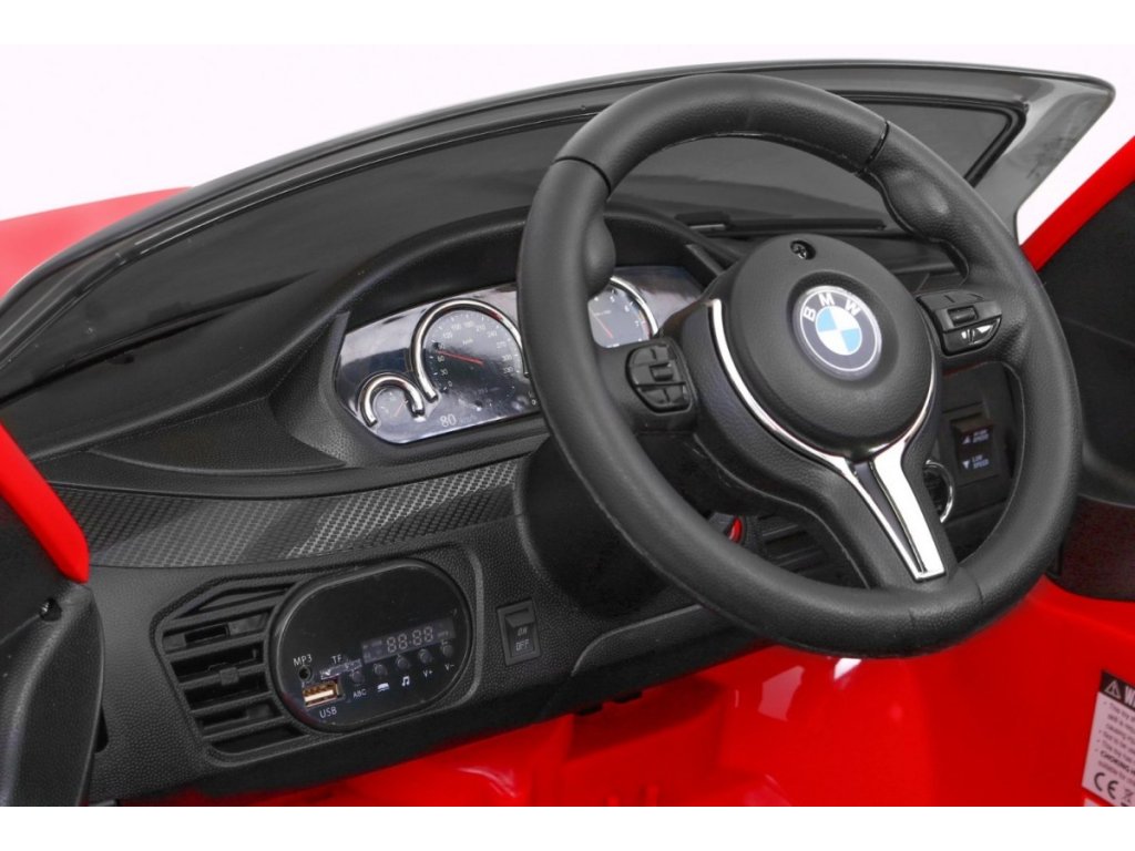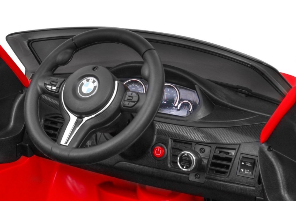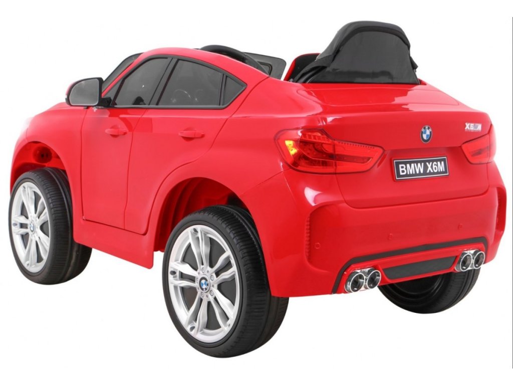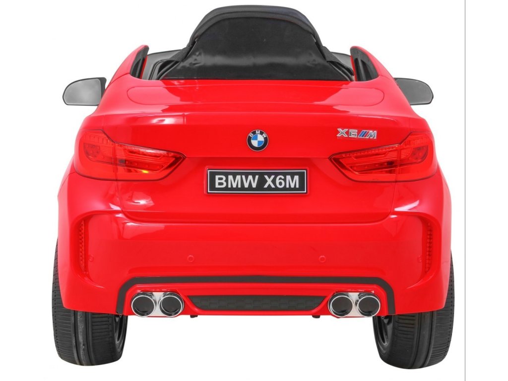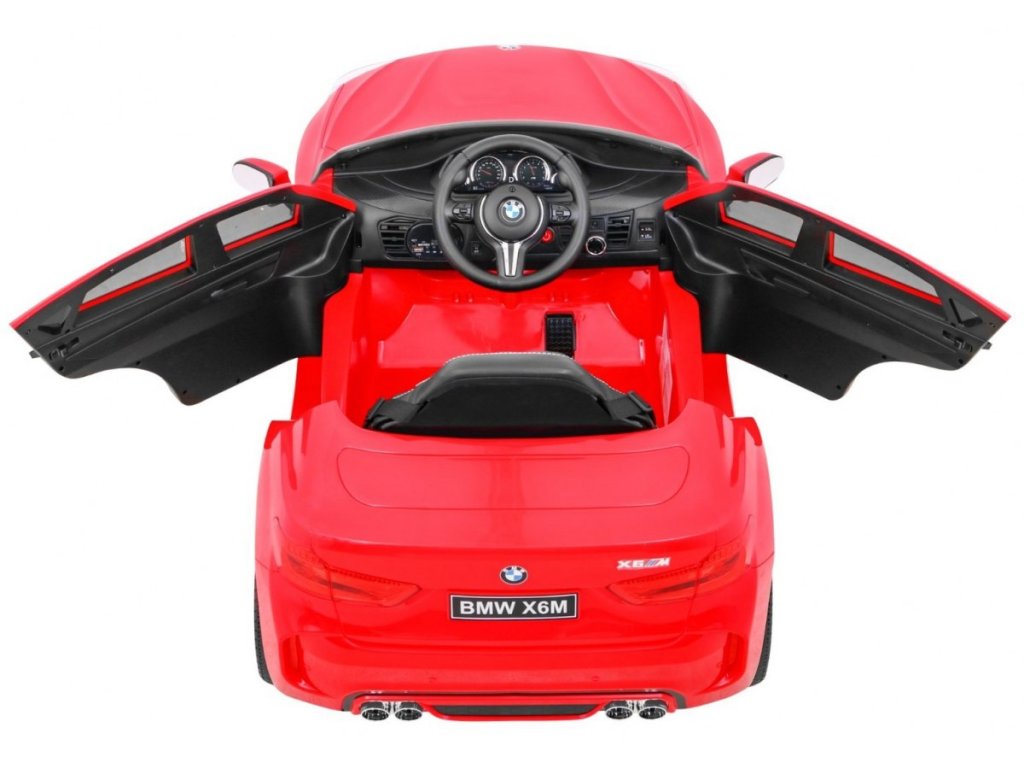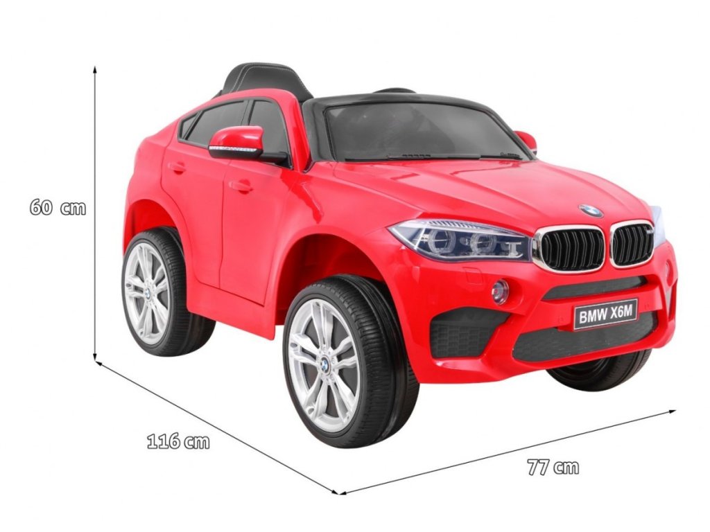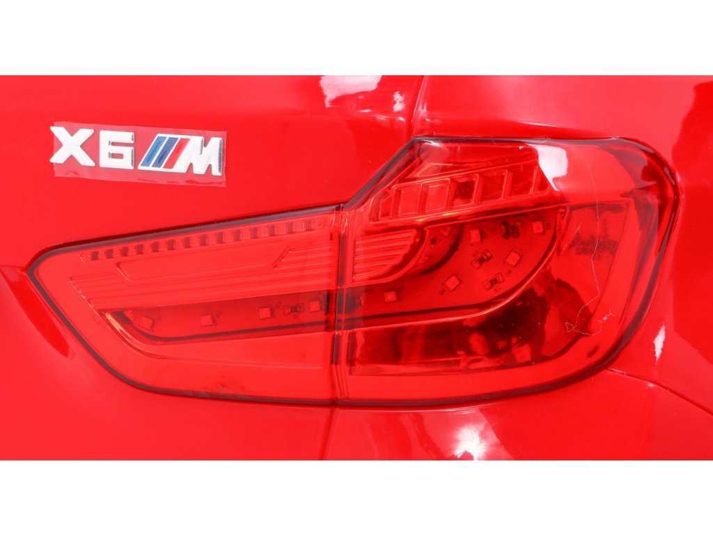 Представяме Ви луксозната и много мощна детска акумулаторна кола BMW X6 M червена, която е с лиценз на BMW и възможност за зареждане на акумулатора. Подходяща е за 1 дете. Изработена е от здрав и устойчив пластмасов материал, което гарантира високо качество. Кола се движи напред и назад. Оборудвана е със звукови и светлинни ефекти, както и приятна музика. Акумулаторната кола има реалистичен звук на мотор. Управлението може да става чрез дистанционно управление или детето да управлява самостоятелно автомобила. В колата може да свържете и собствен MP3 плейър, за да слуша любимите си песни. В комплекта са включени и покривало за автомобила, както и USB флаш памет с обучително видео.