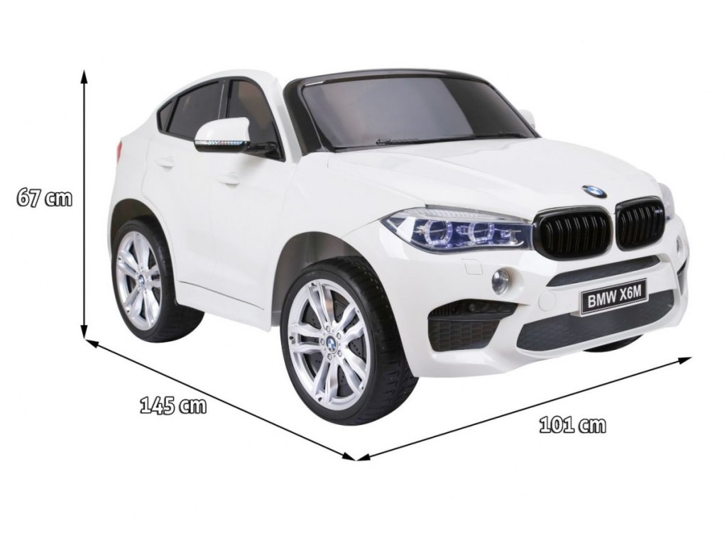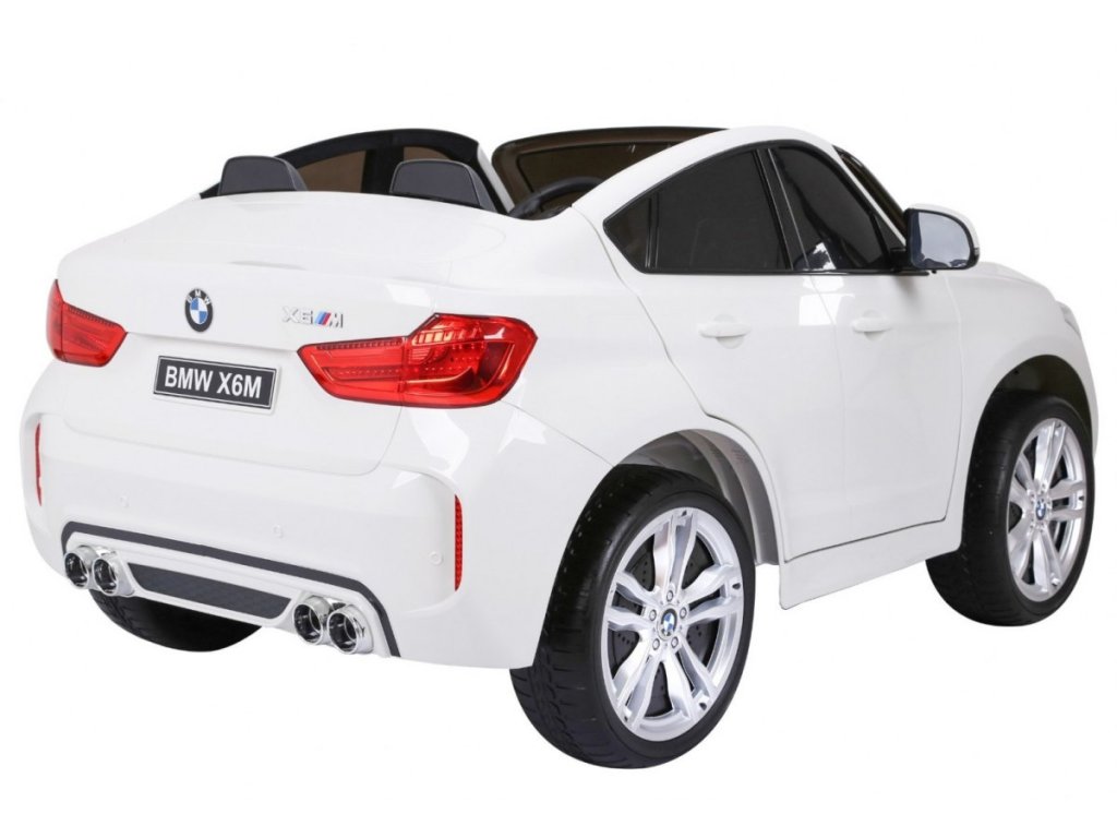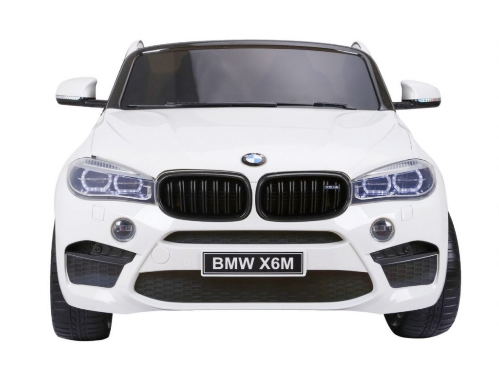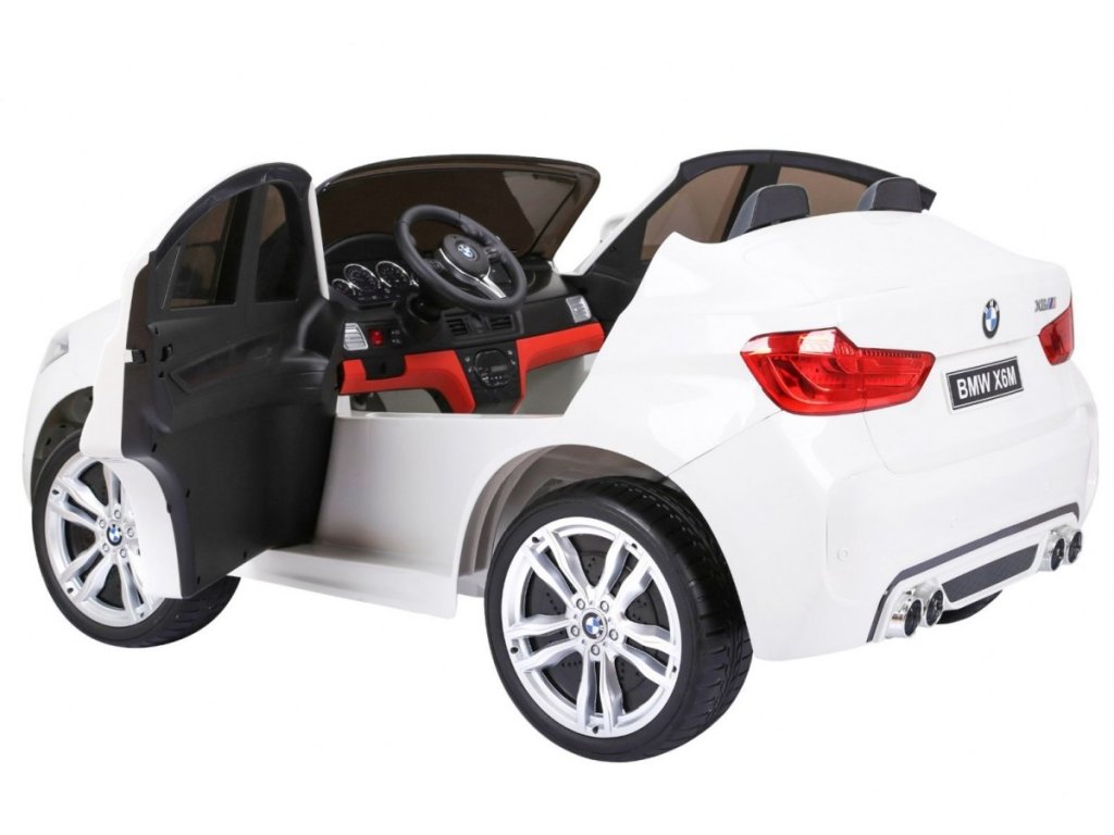 Лицензирана акумулаторна кола BMW X6 M с двуместна конструкция и електрическа спирачка. Кола разполага с кожена седалка и отварящи се врати, като за безопасността на детето на седалката е поставен обезопасителен колан. Акумулаторната кола е оборудвана и с осветяващи се предни и задни фарове. За малките музикални почитатели има възможност за свързване на MP3 и USB устройства. Цифров индикатор за състоянието и заряда на батерията. Кола разполага с дистанционно управление ново поколение на 2.4 GHz. 2x мотор с задвижване на двете задни колела. Карането е възможно напред и назад с 3 скорости (бавна, бърза). Благодарение на това оборудване е подходяща и за каране в терен. Подходяща и за по-малки деца – благодарение на възможност за настройка на по-ниска скорост. Тази ексклузивна акумулаторна кола ще донесе удоволствие както на детето, така и на родителите.