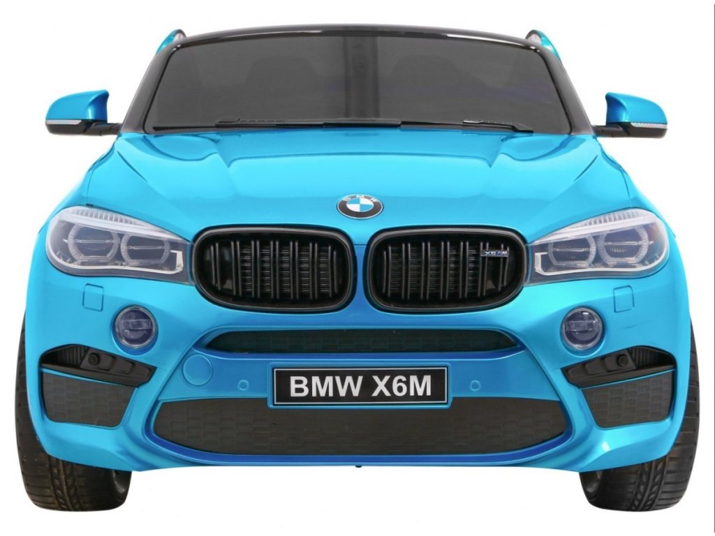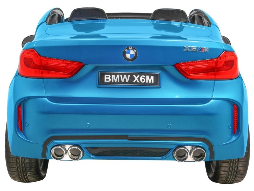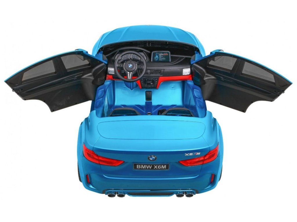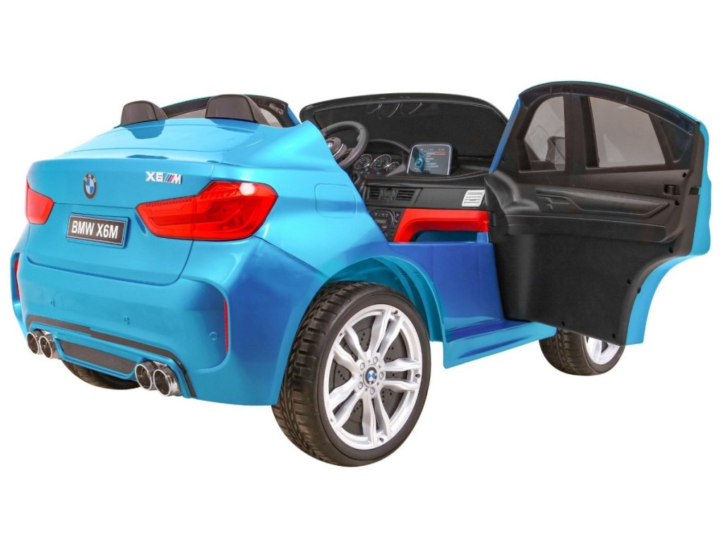 Лицензиран акумулаторен автомобил BMW X6 M с двуместна конструкция и електрическа спирачка. Акумулаторната кола е с кожена седалка и отварящи се врати, а за безопасността на детето е осигурен предпазен колан на седалката. Колата разполага със светещи предни и задни светлини. За малки музикални любители има възможност за свързване на MP3 и USB устройства. Цифров индикатор за състоянието и заряда на батерията. Акумулаторната кола е оборудвана с дистанционно управление 2,4 GHz ново поколение. 2x двигателя за задвижване на двете задни колела. Кара напред и назад с 3 скорости (бавна, бърза). Благодарение на тази оборудваност е подходяща и за шофиране в офроуд условия. Подходяща е и за по-малки деца – благодарение на възможността за регулиране на по-ниска скорост. Този ексклузивен акумулаторен автомобил ще донесе радост както на детето, така и на родителите.