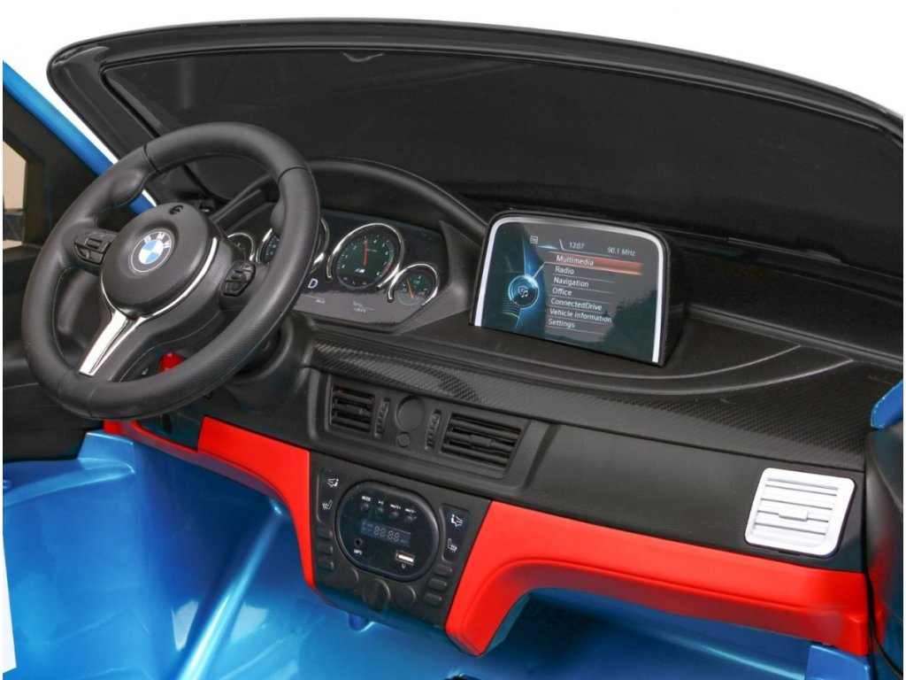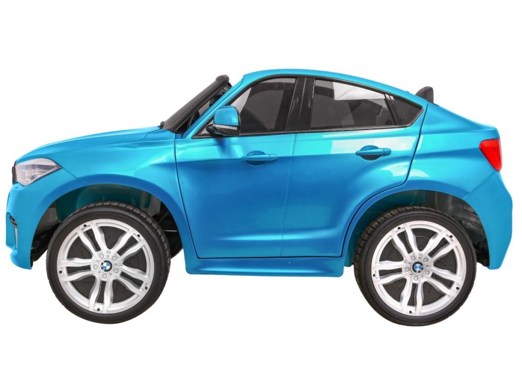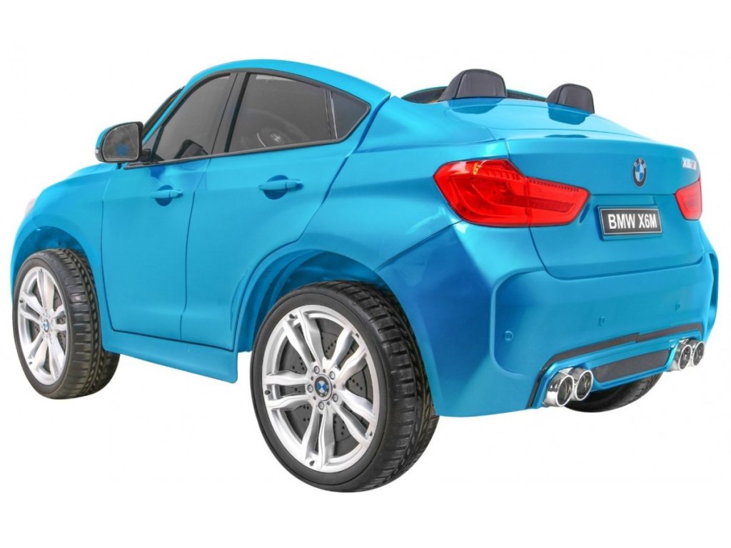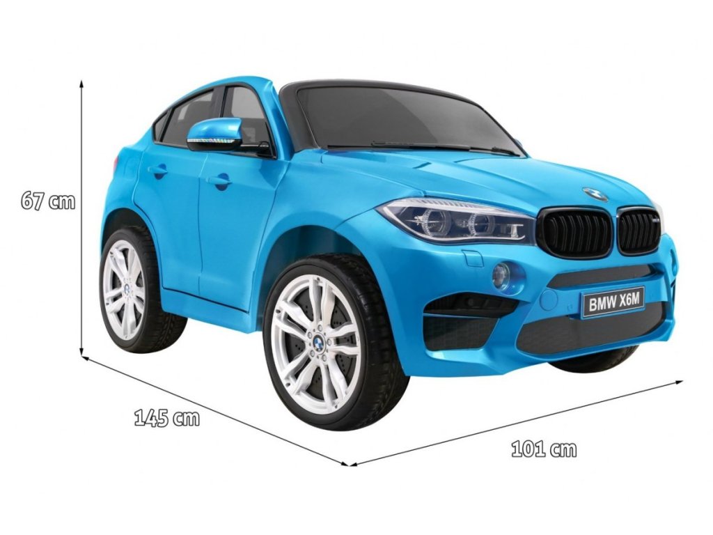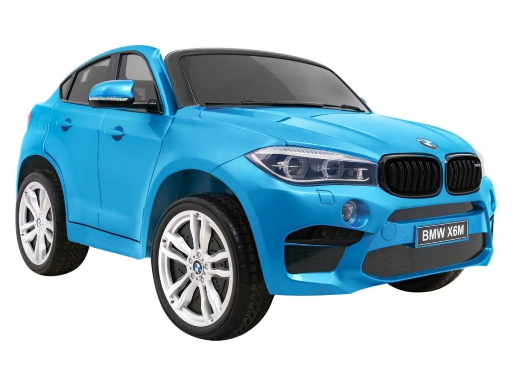 Лицензиран акумулаторен автомобил BMW X6 M с двуместна конструкция и електрическа спирачка. Акумулаторната кола е с кожена седалка и отварящи се врати, а за безопасността на детето е осигурен предпазен колан на седалката. Колата разполага със светещи предни и задни светлини. За малки музикални любители има възможност за свързване на MP3 и USB устройства. Цифров индикатор за състоянието и заряда на батерията. Акумулаторната кола е оборудвана с дистанционно управление 2,4 GHz ново поколение. 2x двигателя за задвижване на двете задни колела. Кара напред и назад с 3 скорости (бавна, бърза). Благодарение на тази оборудваност е подходяща и за шофиране в офроуд условия. Подходяща е и за по-малки деца – благодарение на възможността за регулиране на по-ниска скорост. Този ексклузивен акумулаторен автомобил ще донесе радост както на детето, така и на родителите.