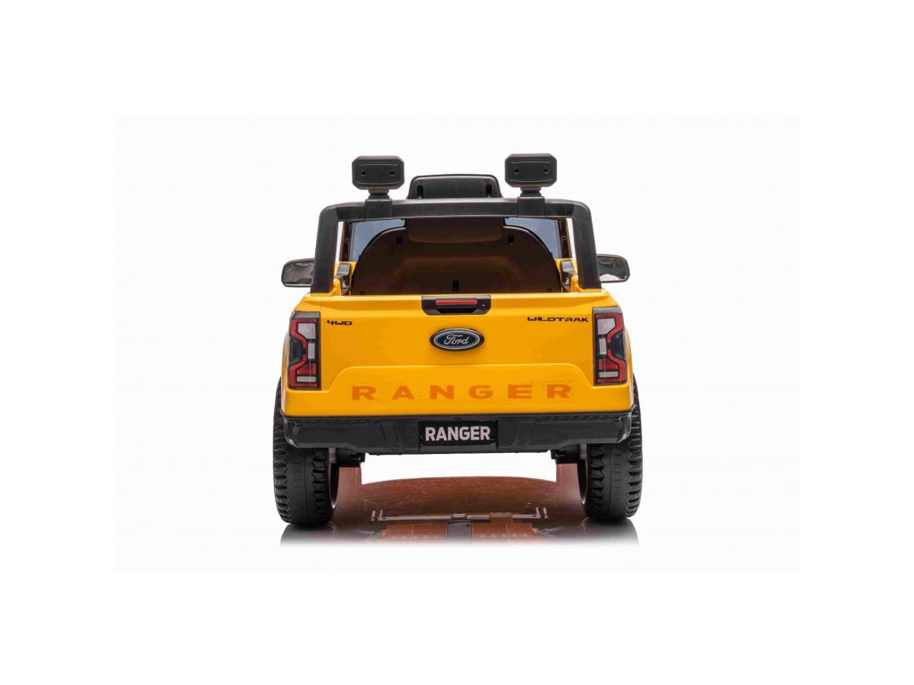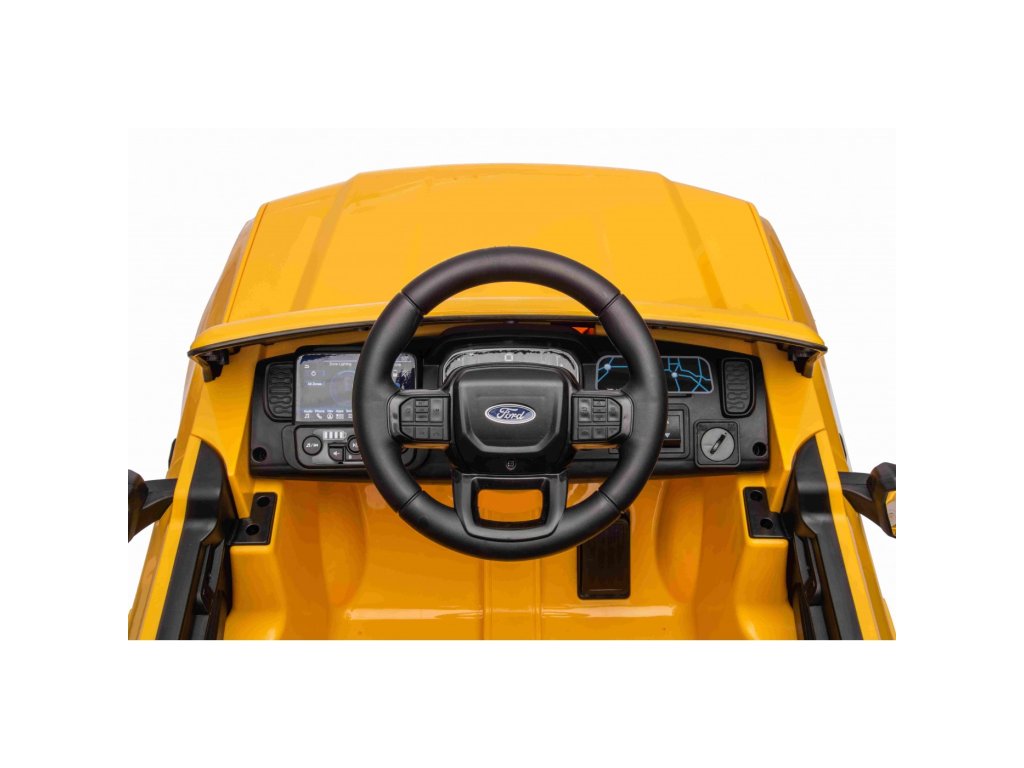 Детска лицензирана Акумулаторна кола Ford Ranger Lift жълта с богато оборудване и иновативен дизайн. Интериорът на автомобила е оборудван със седалка с предпазни колани, музикален панел с Bluetooth, входове за MP3, USB и бутони с мелодии. За по-добра видимост на пътя има предни LED светлини.
