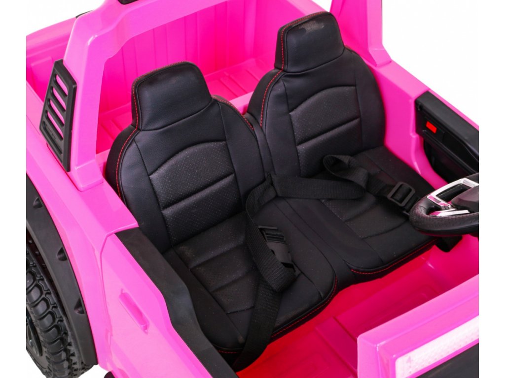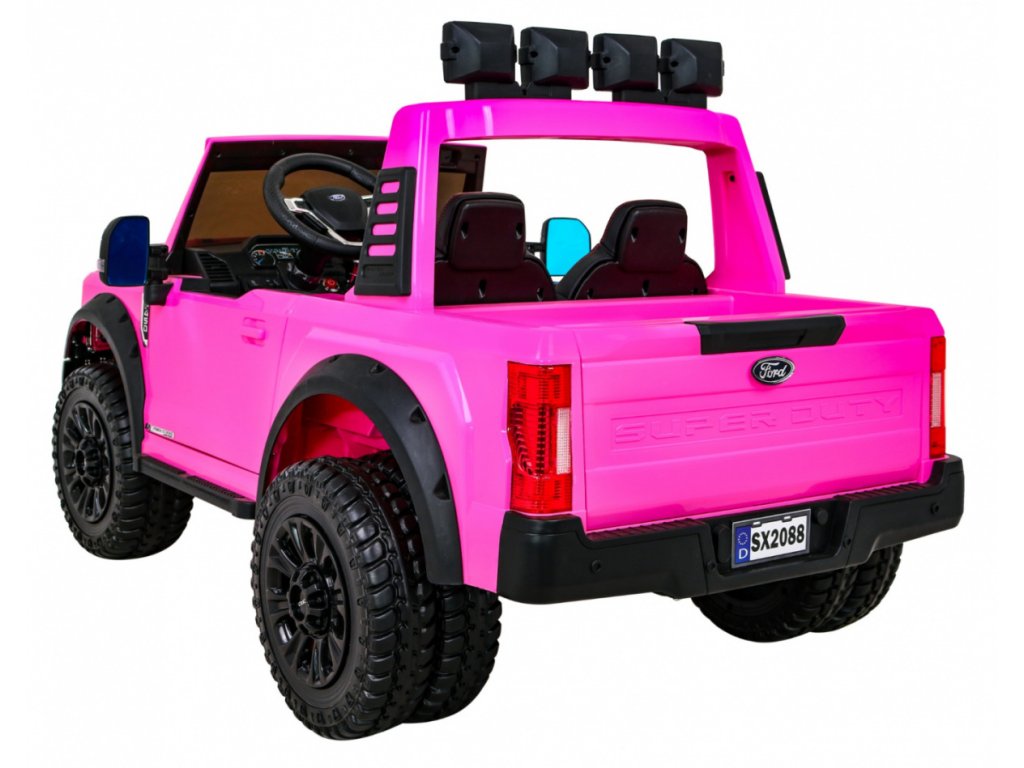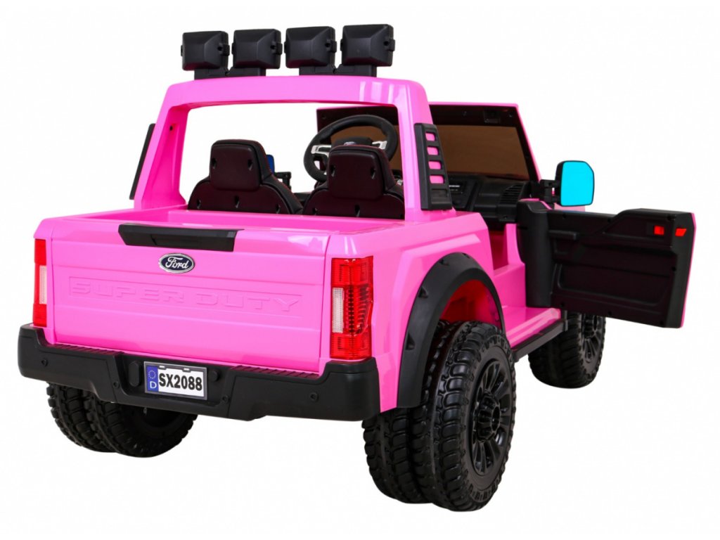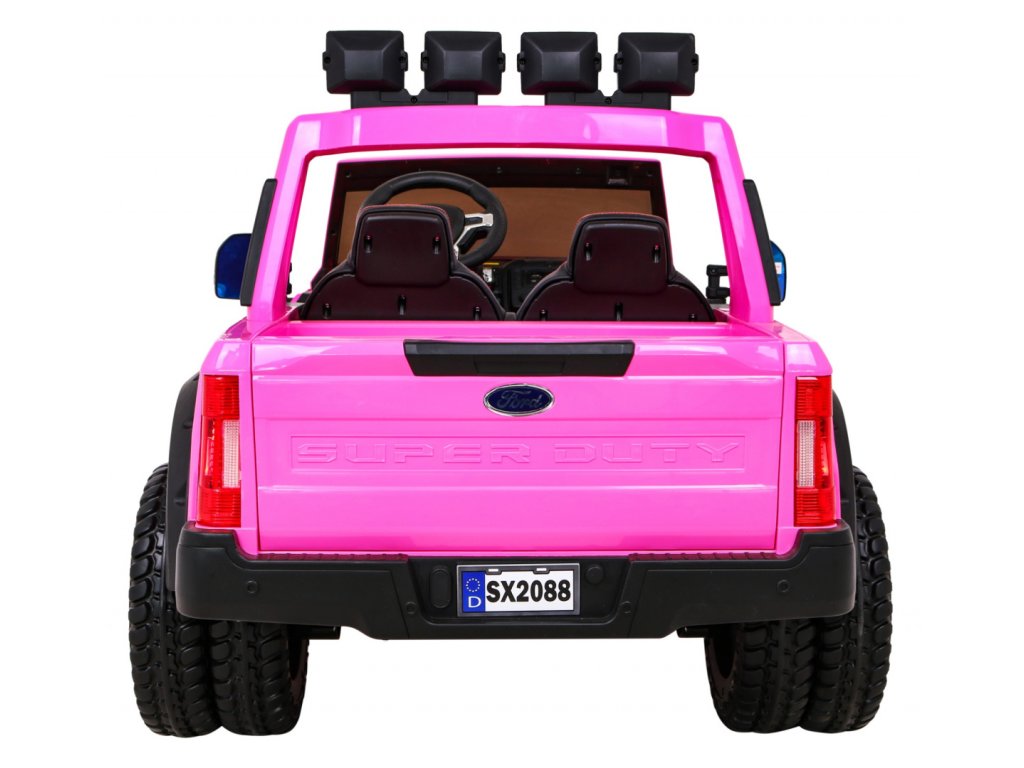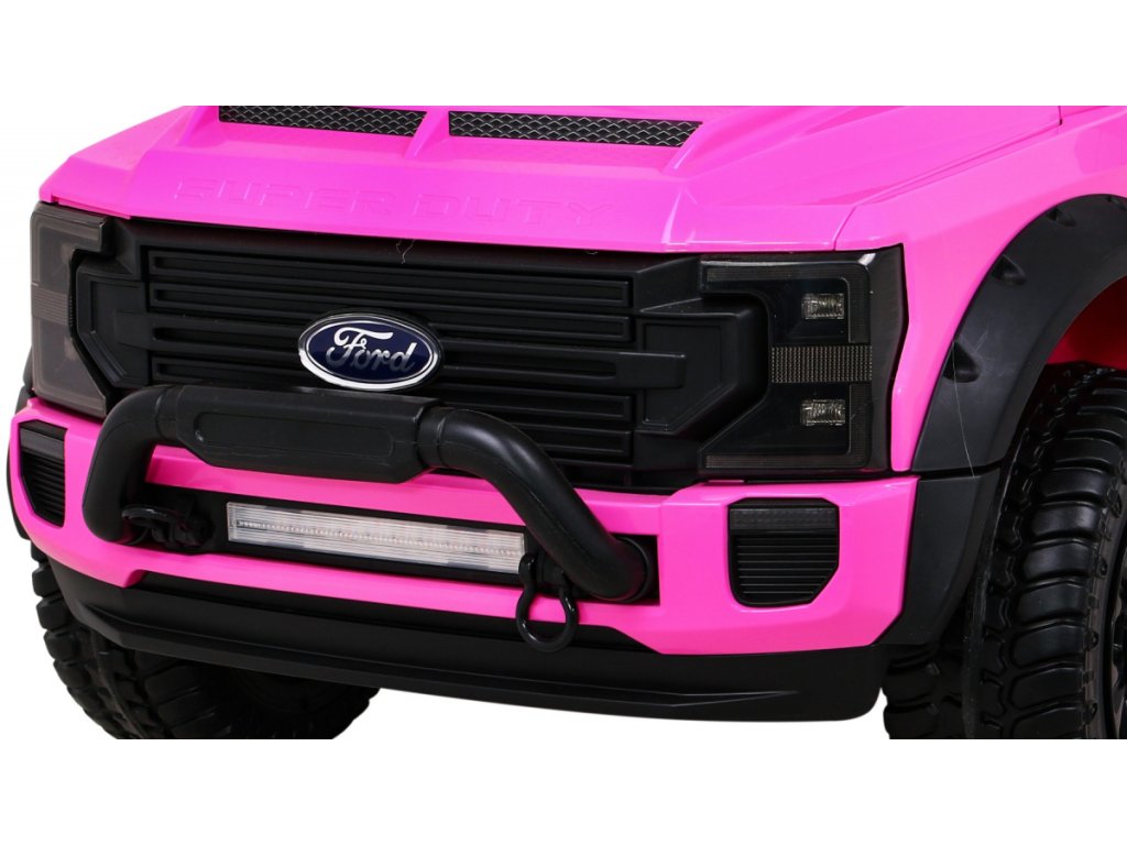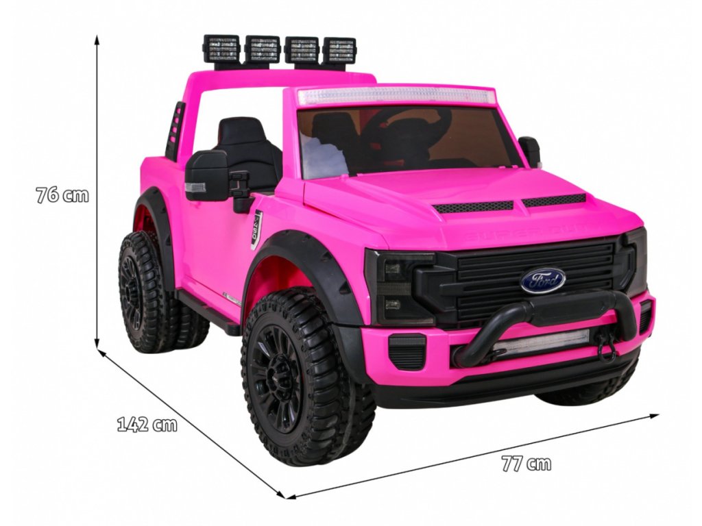 Детска електрическа кола е лицензиран продукт на марката Ford. Акумулаторна кола Ford Super Duty 4x4 розово разполага с четири мощни електрически мотора с мощност 45W и батерия 12V 14Ah. За комфортното шофиране допринасят големите EVA пянообразни гуми. Задните колела са двойни, което помага на колата да се справя с неравен терен и меки повърхности.