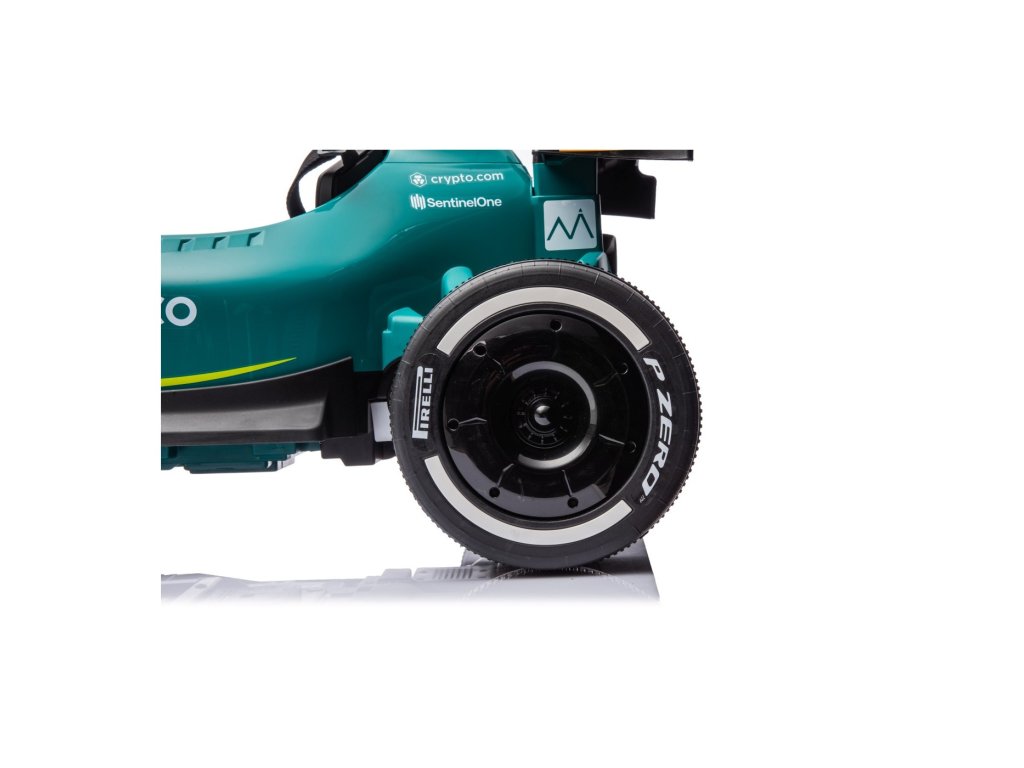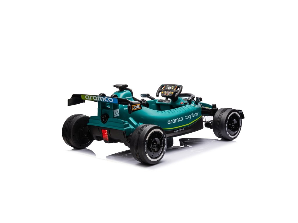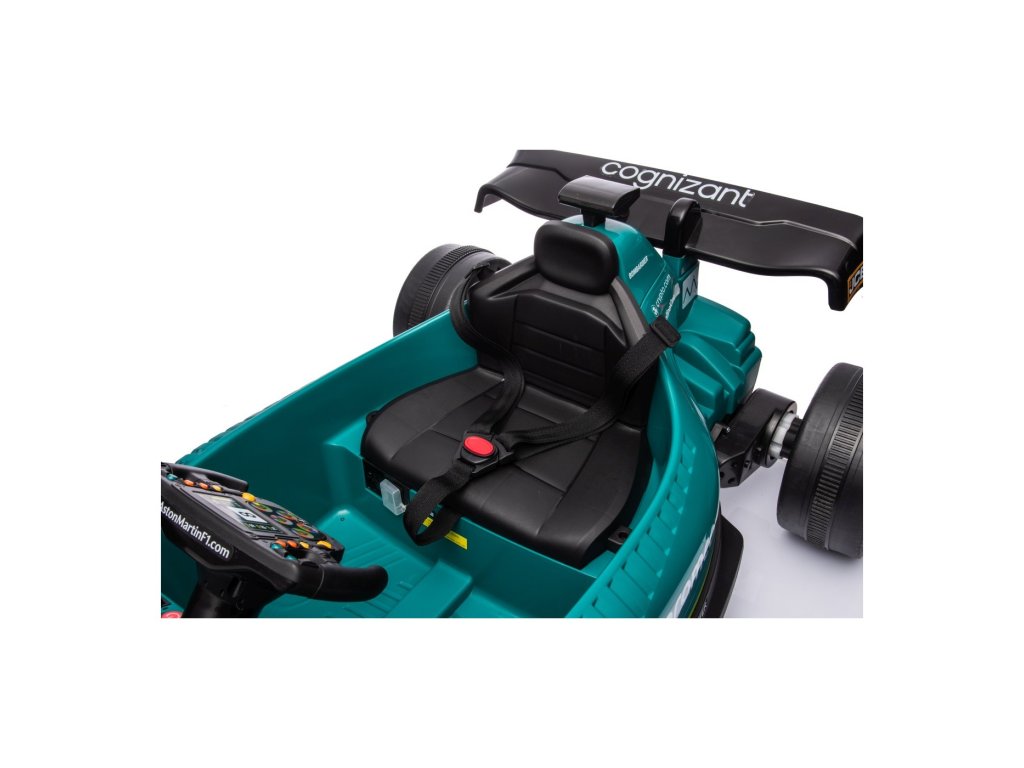 Акумулаторна кола Формула 1 Aston Martin Cognizant Aramco 24V зелена от утвърдената марка Aston Martin е задължителна за всяко детско пространство за игра. Колата се захранва от акумулатор с капацитет 24V 5Ah. Максималното натоварване на возилото е 30 кг. По време на каране детето със сигурност ще бъде впечатлено от музикалния панел с Bluetooth, MP3 и USB вход.