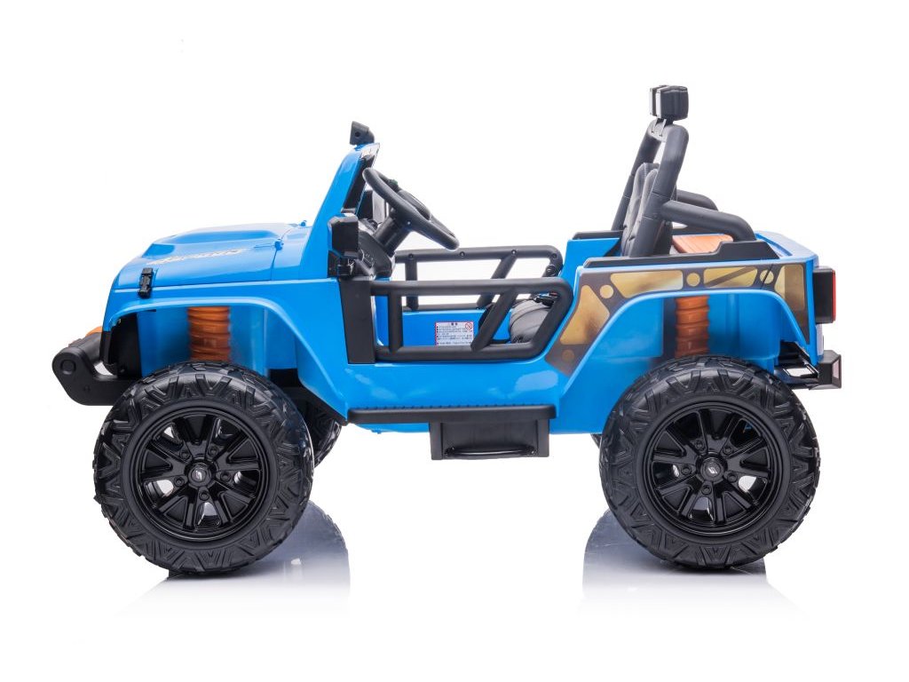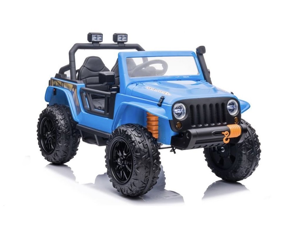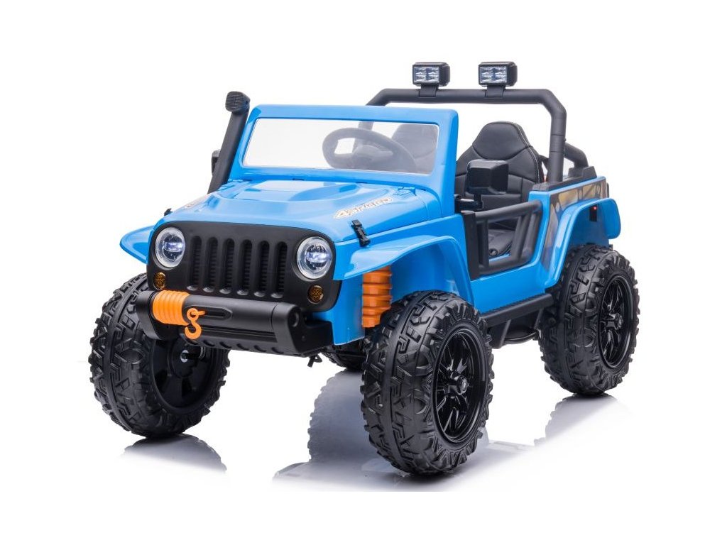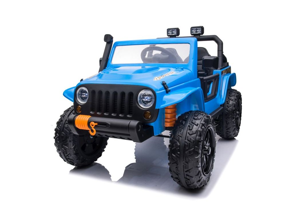 Акумулаторна кола Jeep 4Speed 24V | 4x200W синьо разполага с четири мотора с мощност 200W и акумулаторна батерия с капацитет 24V 7Ah. Колата има музикален панел с предварително записани мелодии и входове за USB и Bluetooth. На волана е разположен клаксон. Оборудвана е с предни LED фарове. Запалването става с ключ, като се чуват характеристични звуци от двигателя.