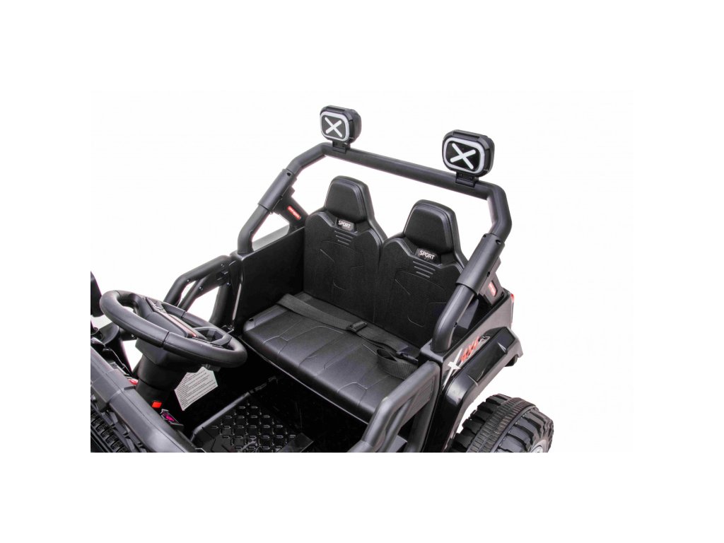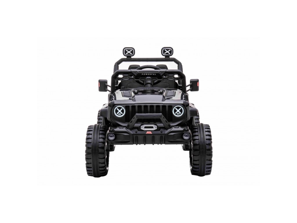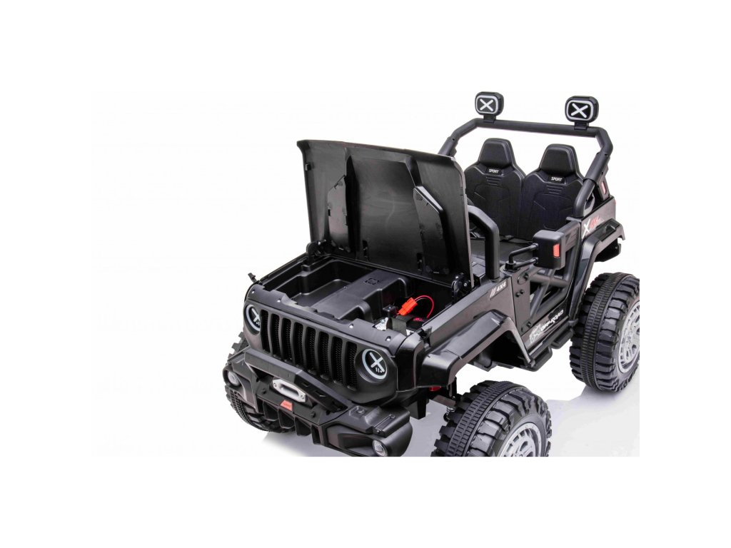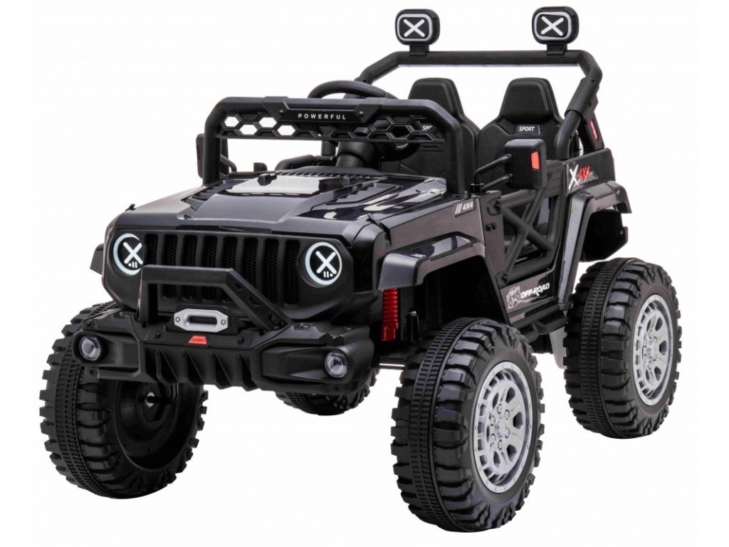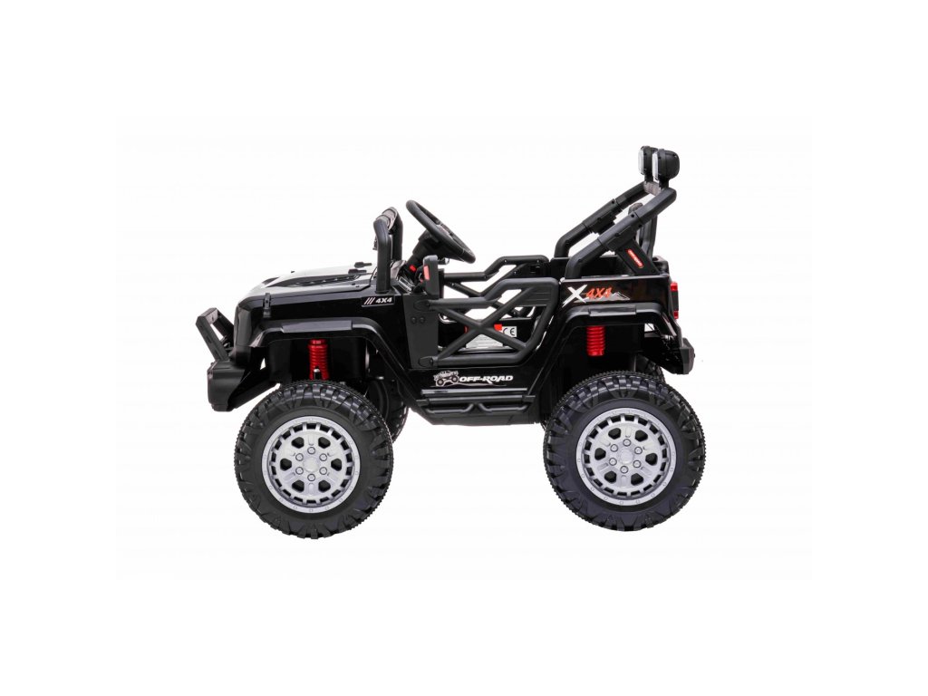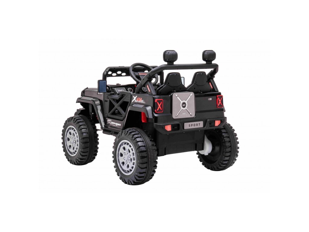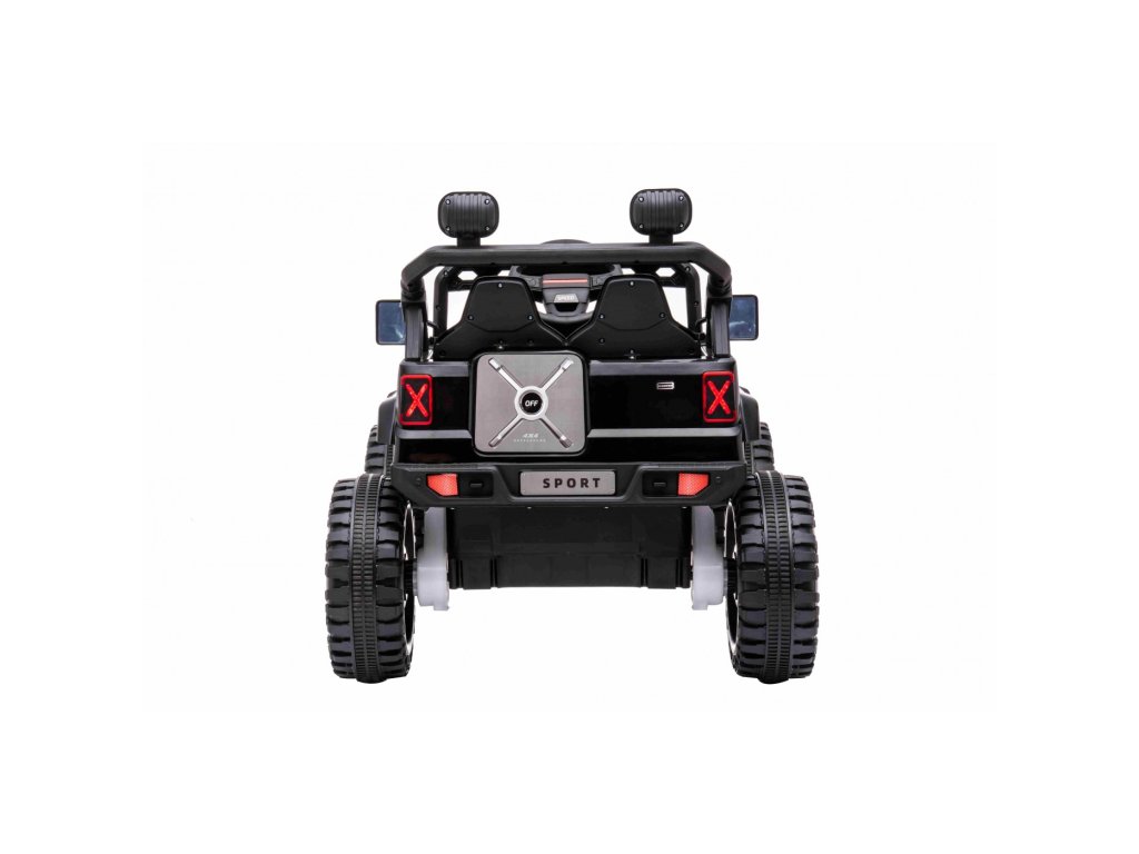 Акумулаторна кола jeep Off-road Speed 4x4 черно разполага с четири мотора с мощност 35W и две батерии с капацитет 12V 7Ah. Превозното средство издържа до 30 кг. За комфортна и плавна езда се грижат гумите от пяна EVA. Детето ви ще се забавлява с музикалния панел, който включва вградени мелодии, FM радио, Bluetooth, MP3 и вход за USB. Седалката е изработена от екологична кожа.