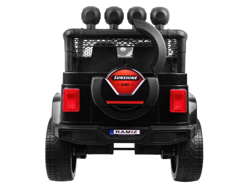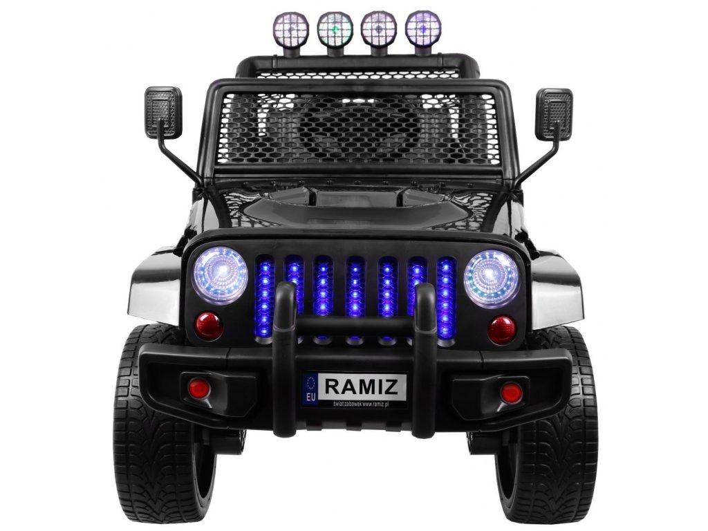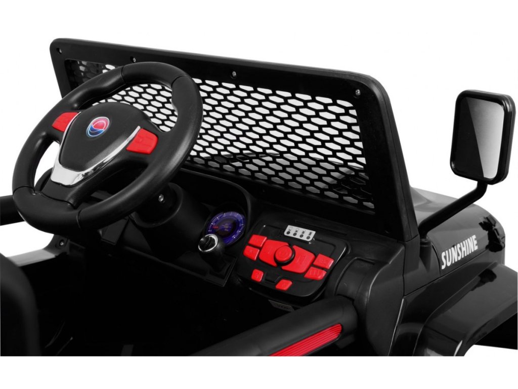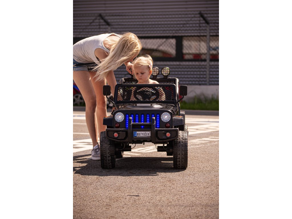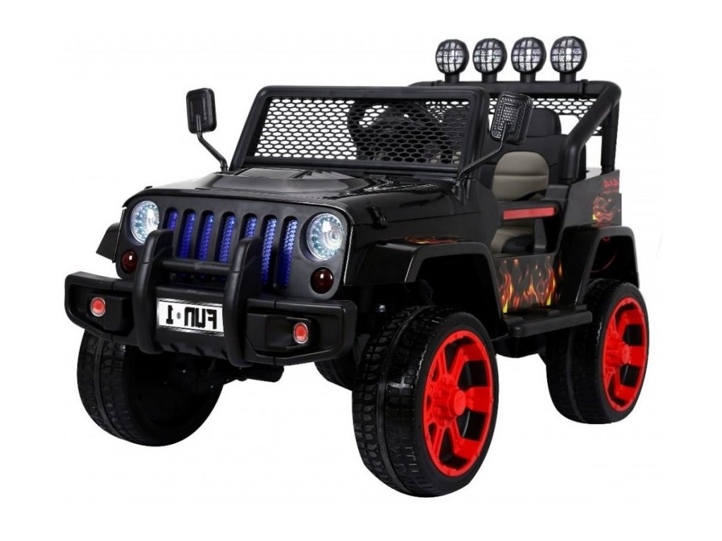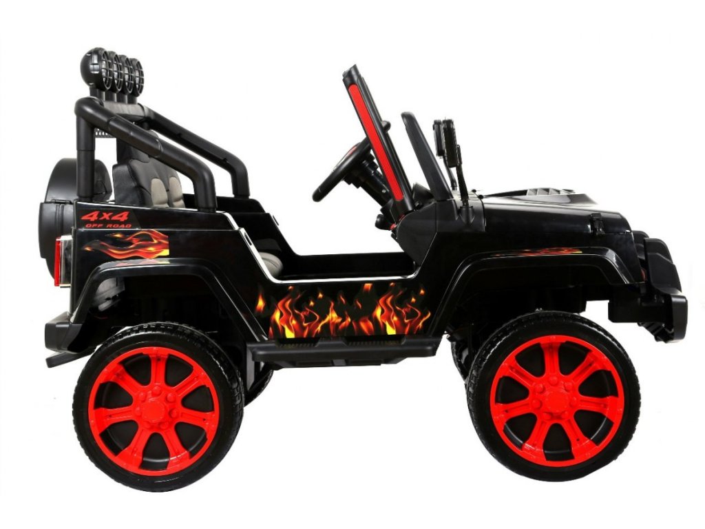 Детска акумулаторна кола Jeep Raptor 4x4 черна с пламъци с иновативно дистанционно управление, предназначено за родителите. Електрическата кола разполага с изключително удобна седалка, а за безопасността на детето е монтиран предпазен колан. Кола е оборудвана с табло, волан и светещи предни фарове и горна LED лента. Управлението на возилото може да се осъществява по два начина - чрез дистанционното за родители, които избират посоката и скоростта, или детето управлява колата самостоятелно. Jeep разполага с 4 мотора по 45W всеки, осигурявайки задвижване на всички 4 колела! Колелата са изработени от мек пянопласт EVA, което позволява плавно и комфортно возене без тропане. Jeep е перфектен избор за всички любители на големи автомобили!