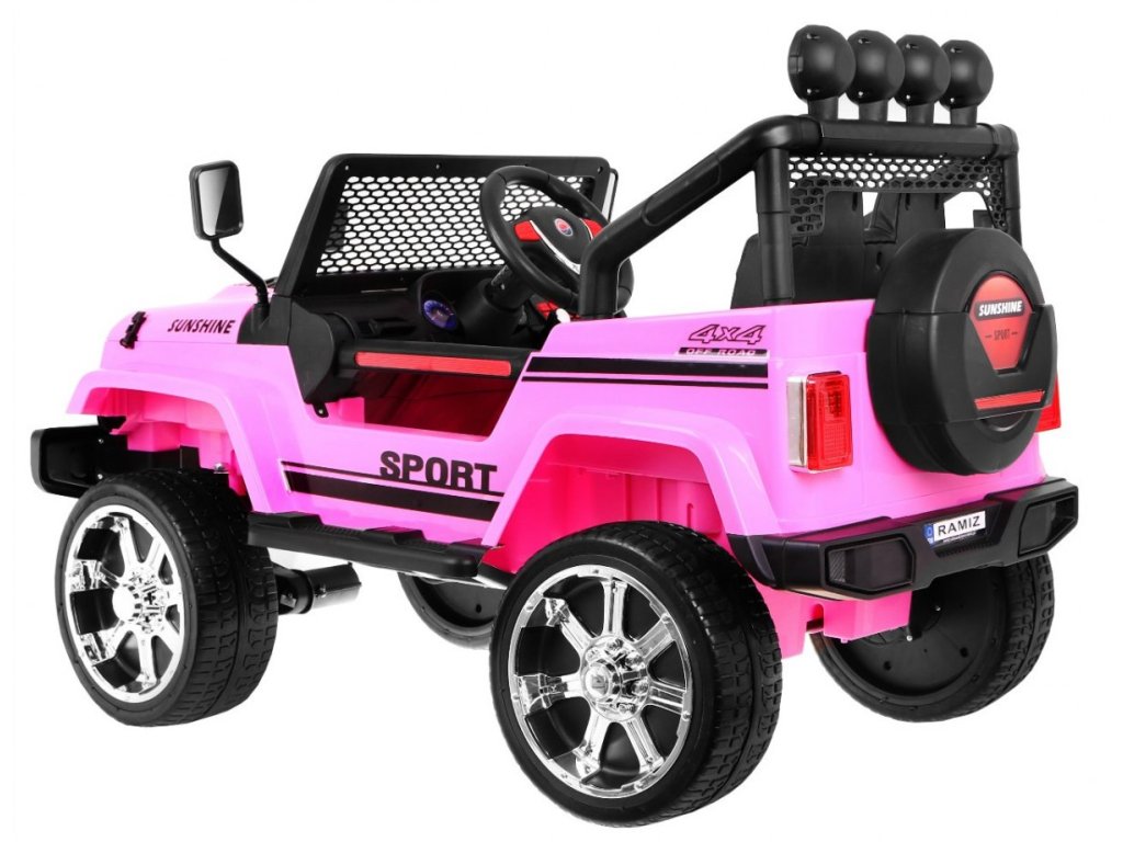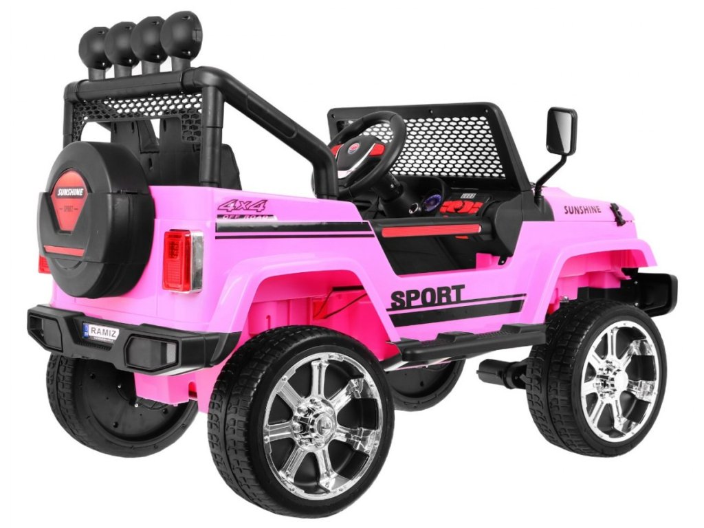 Детска акумулаторна кола Jeep Raptor 4x4 розово с иновативно дистанционно управление, предназначено за родители. Електрическата кола разполага с изключително комфортно седалче и за безопасността на детето има предпазен колан. Колата е оборудвана с табло, волан и светещи предни лампи и горен панел. Моделът може да се управлява по два начина – чрез дистанционното управление от родителя, който избира посоката и скоростта, или детето може да управлява самостоятелно. Jeep Raptor 4x4 розово има четири мотора, всеки с мощност 45W, което гарантира задвижване на всички 4 колела! Колелата са меки и изработени от EVA пяна, осигуряващи плавно и приятно каране без тропане. Jeep е идеален за всеки почитател на големите коли!