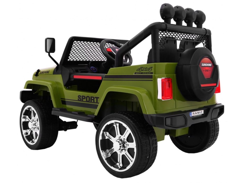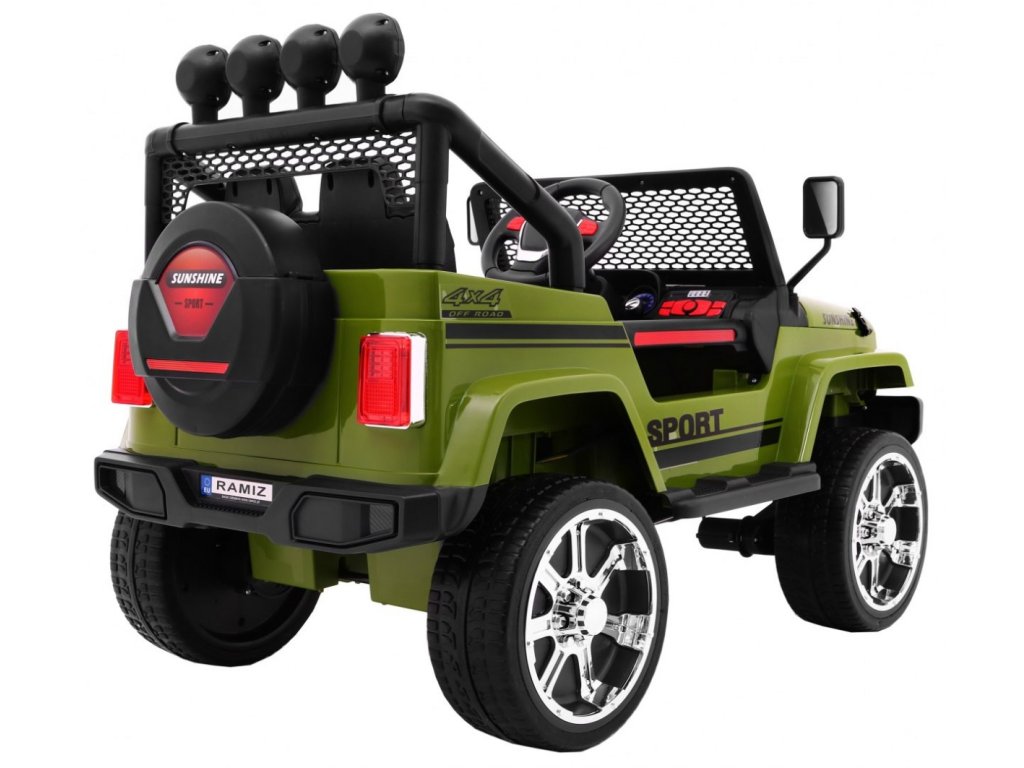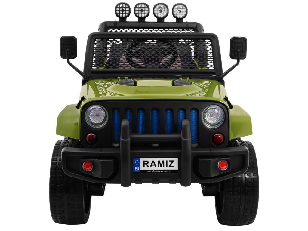 Детска акумулаторна кола Jeep Raptor 4x4 зелено с иновативно дистанционно управление, предназначено за родителите. Това електрическо детско возило разполага с много удобна седалка, оборудвана със защитен предпазен колан за безопасността на детето. Кола е снабдена с контролно табло, волан и светлини на предните фарове и горния панел. Управлението може да се осъществява по два начина – чрез дистанционното за родители, с което те избират посоката и скоростта, или детето кара самостоятелно. Jeep Raptor е с четири двигателя по 45W всеки, което осигурява задвижване на всичките 4 колела! Колелата са от мека EVA пяна, което гарантира плавно и комфортно возене без тропане. Тази акумулаторна кола Jeep Raptor 4x4 зелено е идеалният избор за всички любители на големите автомобили!