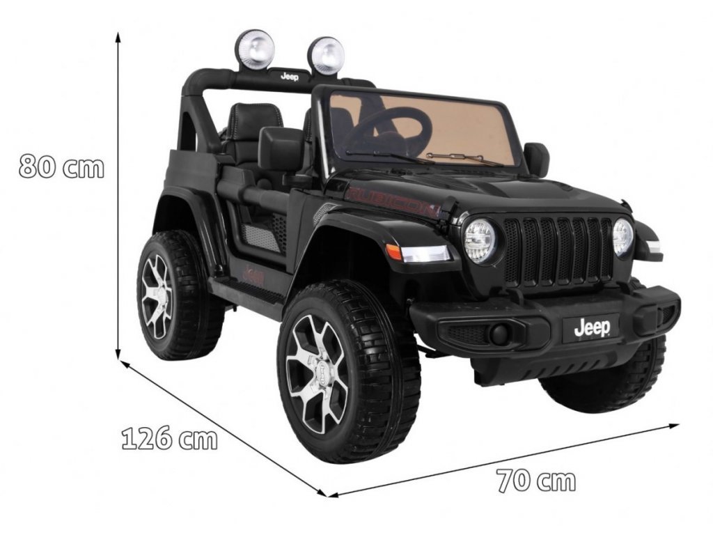 Още повече удоволствие при каране осигурява аудио панелът, оборудван с FM радио, Bluetooth, AUX, SD и USB вход. Акумулаторната кола е с осветителни ефекти – светлини отпред и отзад с LED технология. Jeep Wrangler Rubicon се стартира с метални ключета. Комфортът на водача се гарантира от ергономично оформената седалка от еко кожа и меките EVA пянообразни гуми. Тези гуми са безшумни и се адаптират както на твърди, така и на неравни терени.
