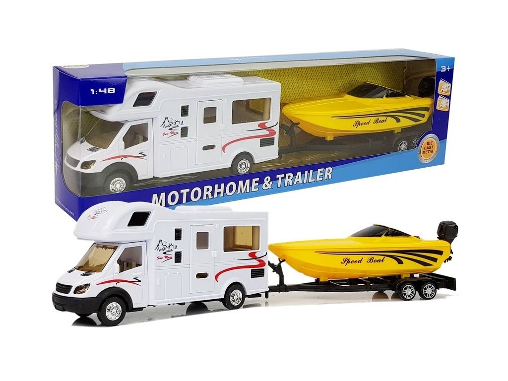 Идеалната комбинация за почивка край езеро или море. Този комплект със сигурност ще събуди у детето ви спомени за летните ваканции. Акумулаторна кола караван с лодка 1:48 разполага с движещ се механизъм – просто го навиете и тя ще потегли. Лодката можете да вземете навсякъде със себе си и да я прикачите зад каравана.