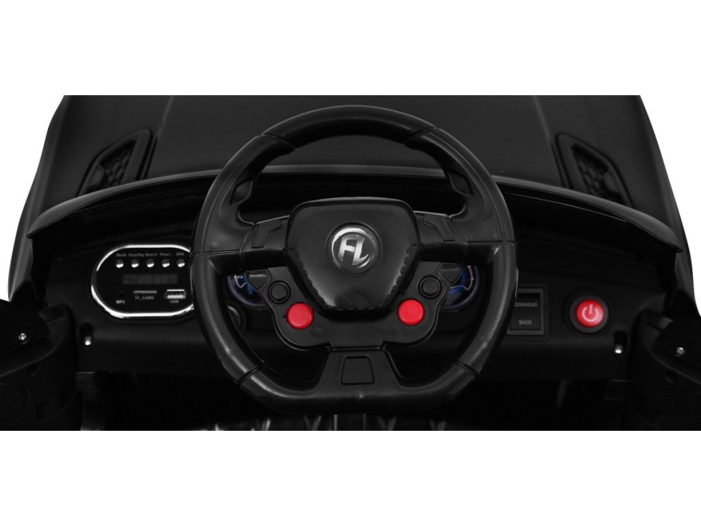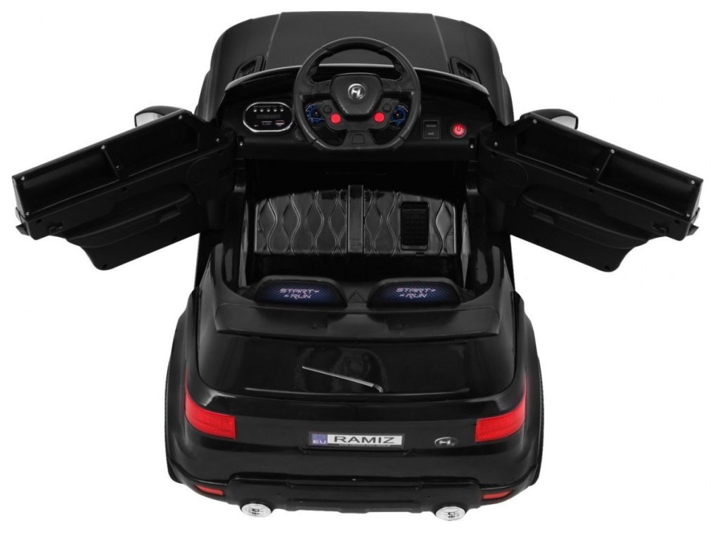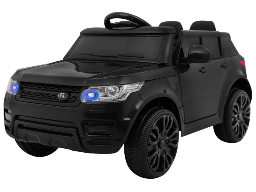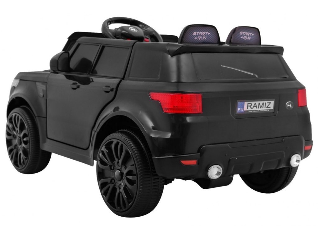 Акумулаторна кола Land Rapid Racer черна ПОСТРАДАЛА ОПАКОВКА лесно се справя с неравен, утъпкан или неутъпкан терен и лек наклон до 10%. Освен това количката има предни и задни LED светлини, обезопасителни колани, странични огледала и звуци от волана и клаксона. Към количката може да се включи Mini Jack кабел, включен в комплекта, за слушане на MP3 файлове. Също така има и USB вход.