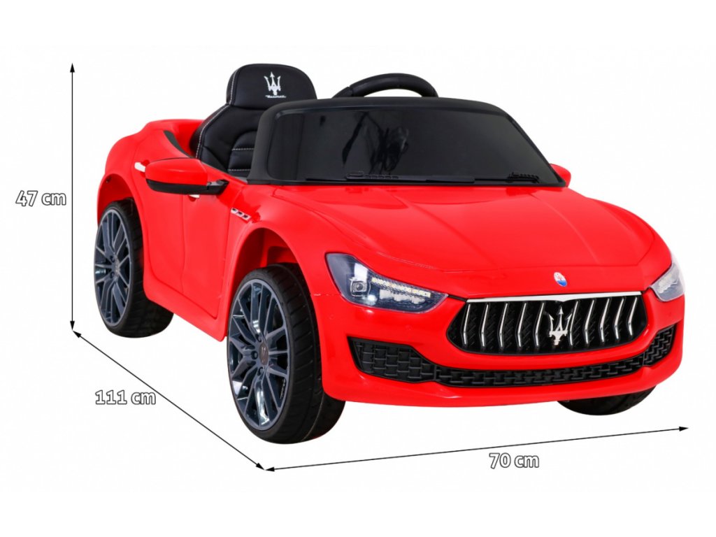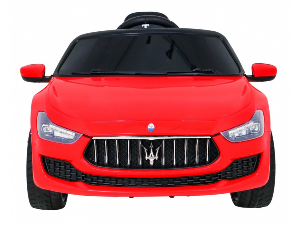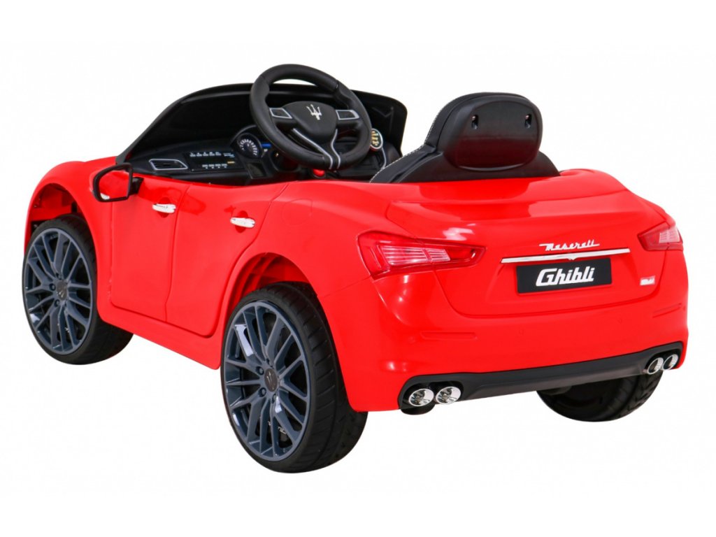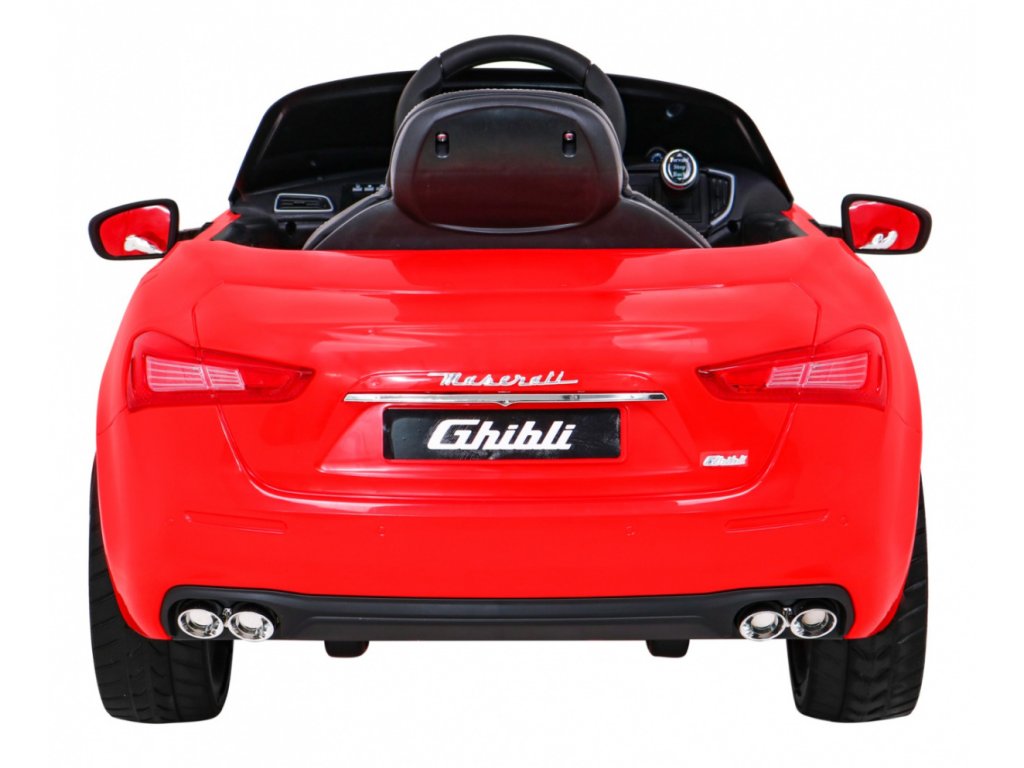 Акумулаторна кола Maserati Ghibli червено е оборудвана с два мотора с мощност 12V и 16 000 оборота в минута, както и с акумулаторна батерия с капацитет 12V 7Ah. Колата разполага с предни и задни LED светлини. Има инсталиран музикален панел, който включва MP3, вход за SD карта, AUX, USB и предварително записани мелодии. На волана е разположен клаксон.
