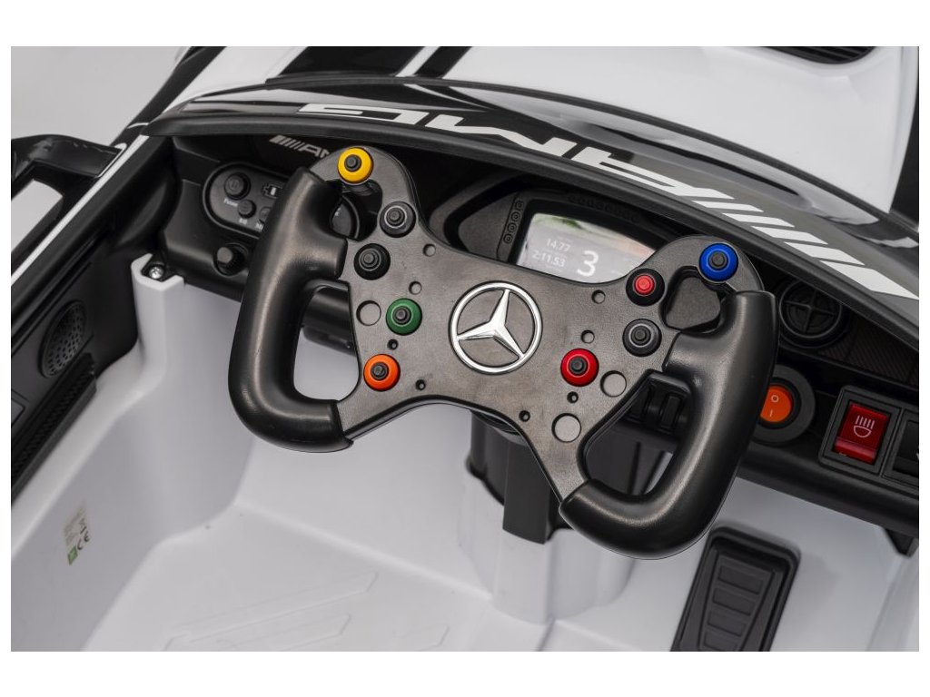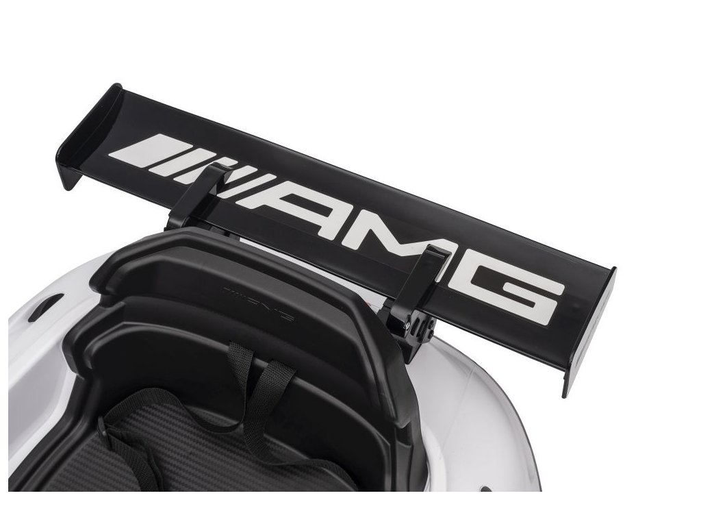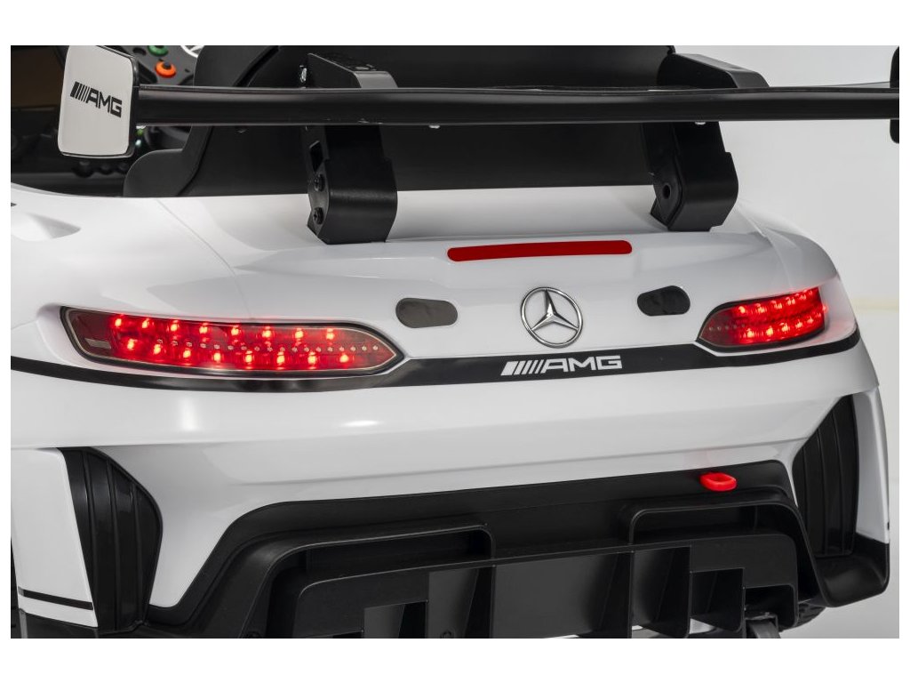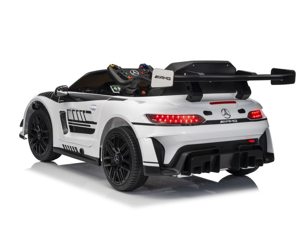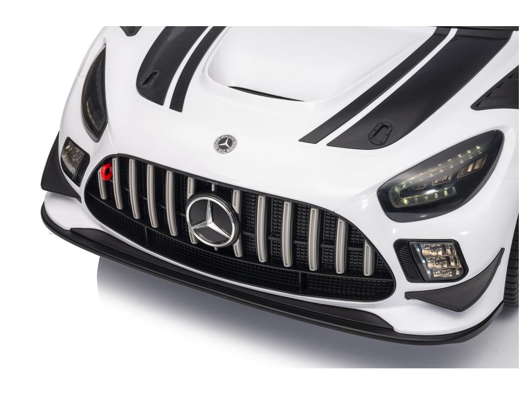 Акумулаторната кола Mercedes AMG GT3 бяла е незаменим елемент във всяко детско игрално пространство. Колата се захранва от батерия с капацитет 12V 4,5Ah. В оборудването ѝ влизат седалка, облечена в еко кожа, пенни EVA гуми и предно и задно LED осветление. Максималното натоварване на колата е 30 кг. По време на каране детето ще бъде привлечено от музикалния панел с Bluetooth.