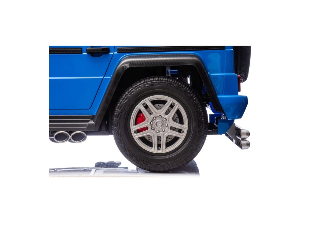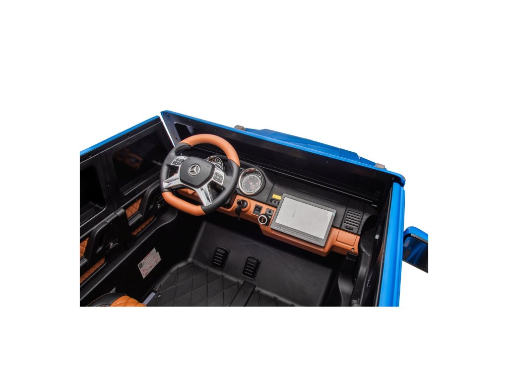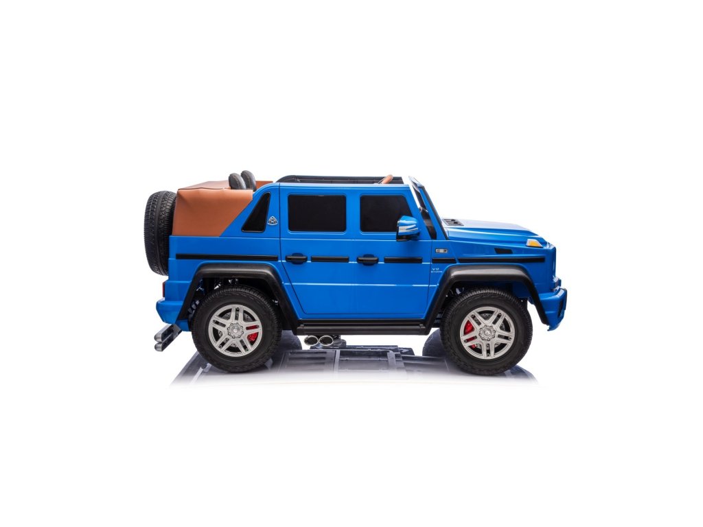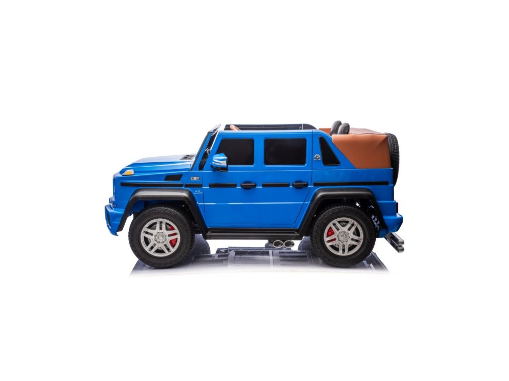 Акумулаторна кола Mercedes Benz MAYBACH G650 MP4 синьо е ексклузивно електрическо превозно средство за деца, което съчетава изключителен комфорт, максимална мощност и модерни технологии. Четири мощни мотора с обща мощност 200W заедно с батерия 24V 14Ah осигуряват плавно и силно движение дори в по-тежък терен. Меки EVA гуми и задно окачване допринасят за комфортно возене на всякакъв тип повърхности.