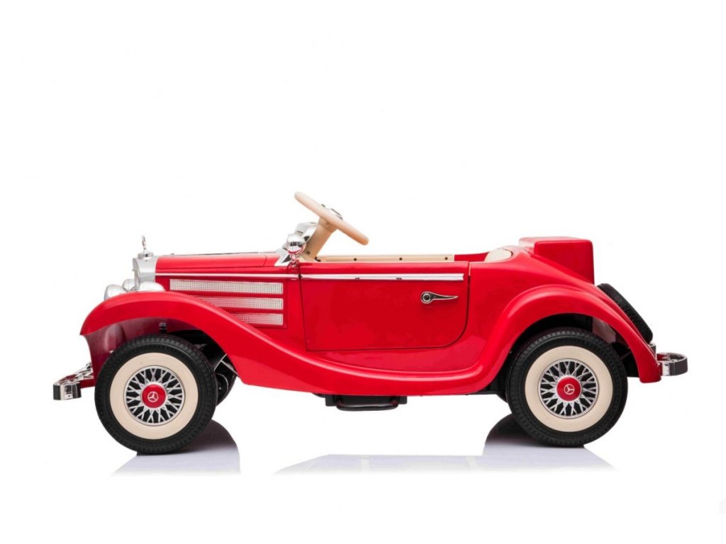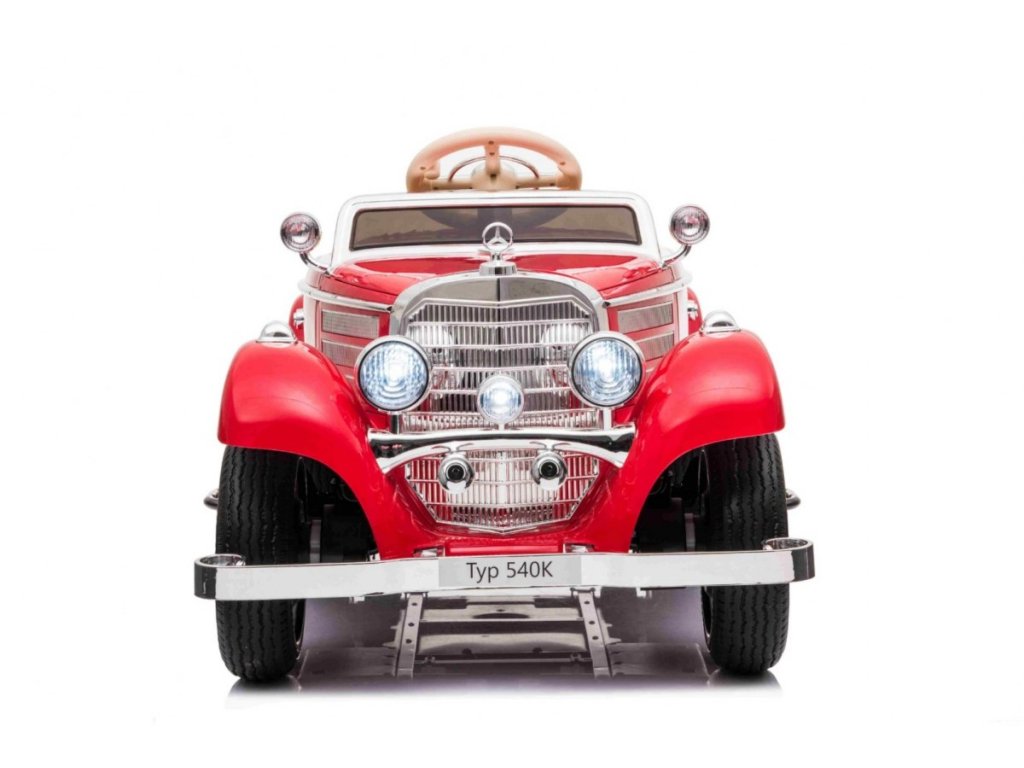 Детска акумулаторна кола с лицензия от Mercedes Benz. Колата Mercedes Benz Retro 540K 4x4 червена е подходяща за всички деца с максимално натоварване до 100 кг. Оборудвана е с четири електрически мотора по 35W и комбинирана с гуми от EVA материал, осигуряващи добро сцепление на различни настилки. Детето се настанява в удобно оформено седало от мека, екологична кожа.