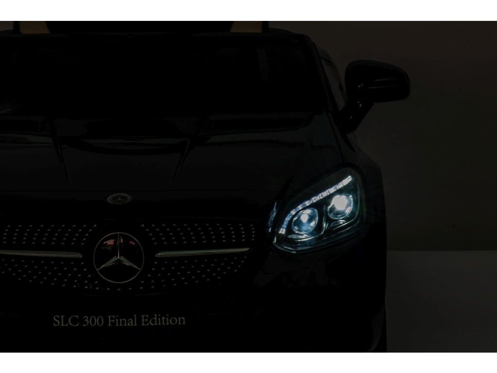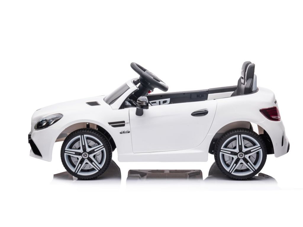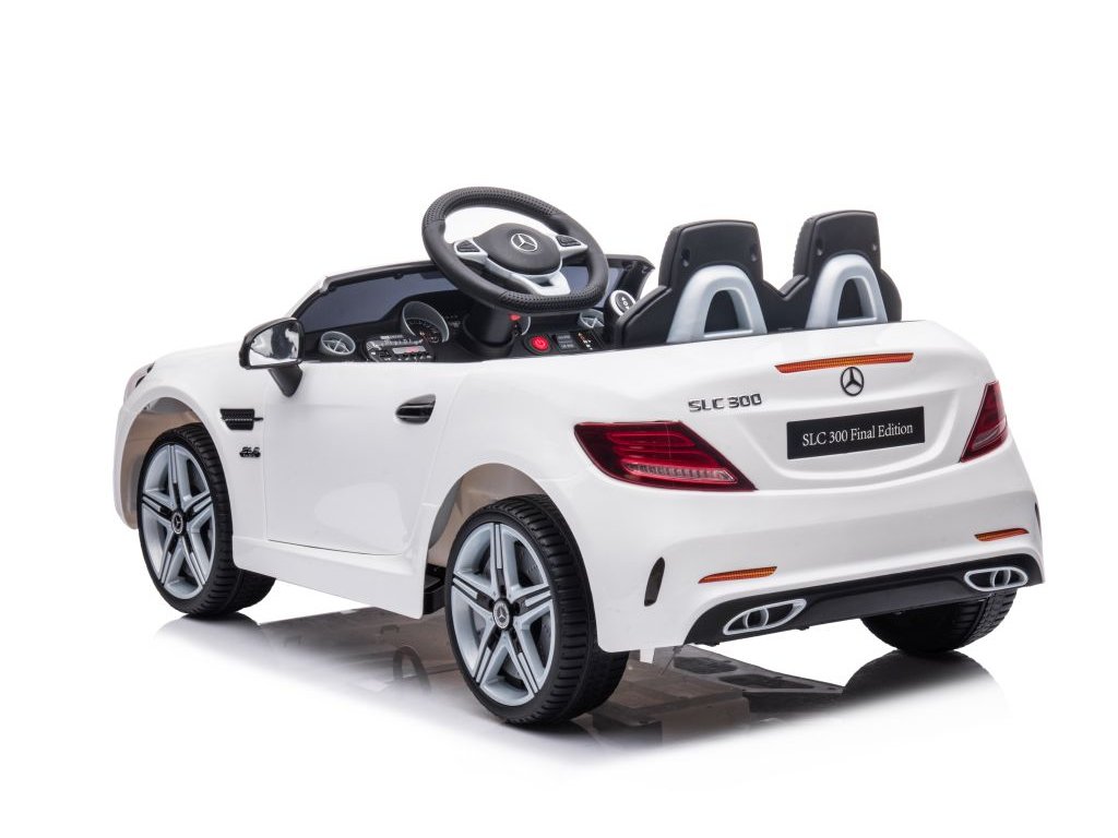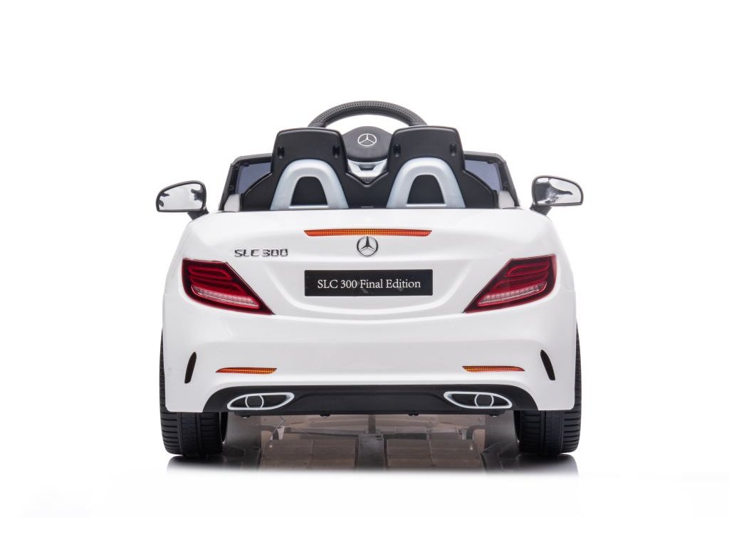 Акумулаторната кола Mercedes Benz SLC 300 бяла има удобна седалка от мека еко кожа с предпазни колани. Освен това е оборудвана с музикален панел с входове за MP3 и USB и разполага с предварително записани мелодии. Превозното средство има предно и задно LED осветление.