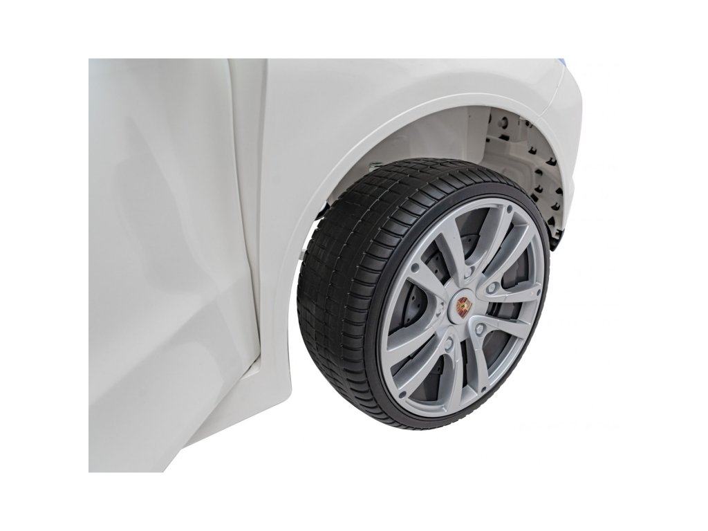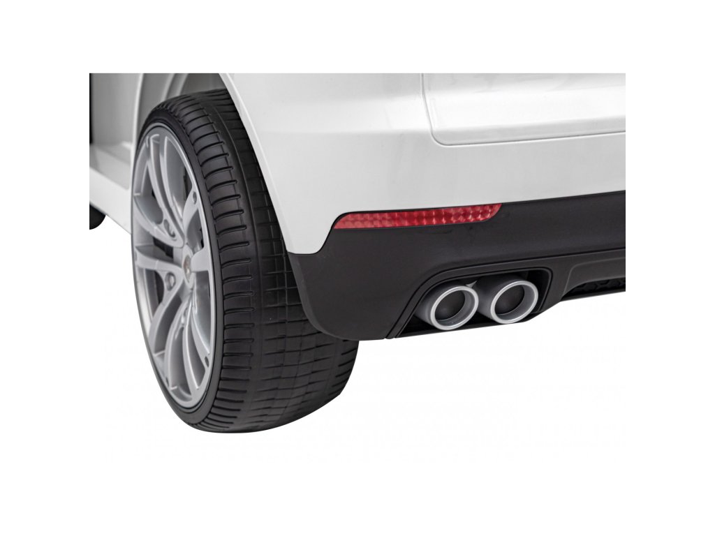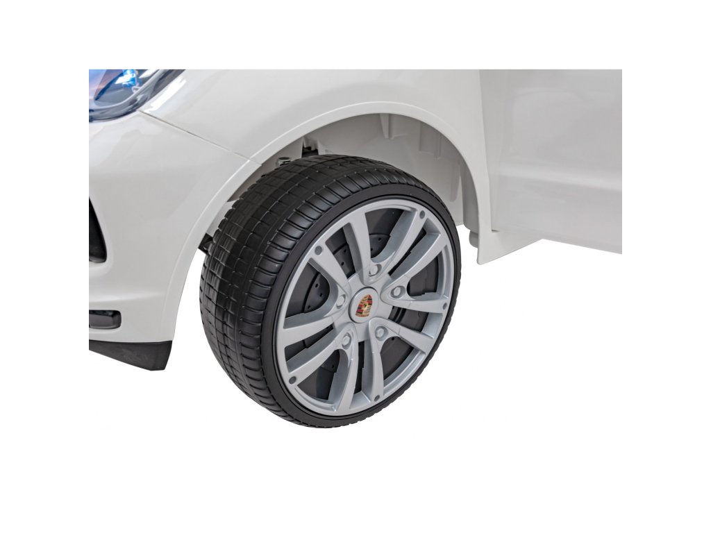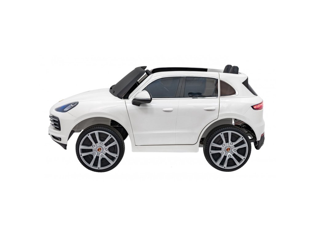 Акумулаторната кола Porsche Cayenne S бяла разполага с два двигателя с обща мощност 70W и батерия с капацитет 12V 7Ah. За комфортно каране се грижат пенометални EVA гуми и седалка, облицована с еко кожа. На детето със сигурност ще му хареса музикалният панел с MP3, USB, AUX вход и слот за SD карта. Товароносимостта на колата е 30 кг. Колата е оборудвана с предно и задно LED осветление и врати, които се отварят.