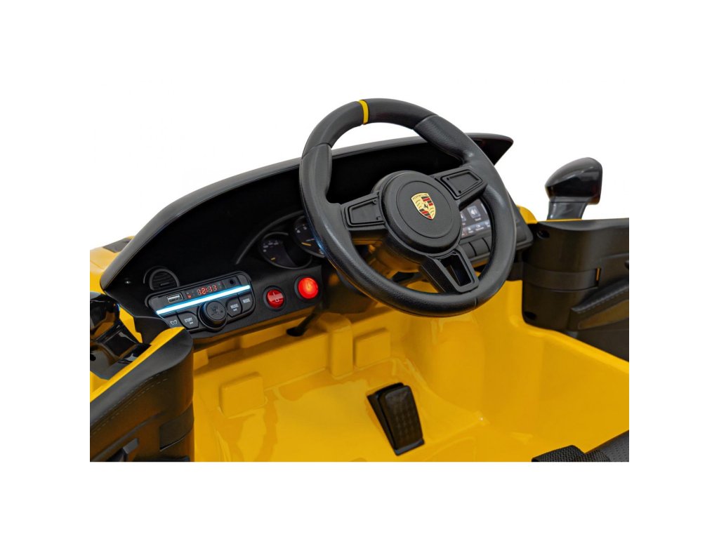 Акумулаторната кола Porsche Spyder RS 718 жълта лакирана е оборудвана с два мотора с обща мощност от 90W и батерия с капацитет 12V 7Ah. За комфортно каране се грижат пяната EVA гуми и седалка, покрита с екологична кожа. Детето ще се радва на музикалния панел с MP3, USB, AUX, Bluetooth и радио. Максималното натоварване е 30 кг. Колата разполага с предно и задно LED осветление и врати, които се отварят.