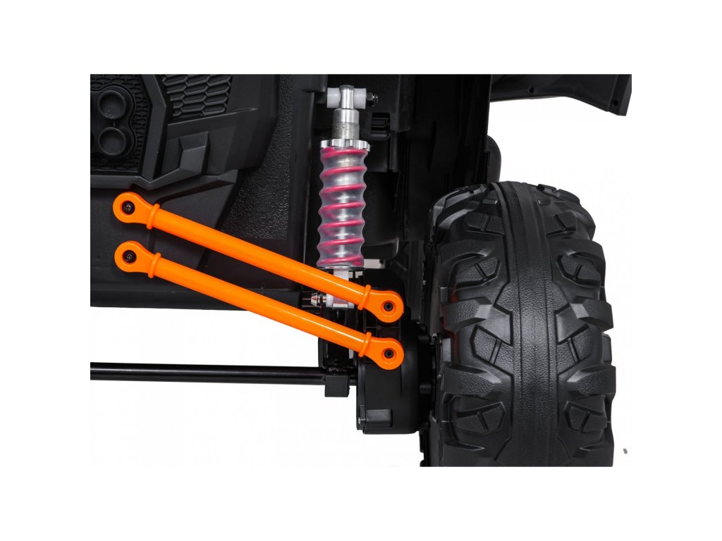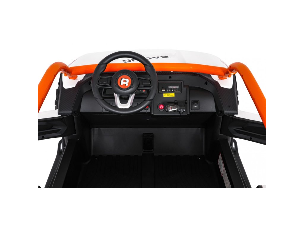 Два отделни седалки с покритие от еко кожа са оборудвани със безопасни колани и позволяват каране на две деца едновременно. Отварящи се врати със заключване гарантират лесно и безопасно качване. LED осветление отпред и отзад, реалистични звуци на двигателя и други аудио ефекти придават автентично изживяване при шофиране. Мултимедиен панел позволява свързване чрез USB, AUX и MP3, има и FM радио, както и контролни бутони на волана.