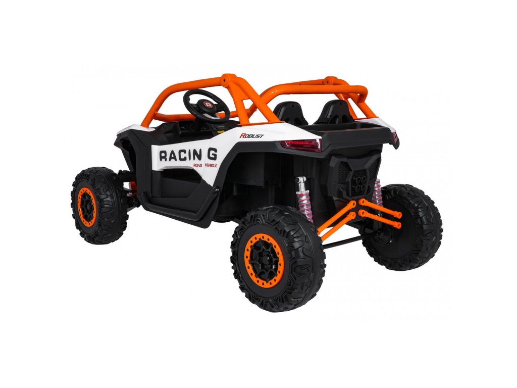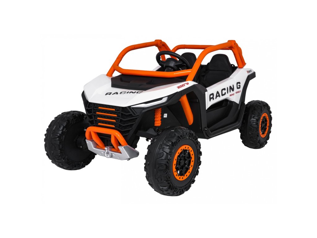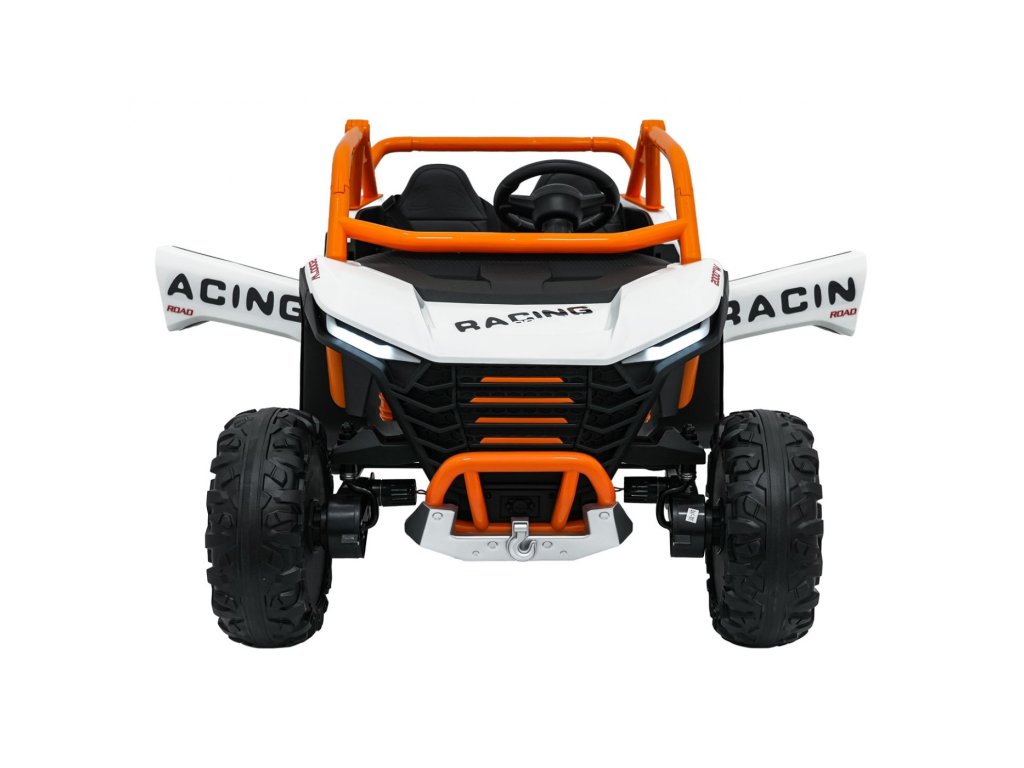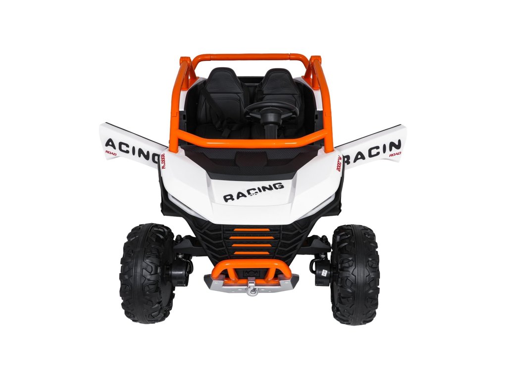 Акумулаторна кола RACING Road 2000 4x120W 24V бяла е здрав и многофункционален модел за двама малки шофьори, които искат да се впуснат в истинско приключение. Благодарение на четирите мощни мотора (4 × 120W) и силната акумулаторна батерия 24V 7Ah, автомобилът се справя отлично не само на равни повърхности, но и на леко неравен терен. Меки амортизиращи EVA гуми и регулируемо задно окачване осигуряват комфортно каране без излишни сътресения, докато функцията на плавен старт (soft start) допринася за безопасност и удобство.
