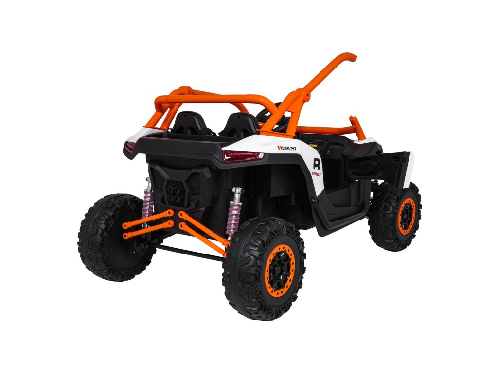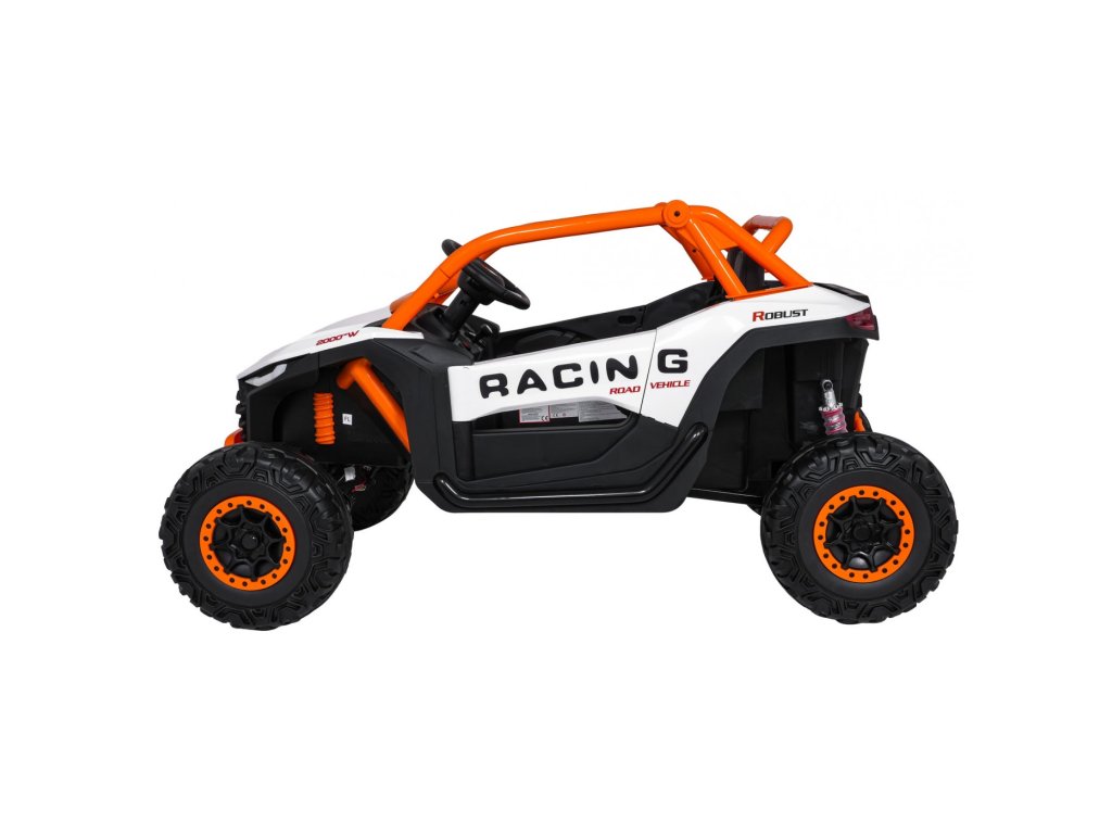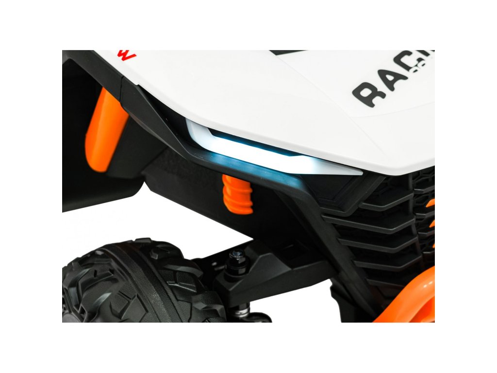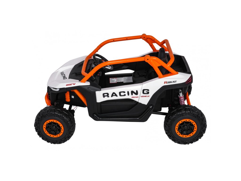 Акумулаторна кола RACING Road 2000 4x120W 24V бяла е здрав и многофункционален модел за двама малки шофьори, които искат да се впуснат в истинско приключение. Благодарение на четирите мощни мотора (4 × 120W) и силната акумулаторна батерия 24V 7Ah, автомобилът се справя отлично не само на равни повърхности, но и на леко неравен терен. Меки амортизиращи EVA гуми и регулируемо задно окачване осигуряват комфортно каране без излишни сътресения, докато функцията на плавен старт (soft start) допринася за безопасност и удобство.
