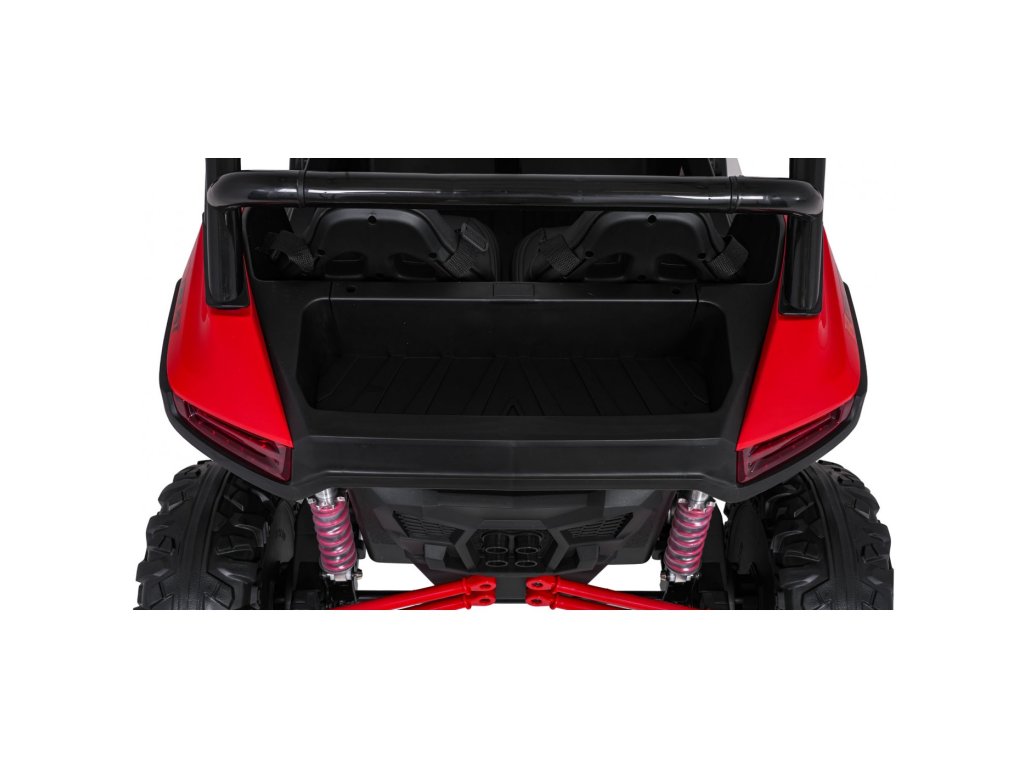 Два отделни седалки с покритие от еко кожа са оборудвани с колани за безопасност и позволяват возене на две деца едновременно. Отварящи се врати с предпазна ключалка осигуряват лесно и безопасно качване и слизане. LED светлини отпред и отзад, реалистични звуци на мотор и други аудио ефекти предлагат автентично изживяване при шофиране. Мултимедийният панел поддържа свързване чрез USB, AUX и MP3, има също FM радио и бутони за управление на волана.