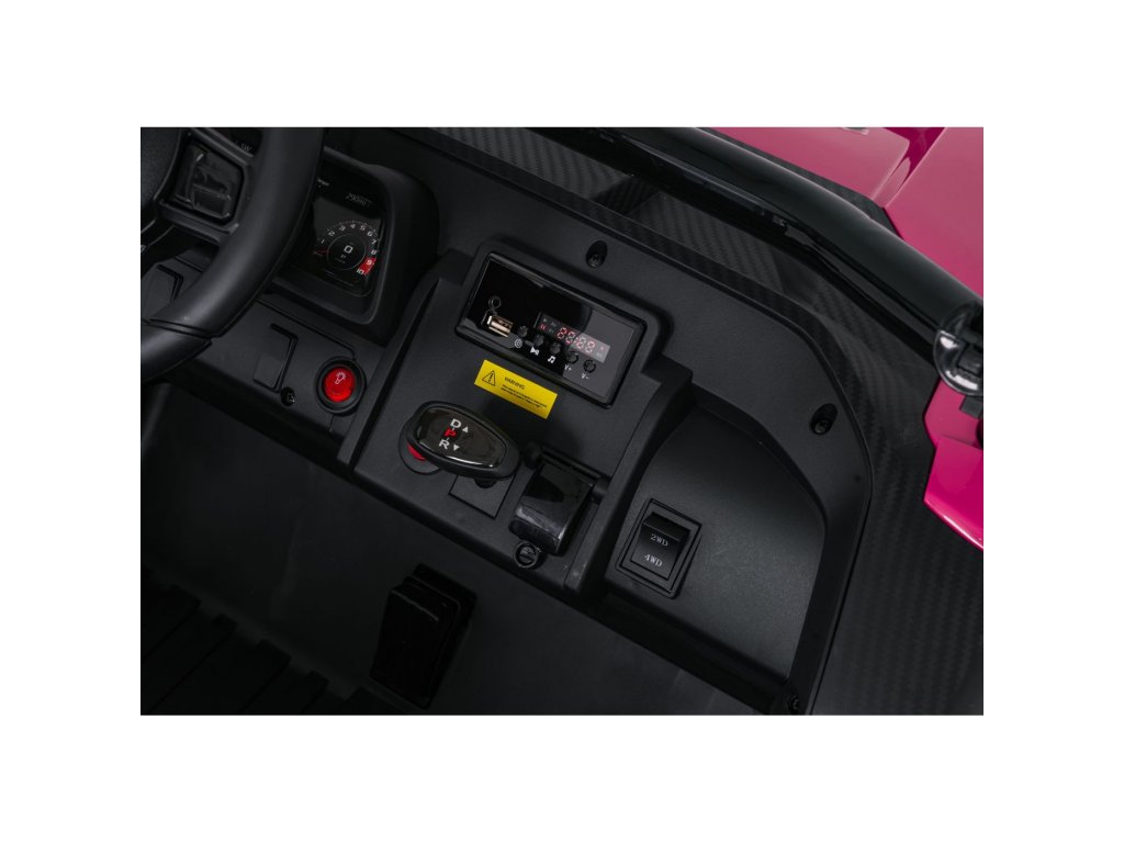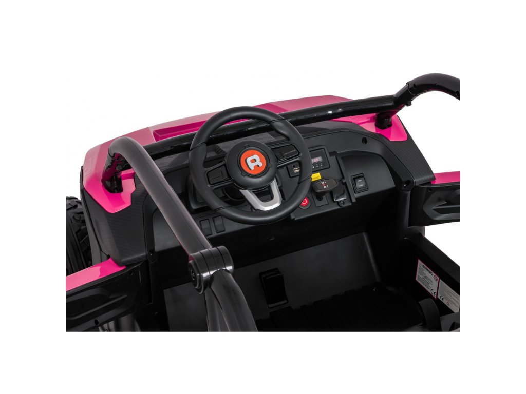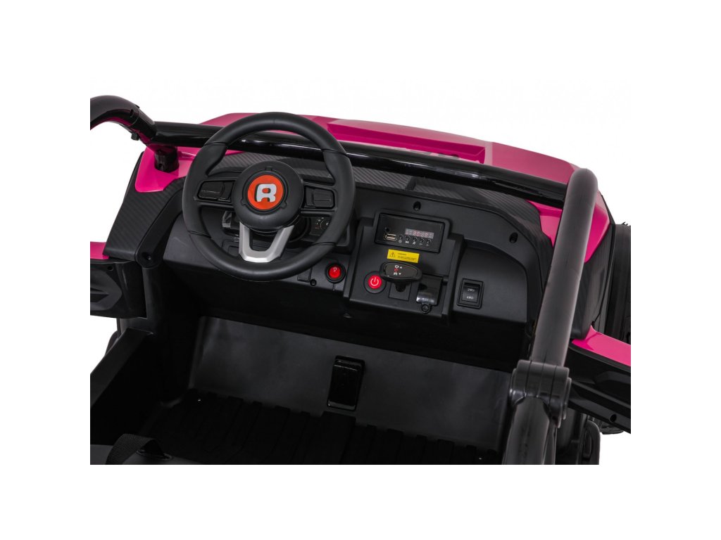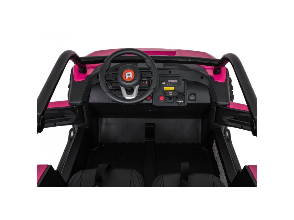 Двойни самостоятелни седалки с покритие от еко кожа, оборудвани с колани за безопасност, позволяват возене на две деца едновременно. Отварящи се врати със защитна ключалка осигуряват лесно и безопасно качване. LED светлини отпред и отзад, реалистични звуци на мотор и допълнителни аудио ефекти доставят автентично усещане при шофиране. Мултимедиен панел позволява връзка чрез USB, AUX и MP3, налично е FM радио и контролни бутони на волана.