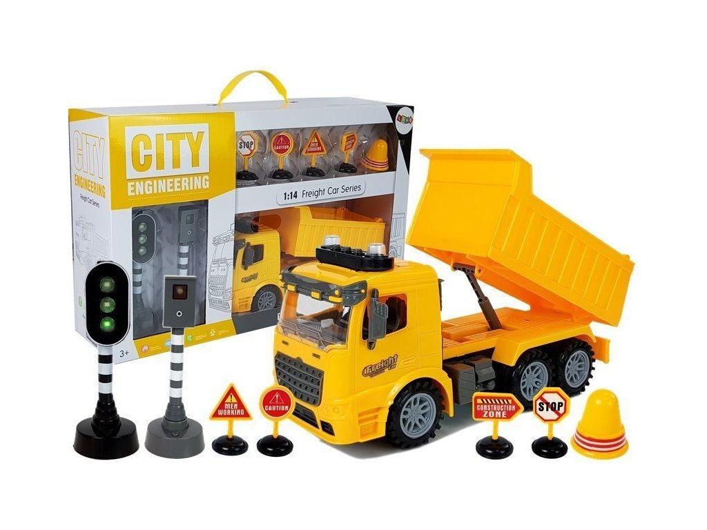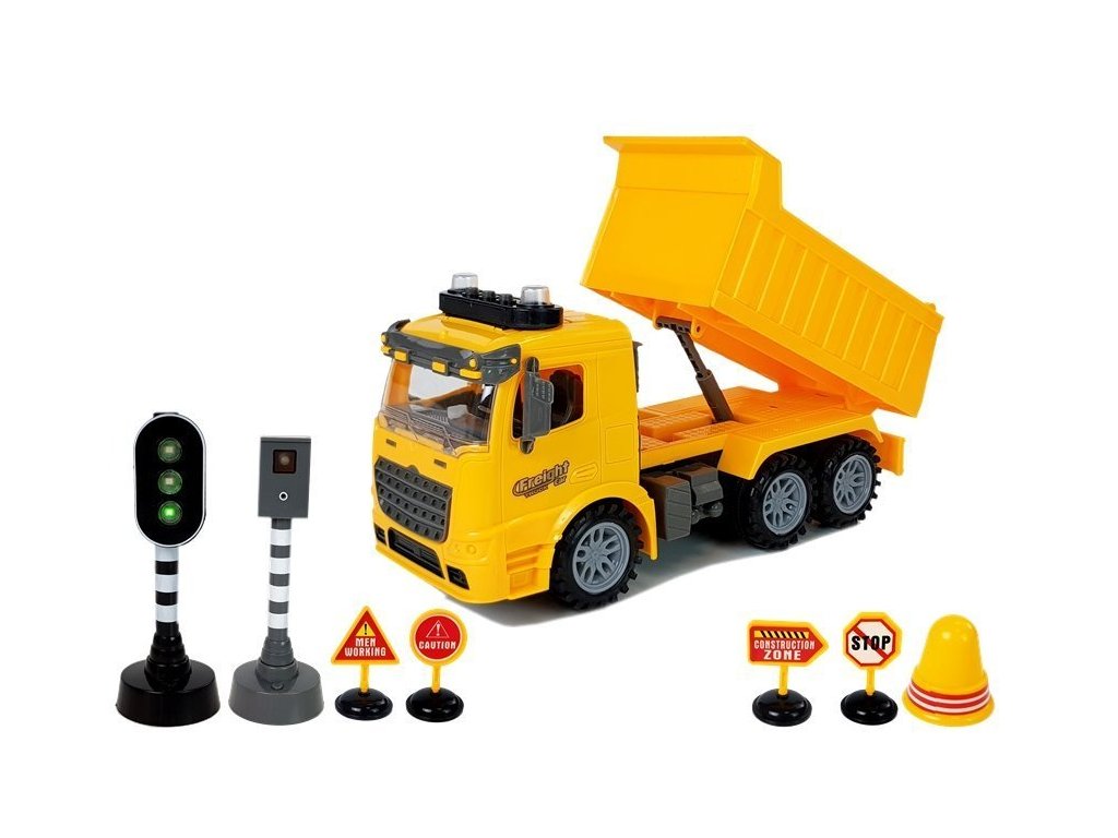 Акумулаторна кола самосвал с пътни знаци е превозно средство, което можете да използвате за игра и придвижване по детски строителни площадки. Разполага с светлинни и звукови ефекти (стартиране на мотор, движение назад, клаксон). В комплекта са включени пътни знаци и светофари, които могат да бъдат поставени на определени места.