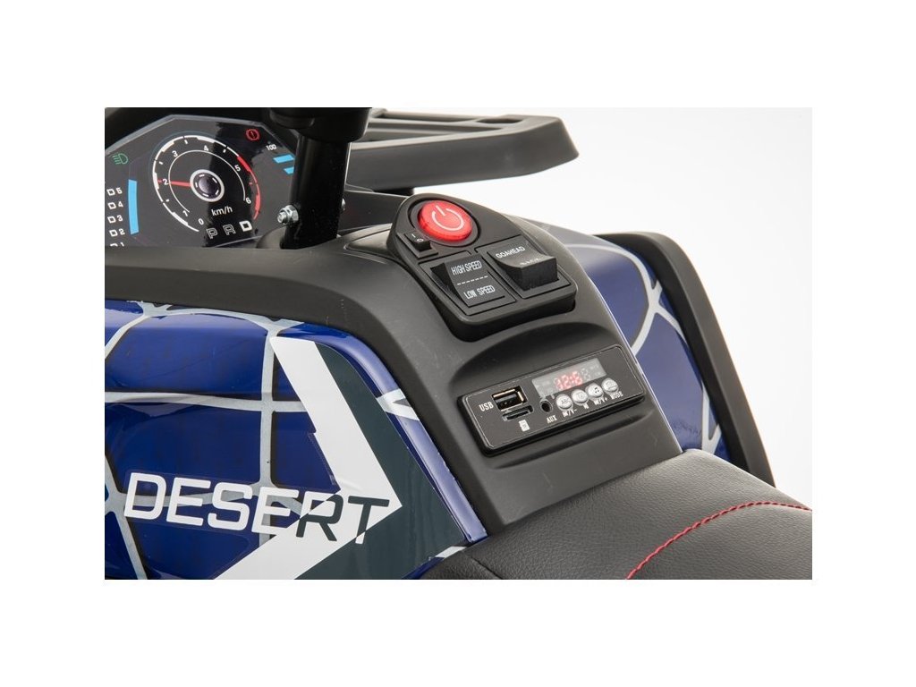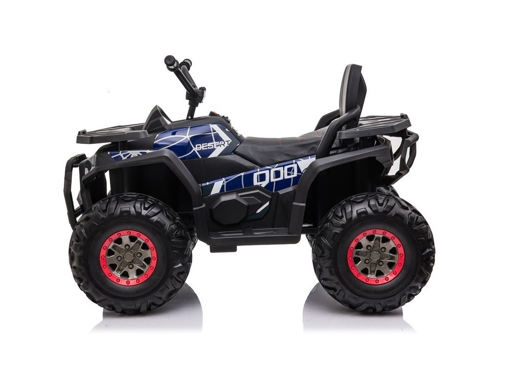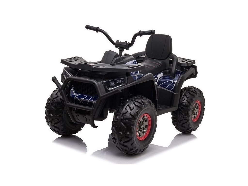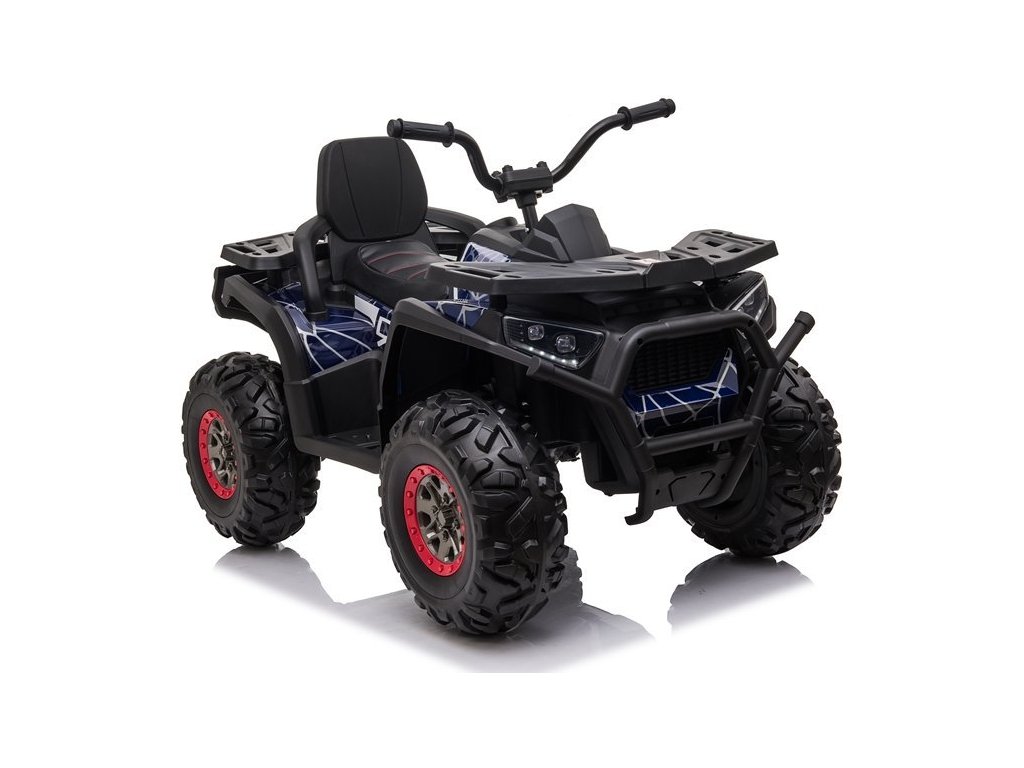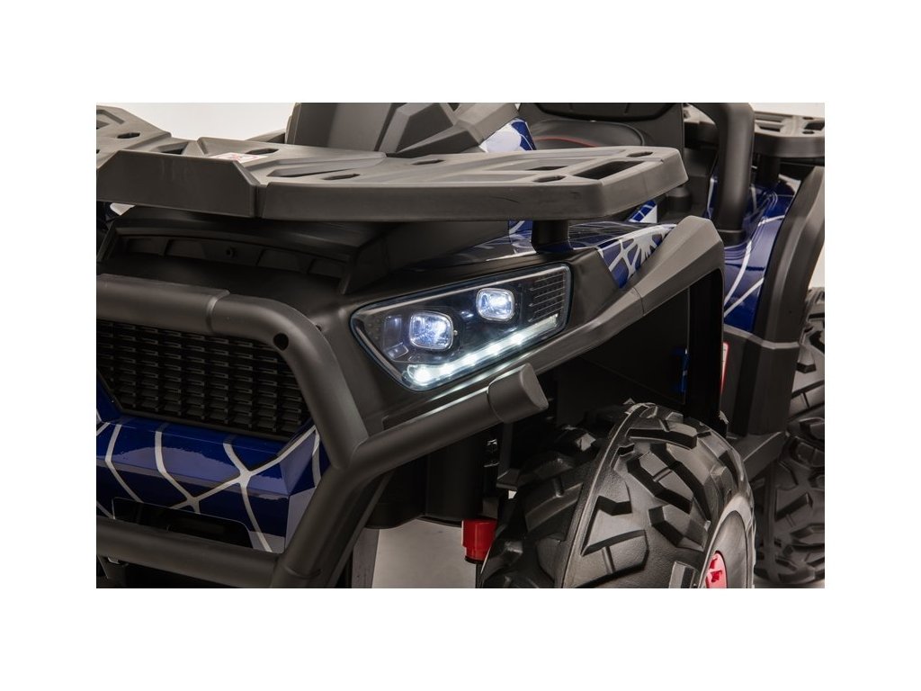 Детско акумулаторно атв 4x4 Spyder боядисано синьо се отличава с 4 мощни мотора, батерия 12V 10Ah и с богато допълнително оборудване. Детето сяда върху меко седло от еко кожа, а пътуването се радва на музика, която може да пуснете чрез USB, SD или MP3 вход. За излизане в неравен терен скоростта е от 3 до 8 км/ч, а максималната товароносимост на атв-то е до 50 кг. Атвето разполага с един газов педал и при отпускането му спира автоматично.